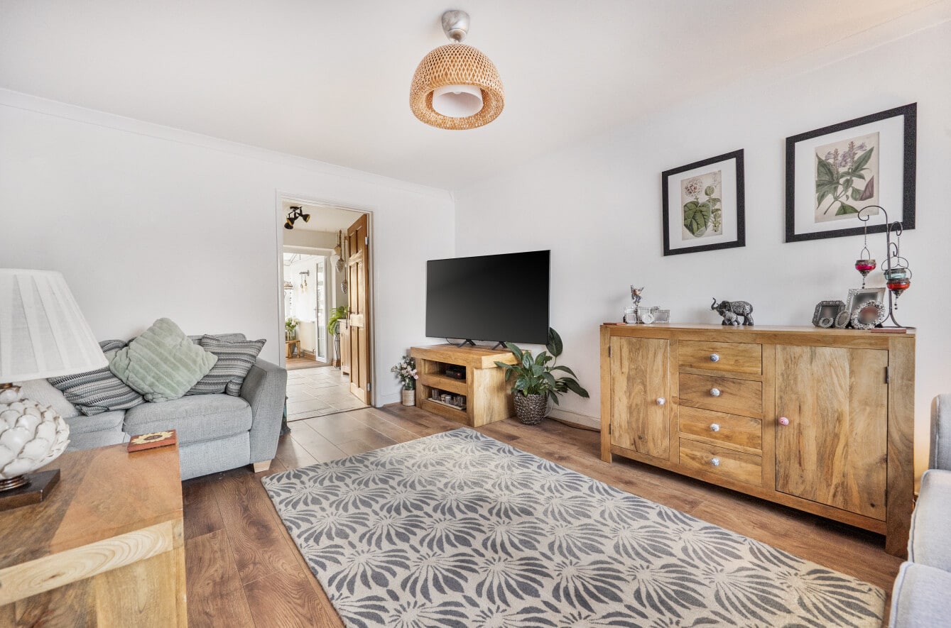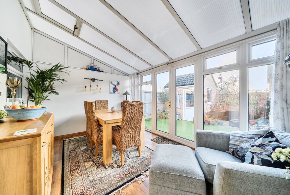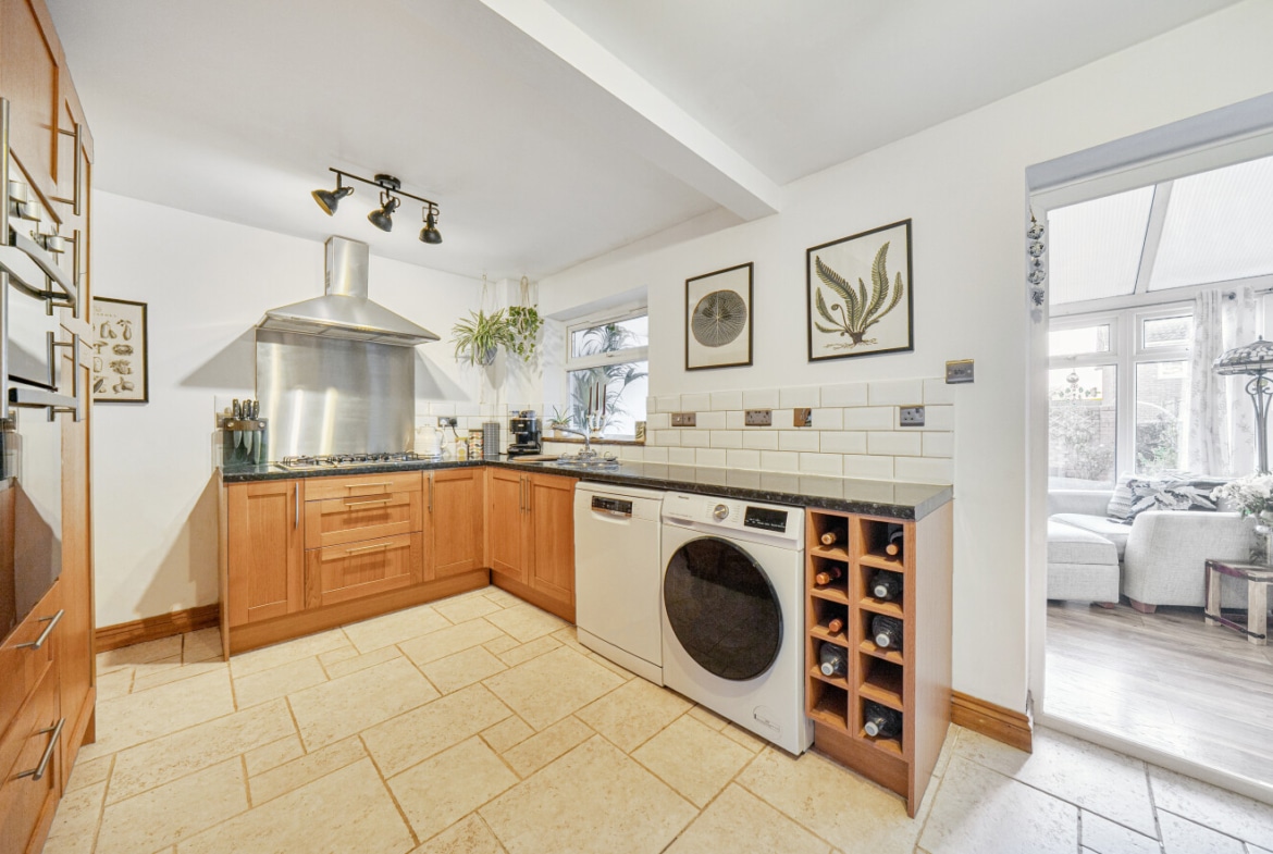 To the front is a generous lounge, offering ample space for a range of furnishings. Positioned to the rear of the lounge is a well-appointed kitchen, featuring a charming wooden kitchen with plentiful cupboard space. From the kitchen, doors lead into the conservatory, which provides a versatile additional living space and is currently used as a second reception room and dining area, with direct access to the rear garden.