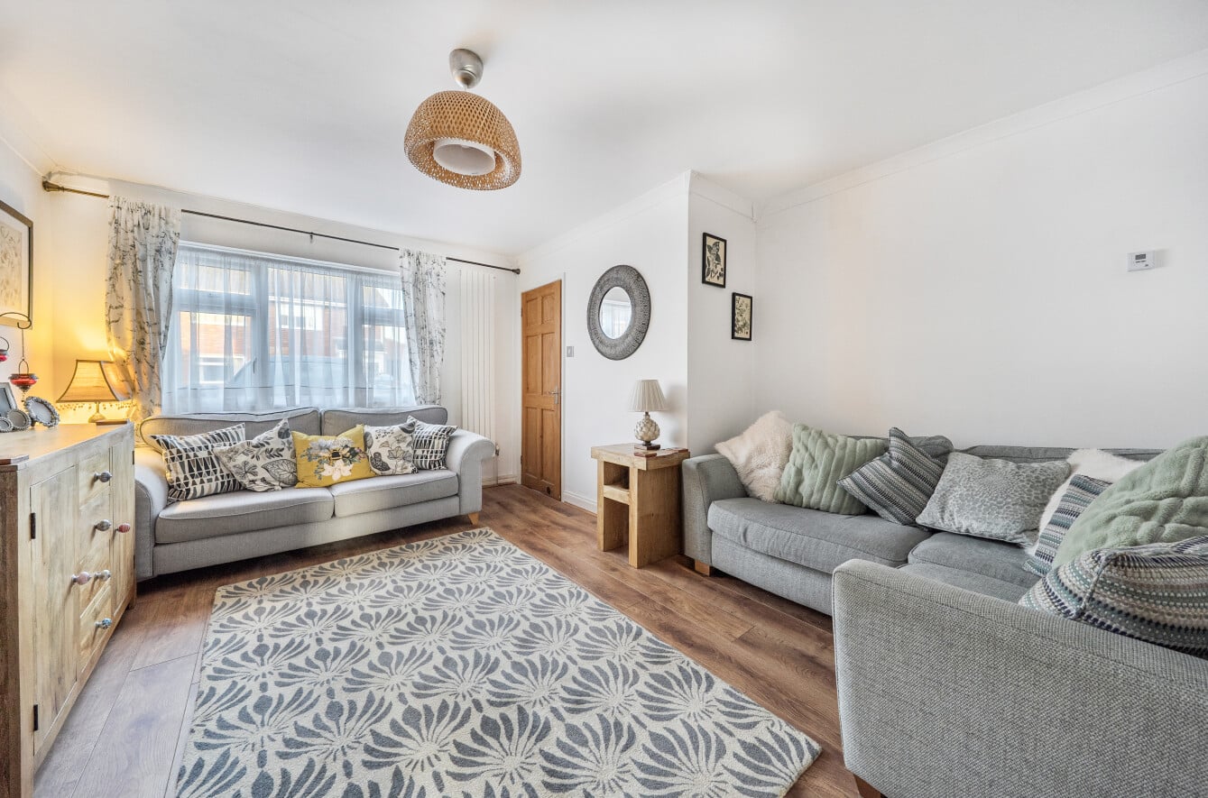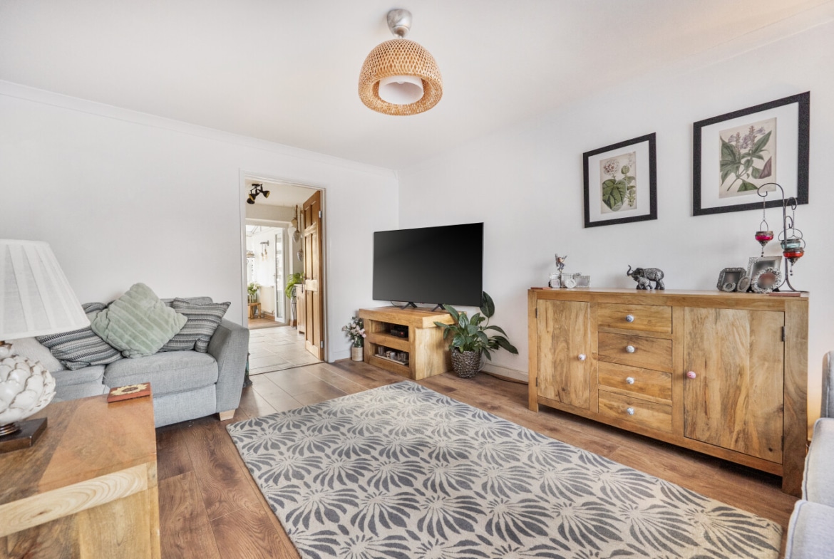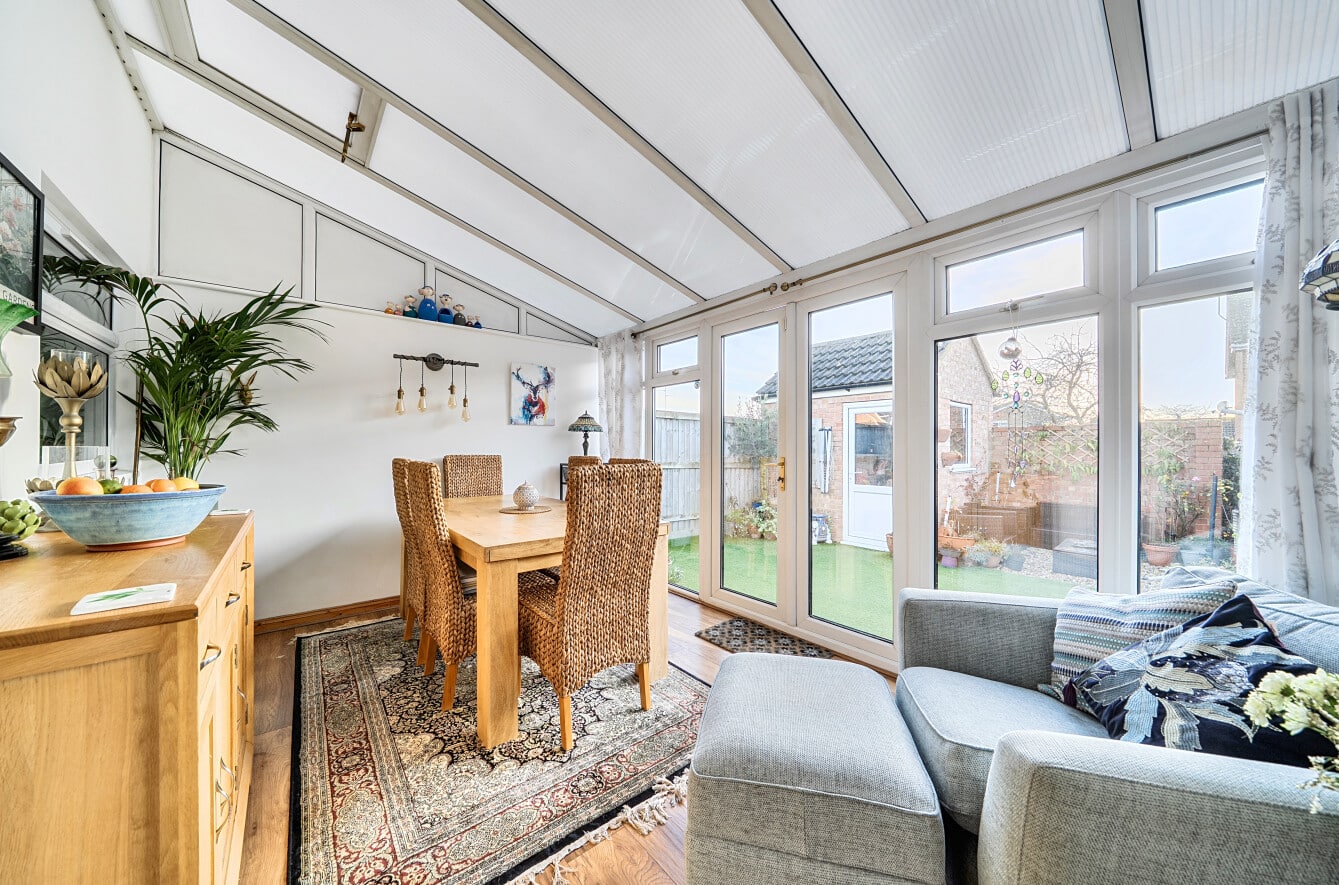 To the front is a generous lounge, offering ample space for a range of furnishings. Positioned to the rear of the lounge is a well-appointed kitchen, featuring a charming wooden kitchen with plentiful cupboard space. From the kitchen, doors lead into the conservatory, which provides a versatile additional living space and is currently used as a second reception room and dining area, with direct access to the rear garden.