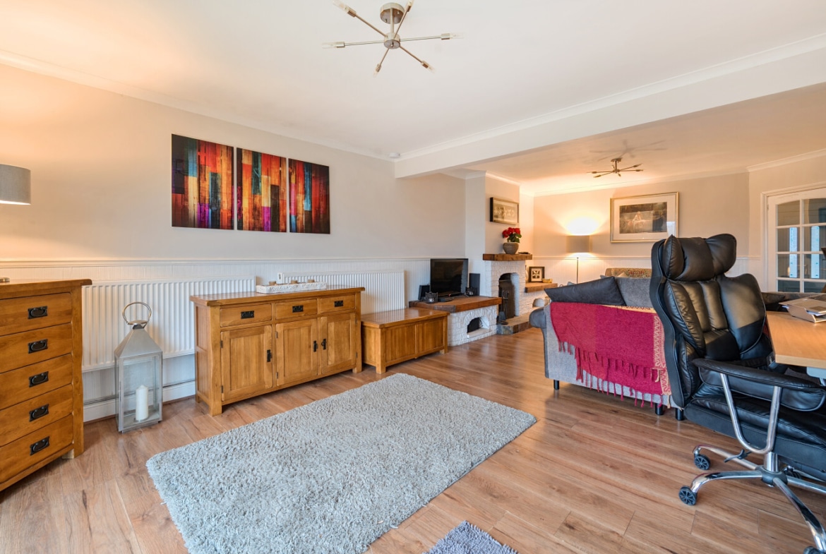 From the moment you step inside, the bright and welcoming lounge sets the tone, offering a comfortable retreat for family evenings or entertaining guests. The room also benefits from a working log burner, perfect for the winter months.