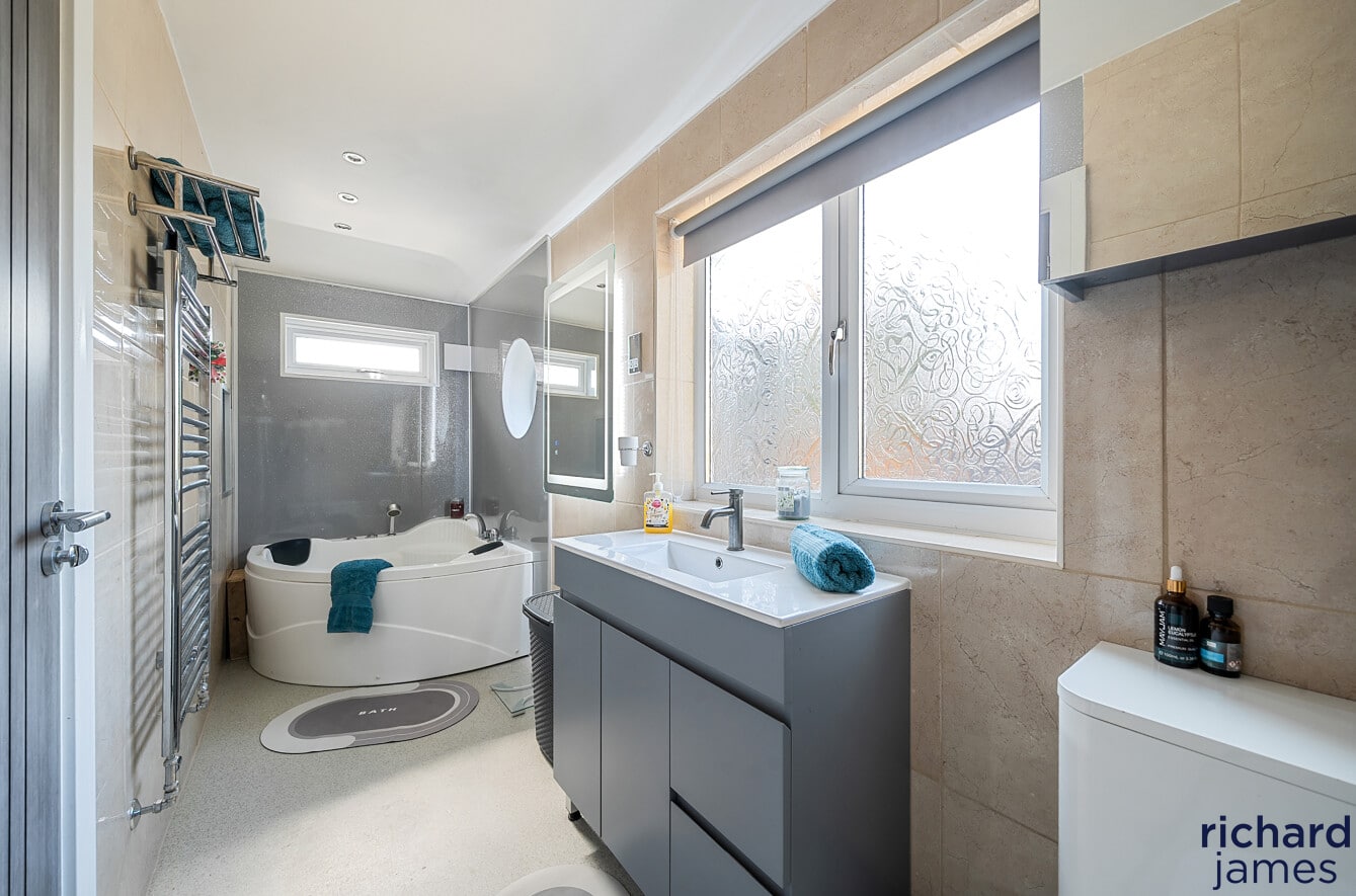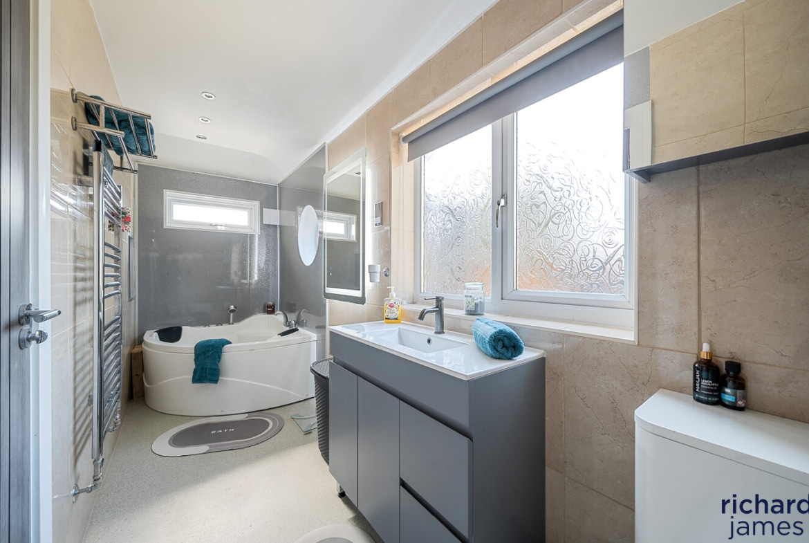 The ground floor living accommodation comprises; a generous entrance porch, light and airy entrance hall, a ground floor bathroom with corner style jacuzzi bathtub and feature port hole window, a bay fronted third bedroom, the living room which is open to the extended dining room plus a modern extended kitchen that offers excellent space.