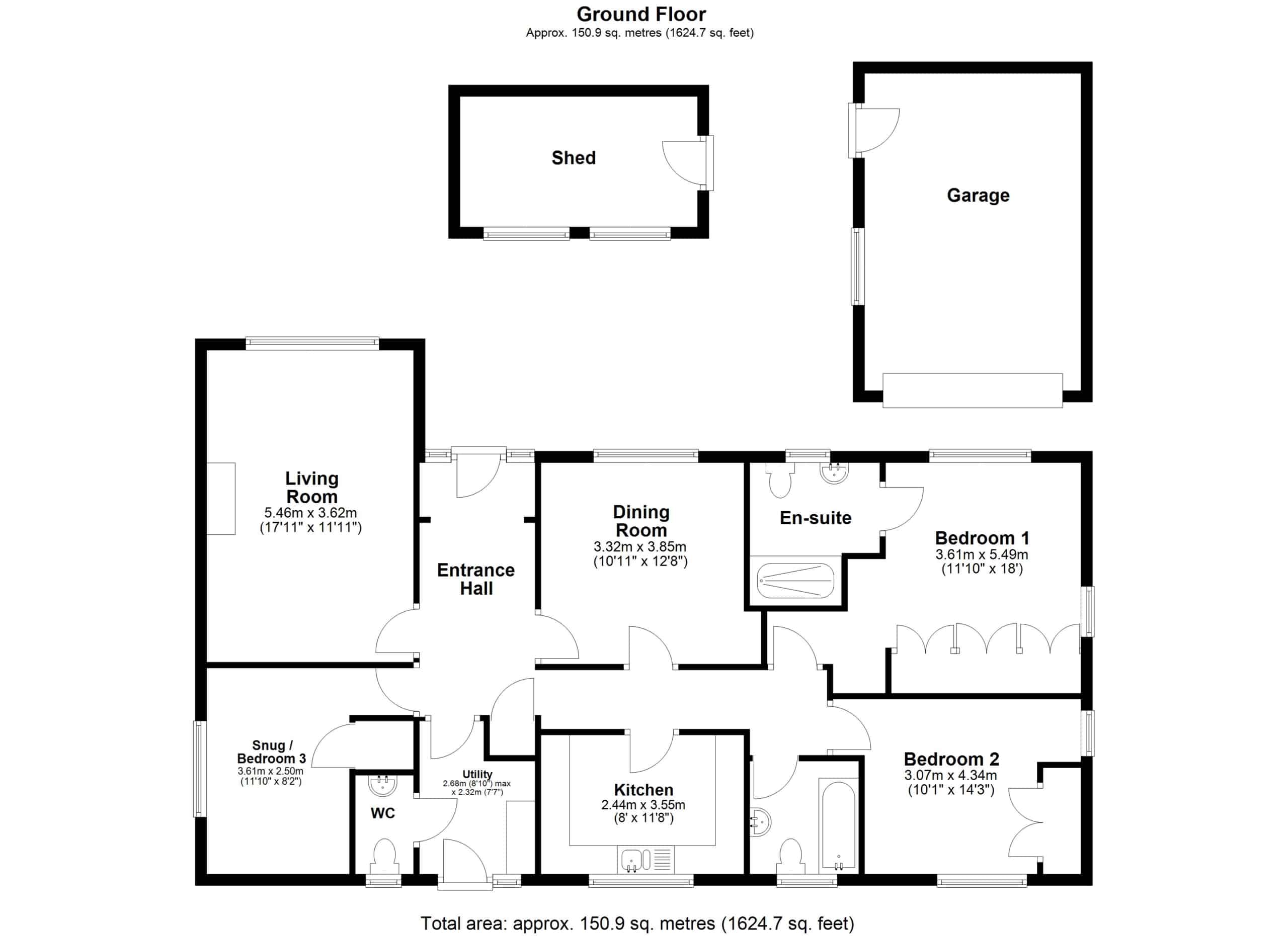 The bungalow offers three well-proportioned bedrooms. The principal bedroom benefits from fitted wardrobes and a calm, restful atmosphere, while the remaining bedrooms are equally versatile, lending themselves perfectly to guest accommodation, a home office or hobby room. A well-presented family bathroom serves the home, complemented by a separate shower room, providing added practicality and flexibility.