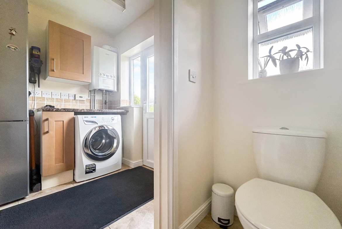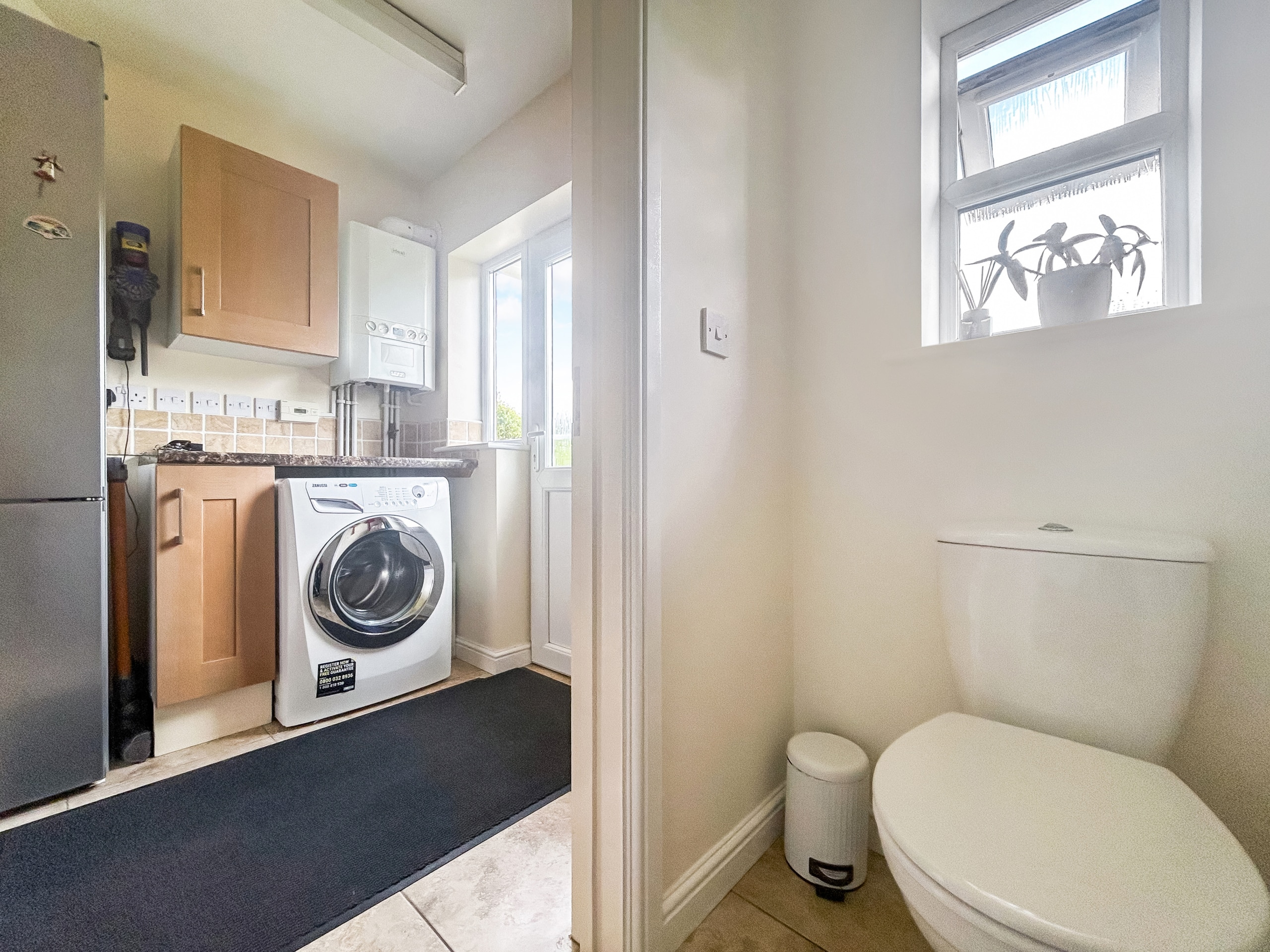 The kitchen is well appointed with a range of fitted wall and base units, generous work surfaces and integrated appliances, all complemented by a pleasant outlook to the rear. A useful adjoining utility room provides additional storage and appliance space, along with access to a convenient cloakroom, ideal for busy households.