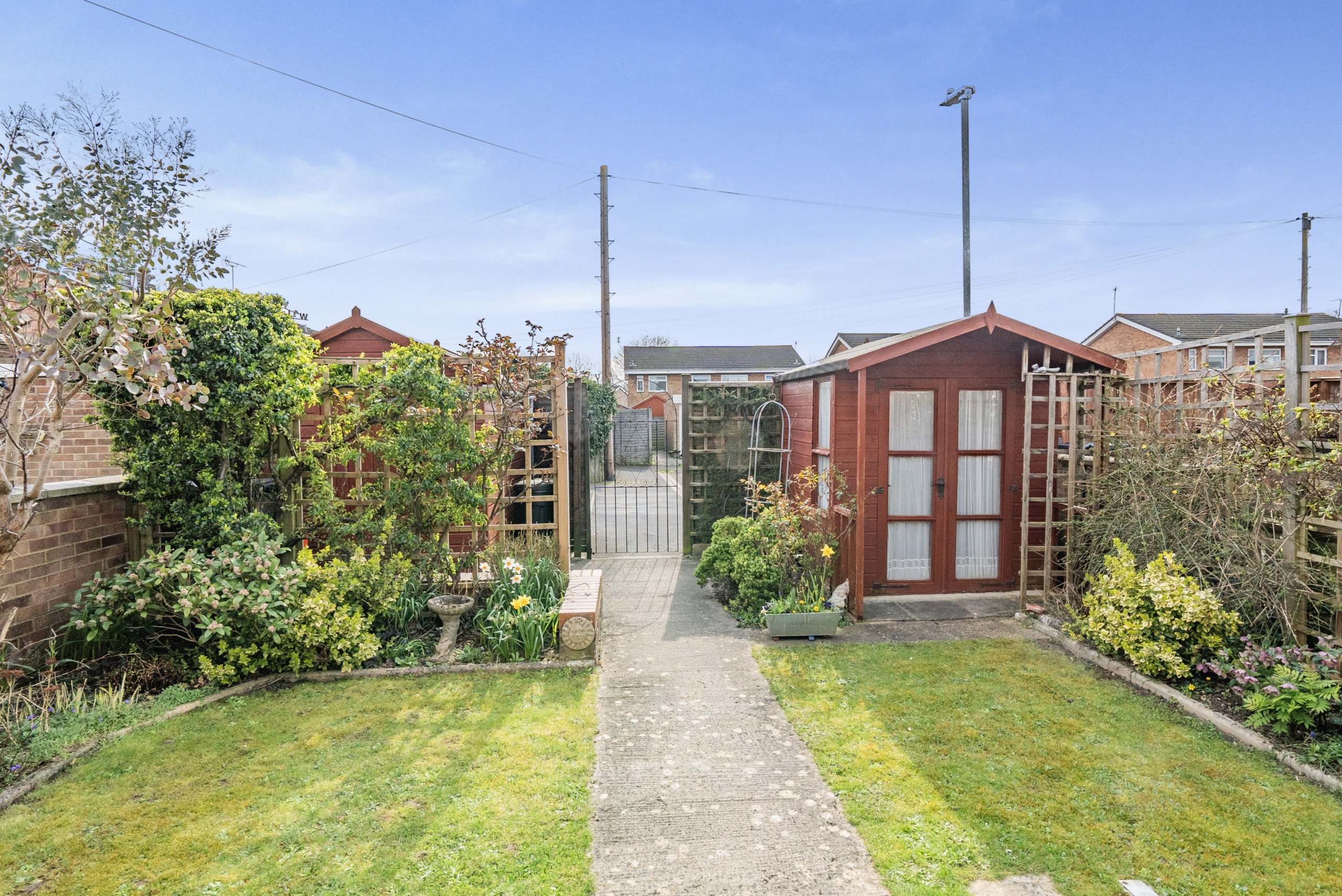 The private rear garden is a great outdoor space, featuring two handy storage sheds and a garage with additional parking at the rear.