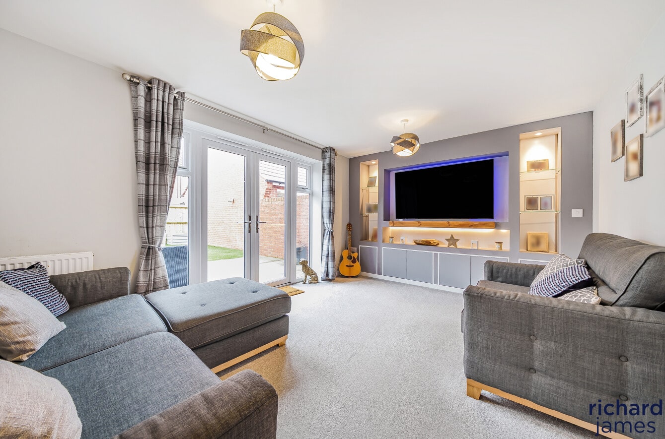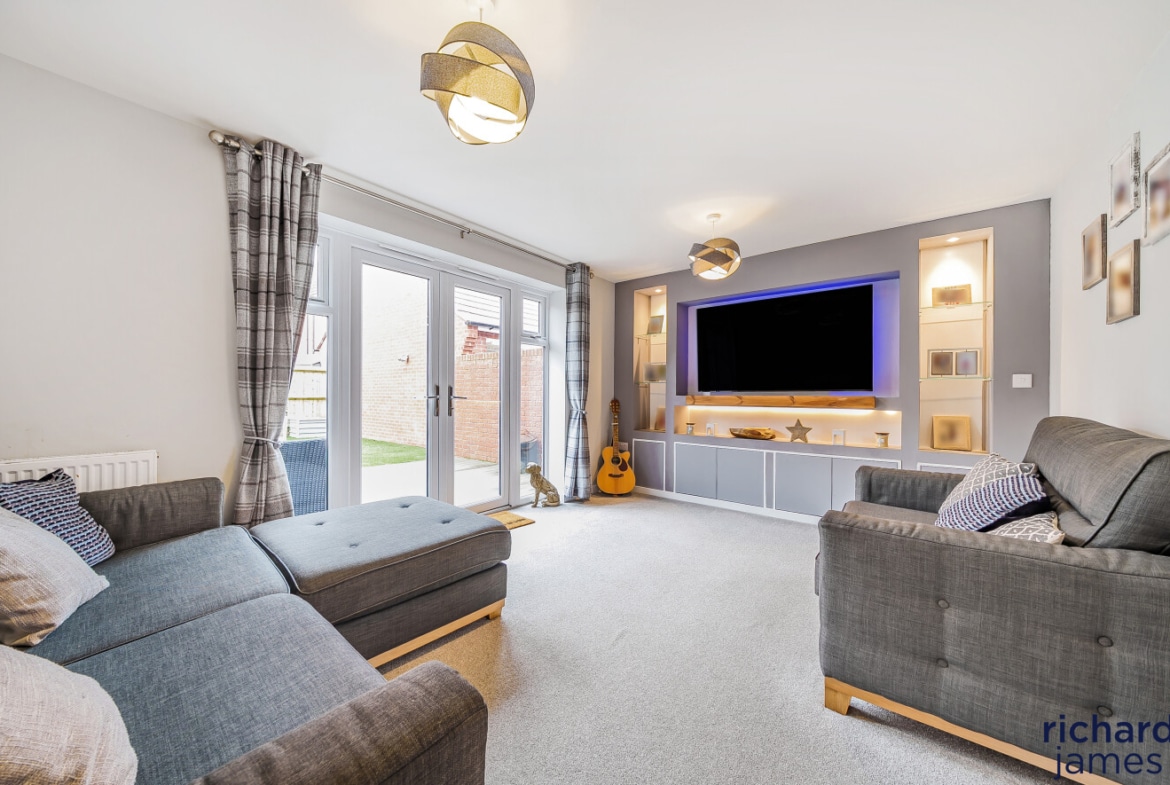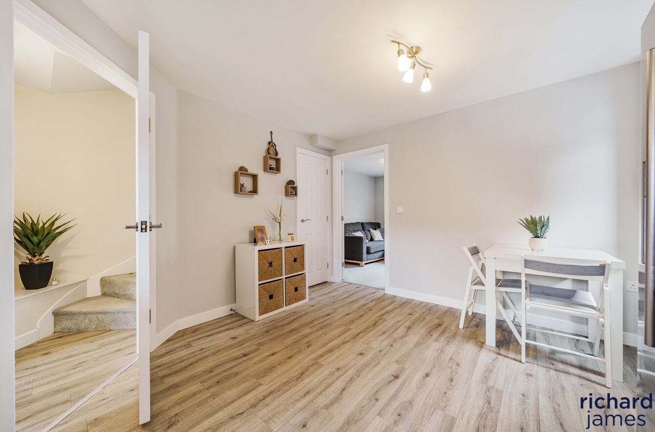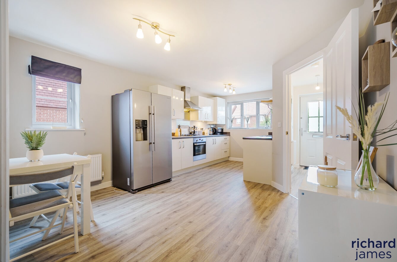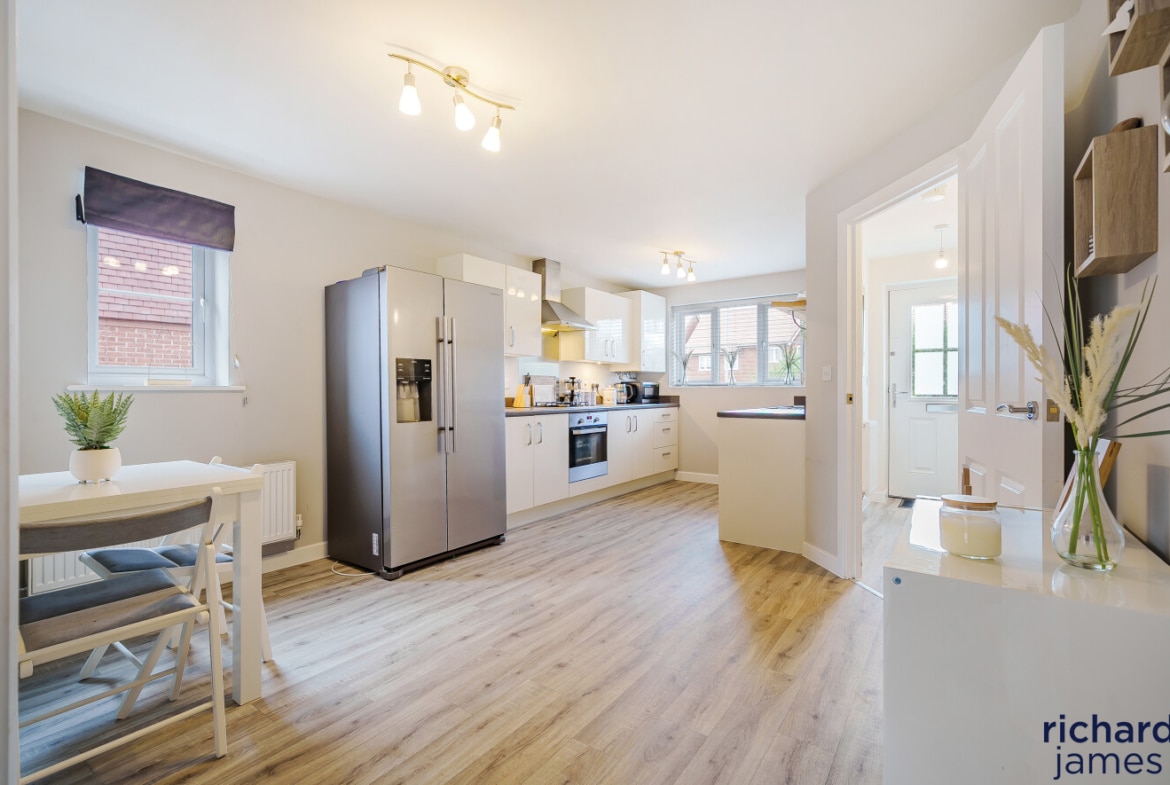 On entry, you’ll find a bright hallway with a convenient WC. The kitchen/diner is a real standout, offering modern finishes and ample space for family dining. To the rear, the full-width sitting room overlooks the garden through French doors, flooding the space with natural light.