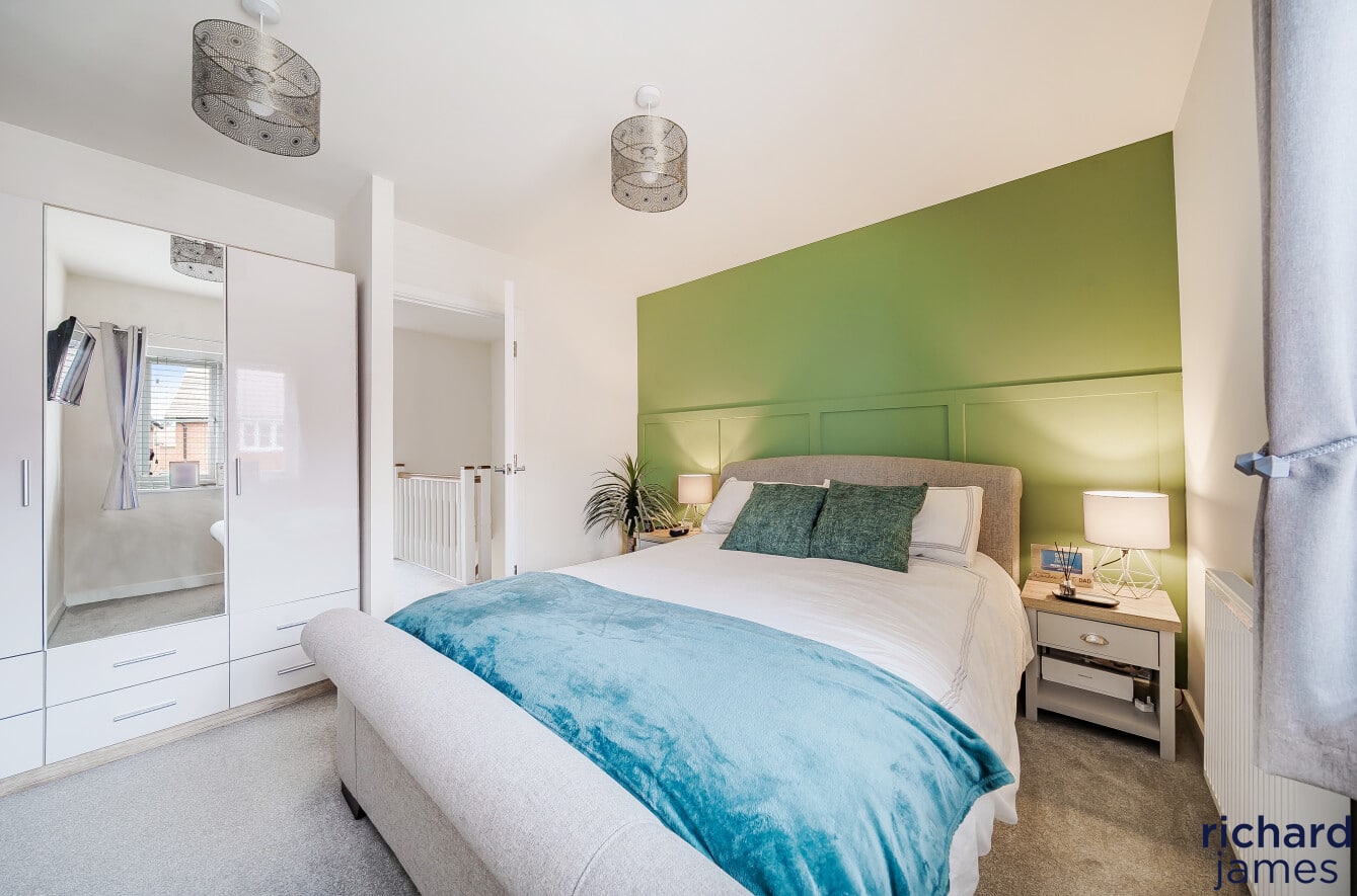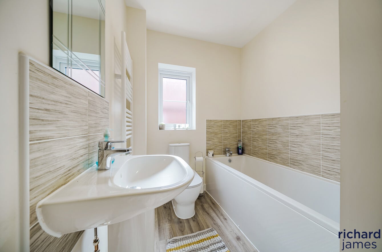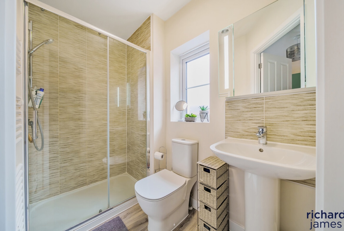 Upstairs, there are three well-proportioned bedrooms, with the master bedroom benefiting from fitted wardrobes and an updated en-suite shower room. The family bathroom is modern and well-appointed, serving the remaining bedrooms.