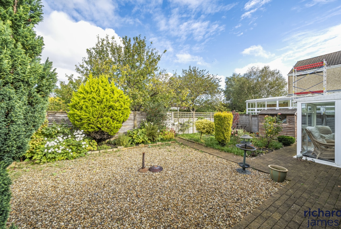 Outside, the property offers a large driveway to the front, providing ample parking, and a low-maintenance rear garden laid to stones and patio, with some mature shrubs adding a touch of greenery.