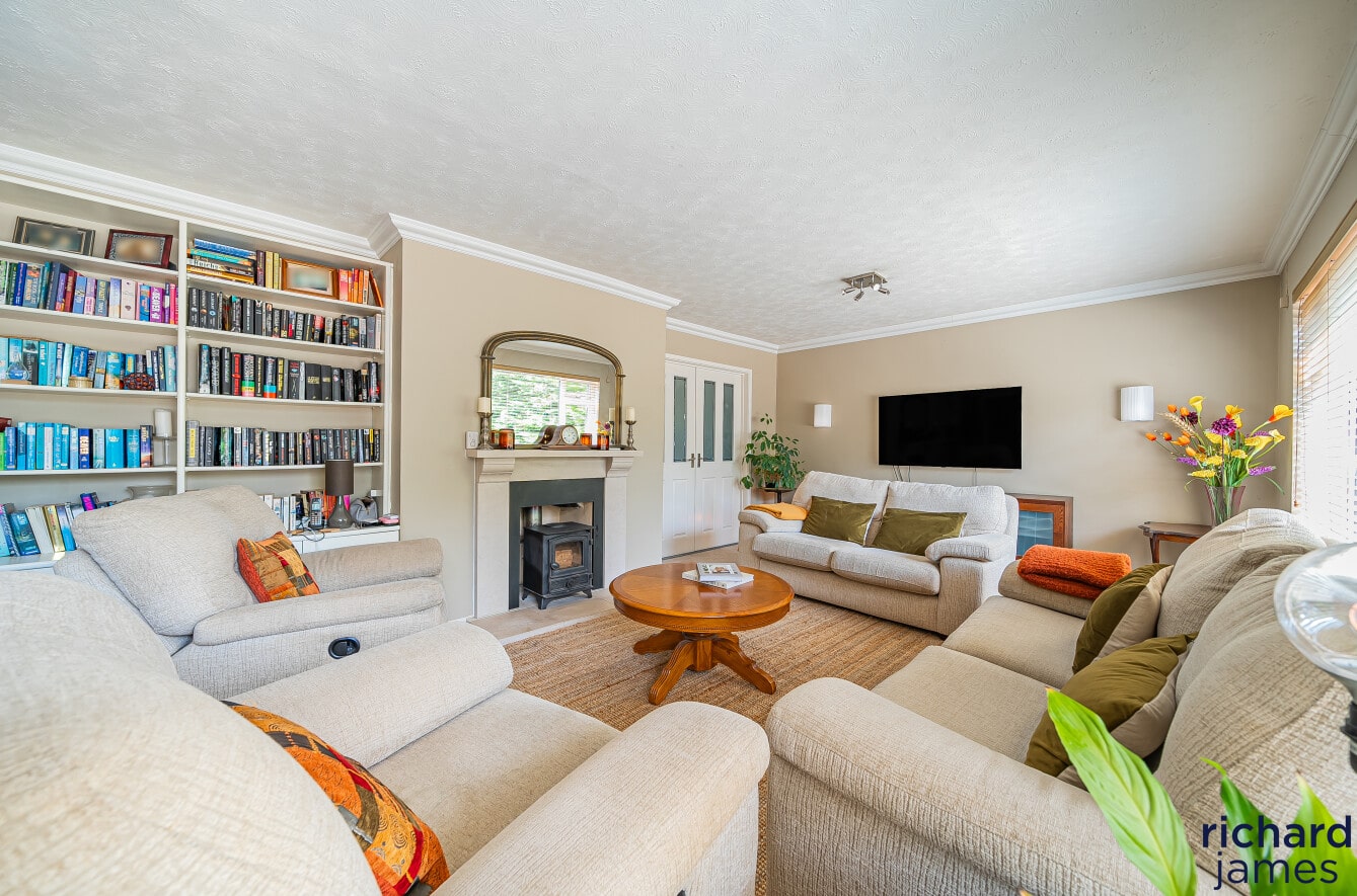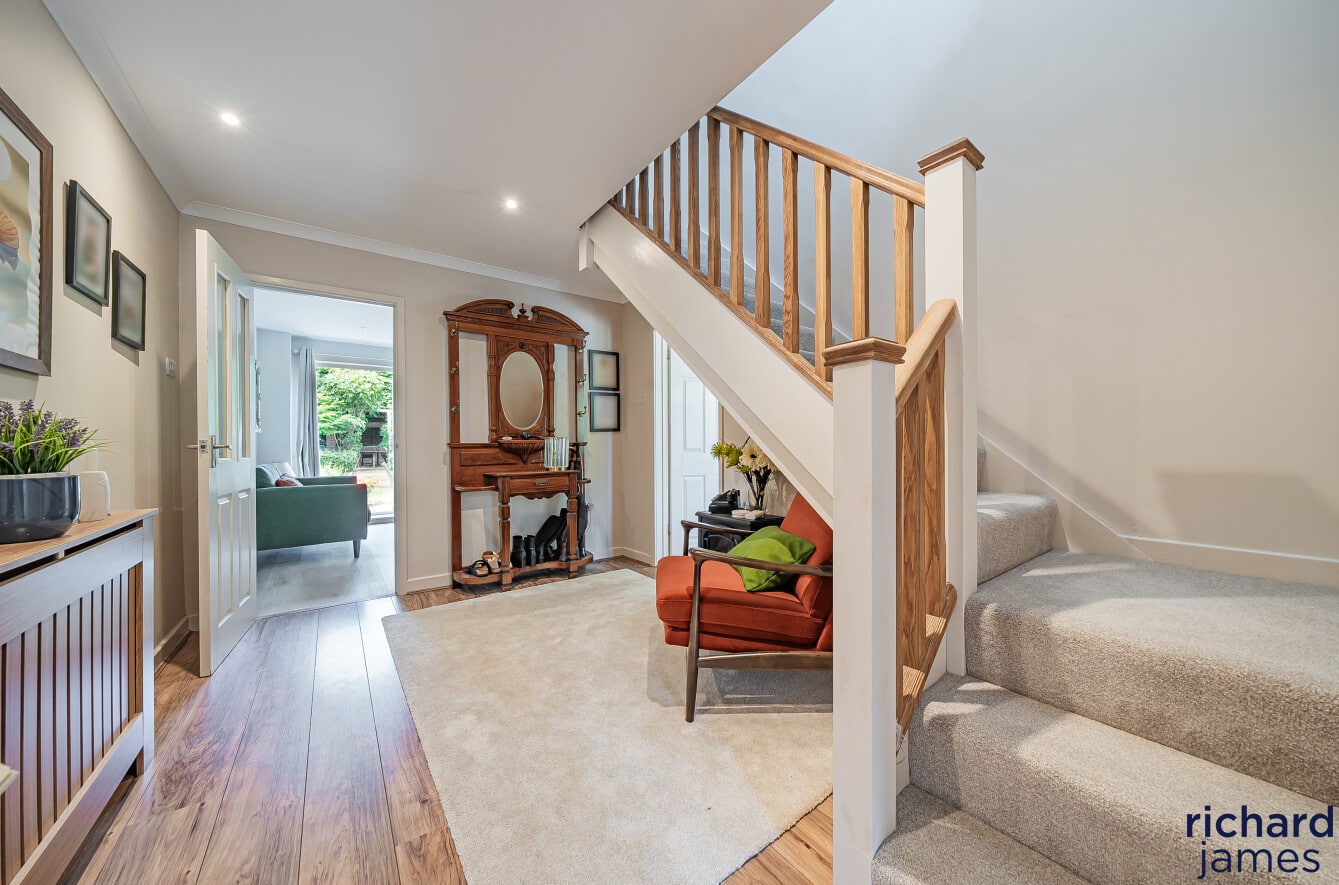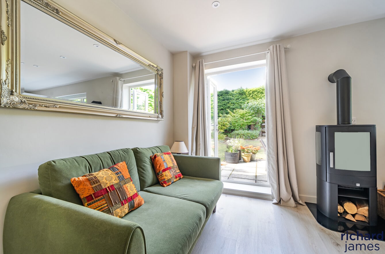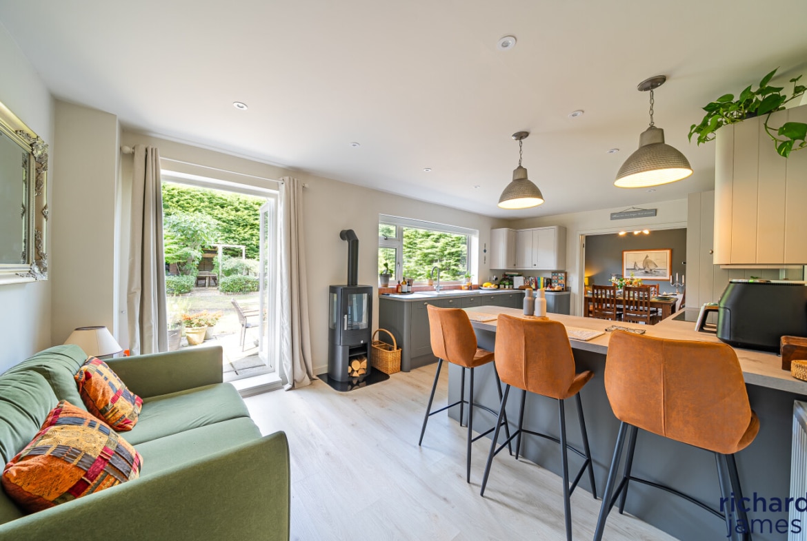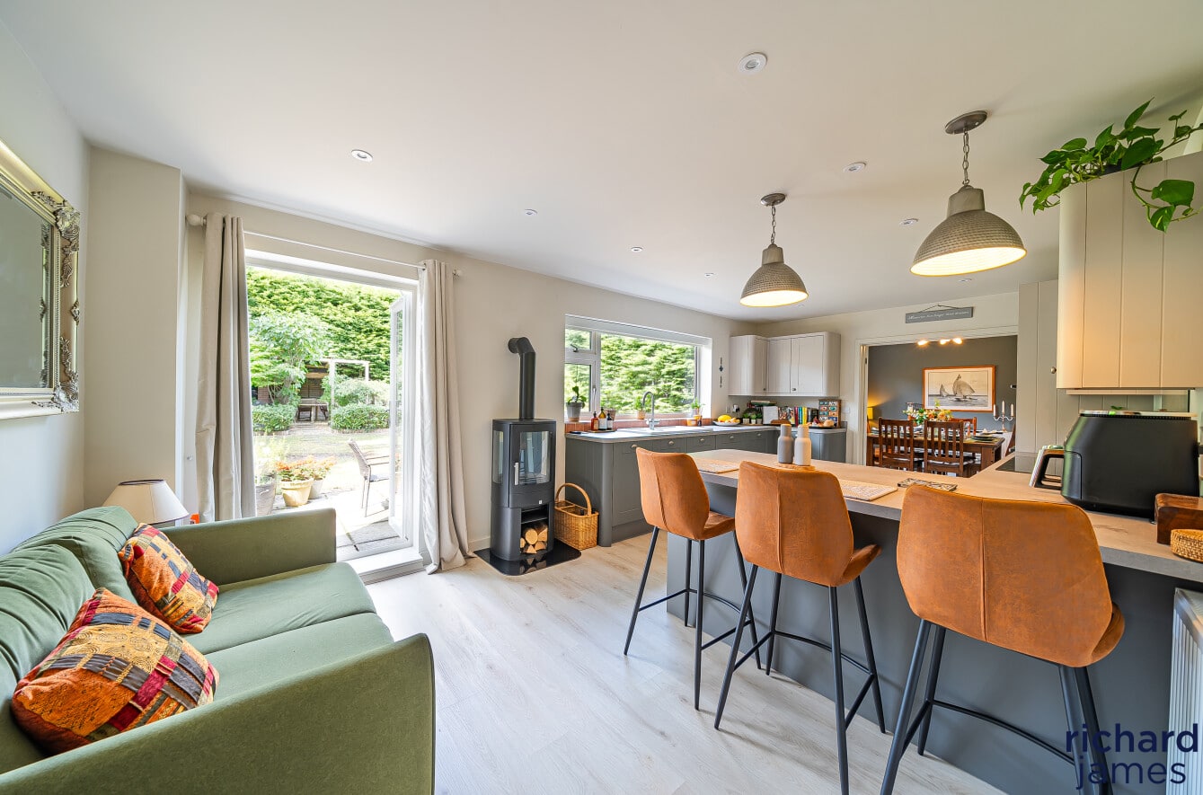 Upon entering, you are greeted by a spacious entrance hall leading to a cosy lounge, which is adorned with a wood burner and built-in bookcases—ideal for relaxing evenings. The newly renovated kitchen, complete with integrated NEFF and AEG appliances, flows seamlessly into the garden. Additionally, a modern, separate utility room with built-in appliances enhances the convenience of this well-appointed space.