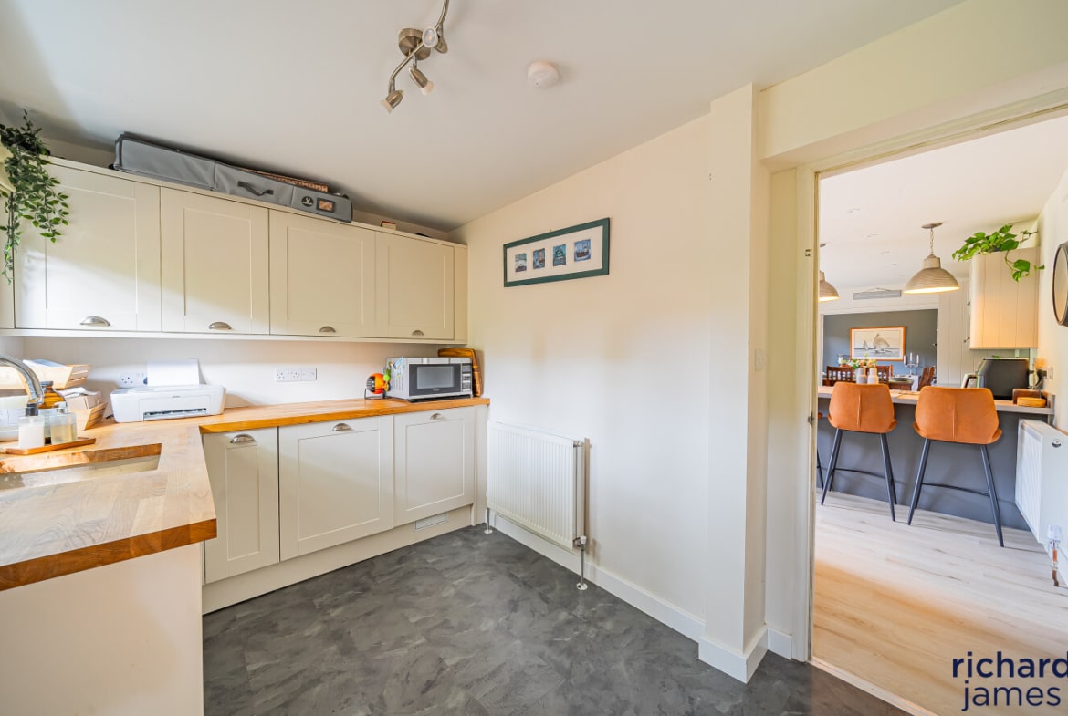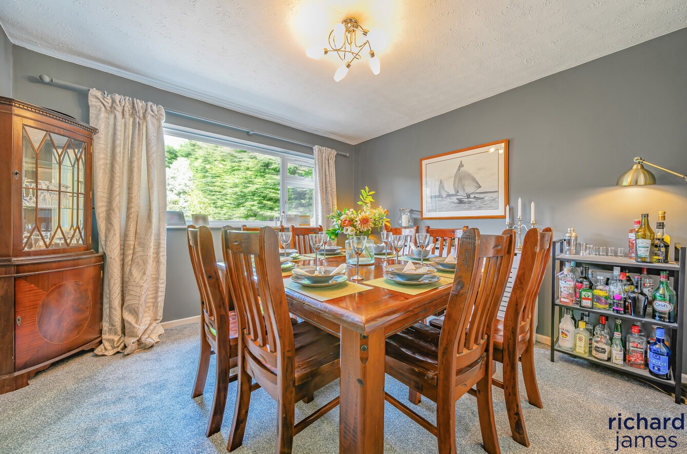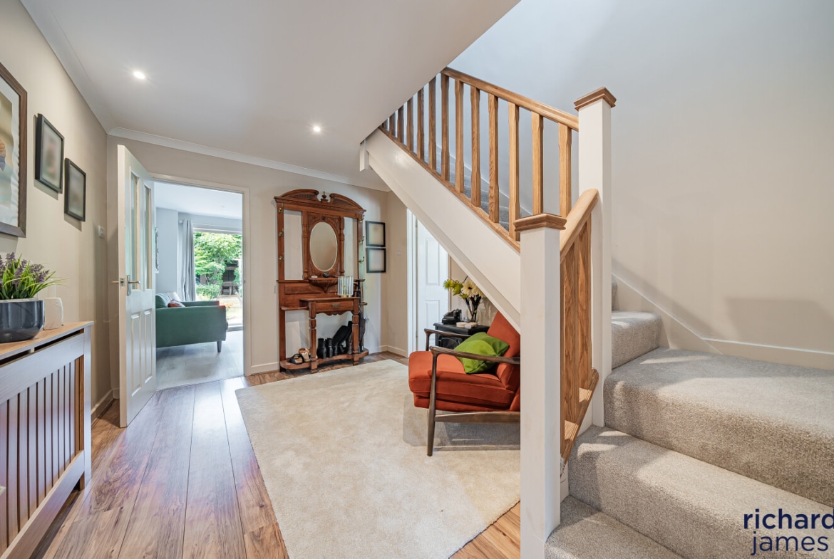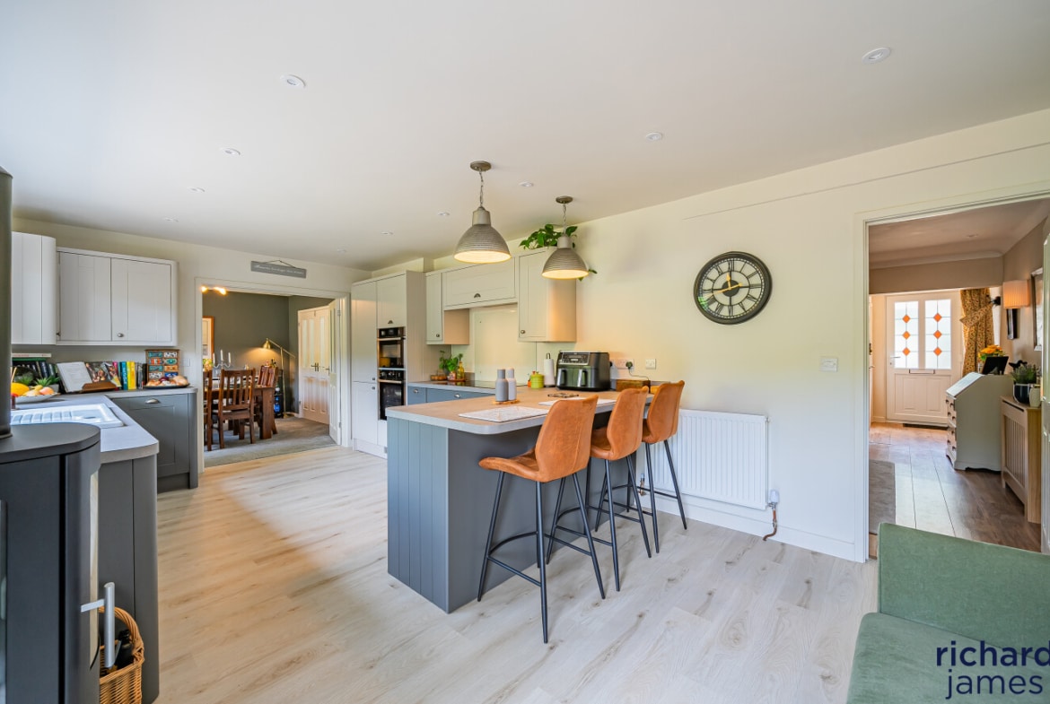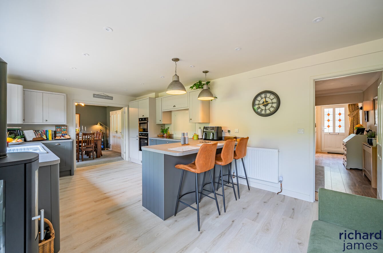 Upon entering, you are greeted by a spacious entrance hall leading to a cosy lounge, which is adorned with a wood burner and built-in bookcases—ideal for relaxing evenings. The newly renovated kitchen, complete with integrated NEFF and AEG appliances, flows seamlessly into the garden. Additionally, a modern, separate utility room with built-in appliances enhances the convenience of this well-appointed space.