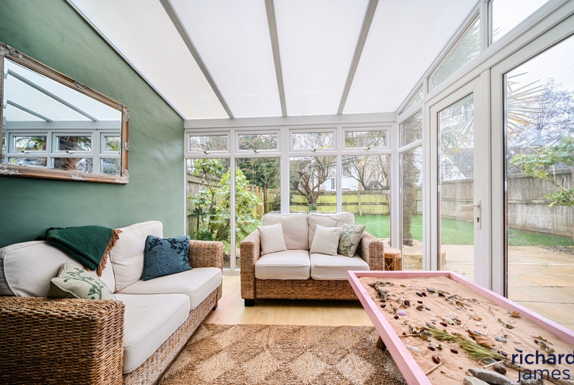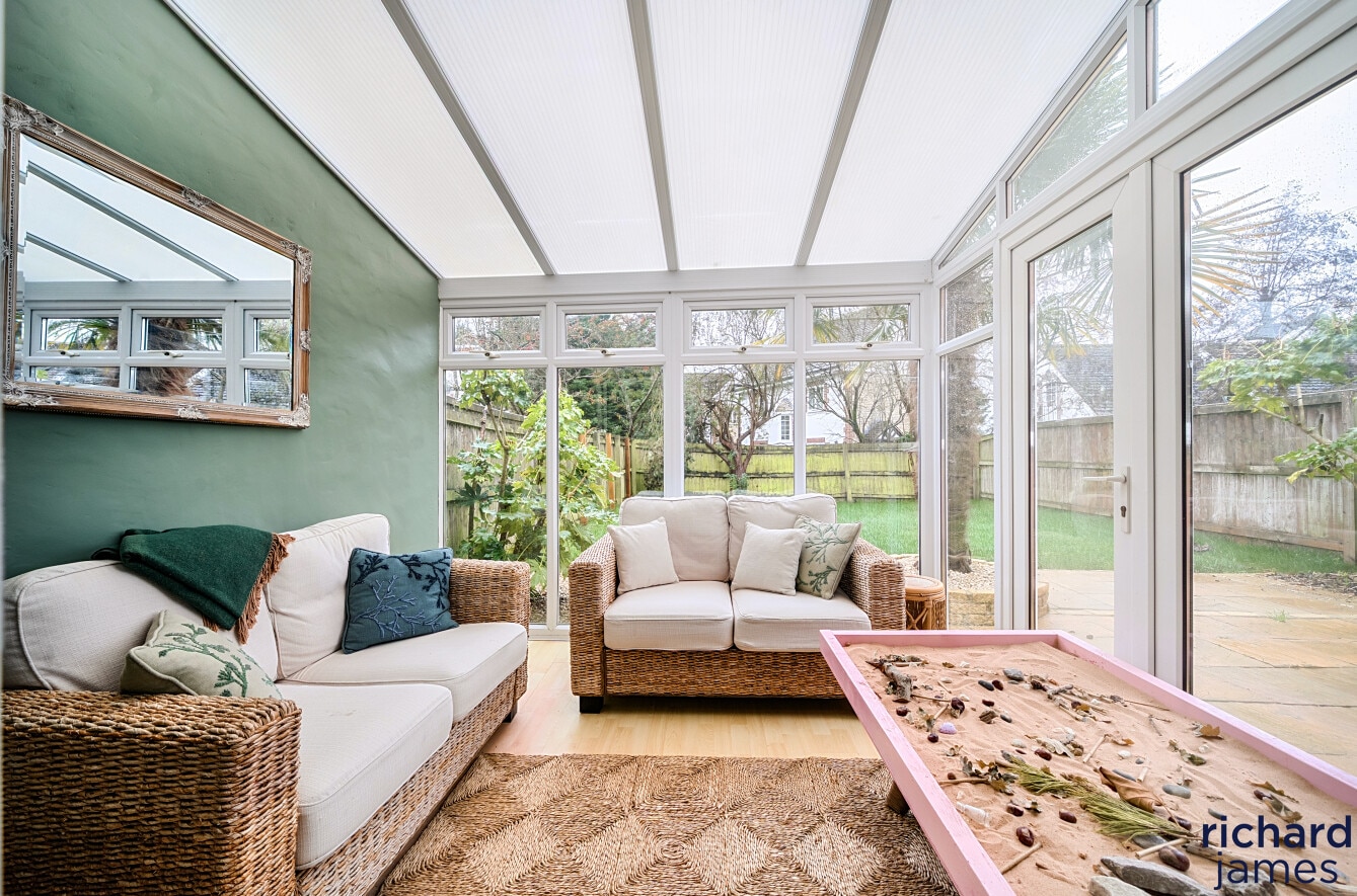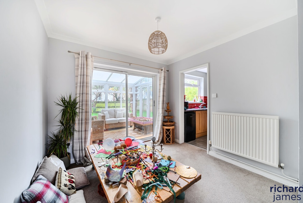 Upon entering, the bright entrance hallway leads to a spacious living room featuring a large picture window that floods the room with natural light. Beyond this is a separate dining room, perfectly placed for family meals and entertaining, with direct access to the conservatory overlooking the garden.