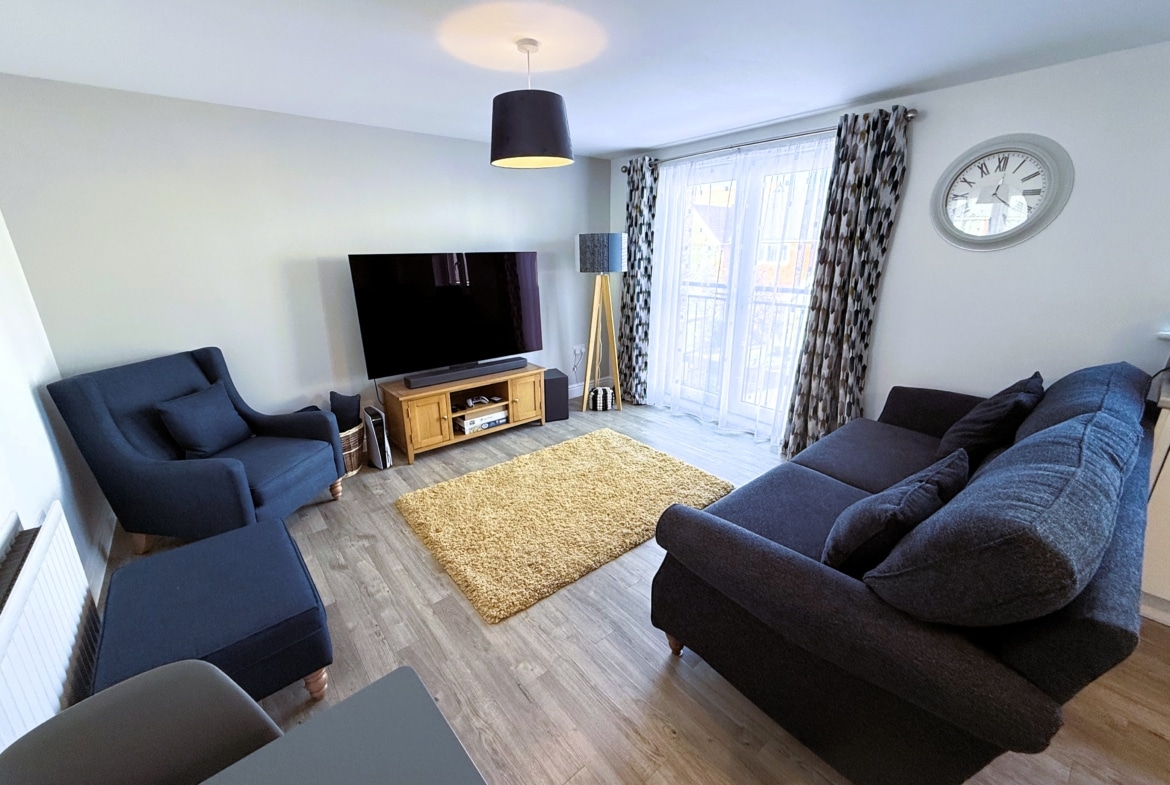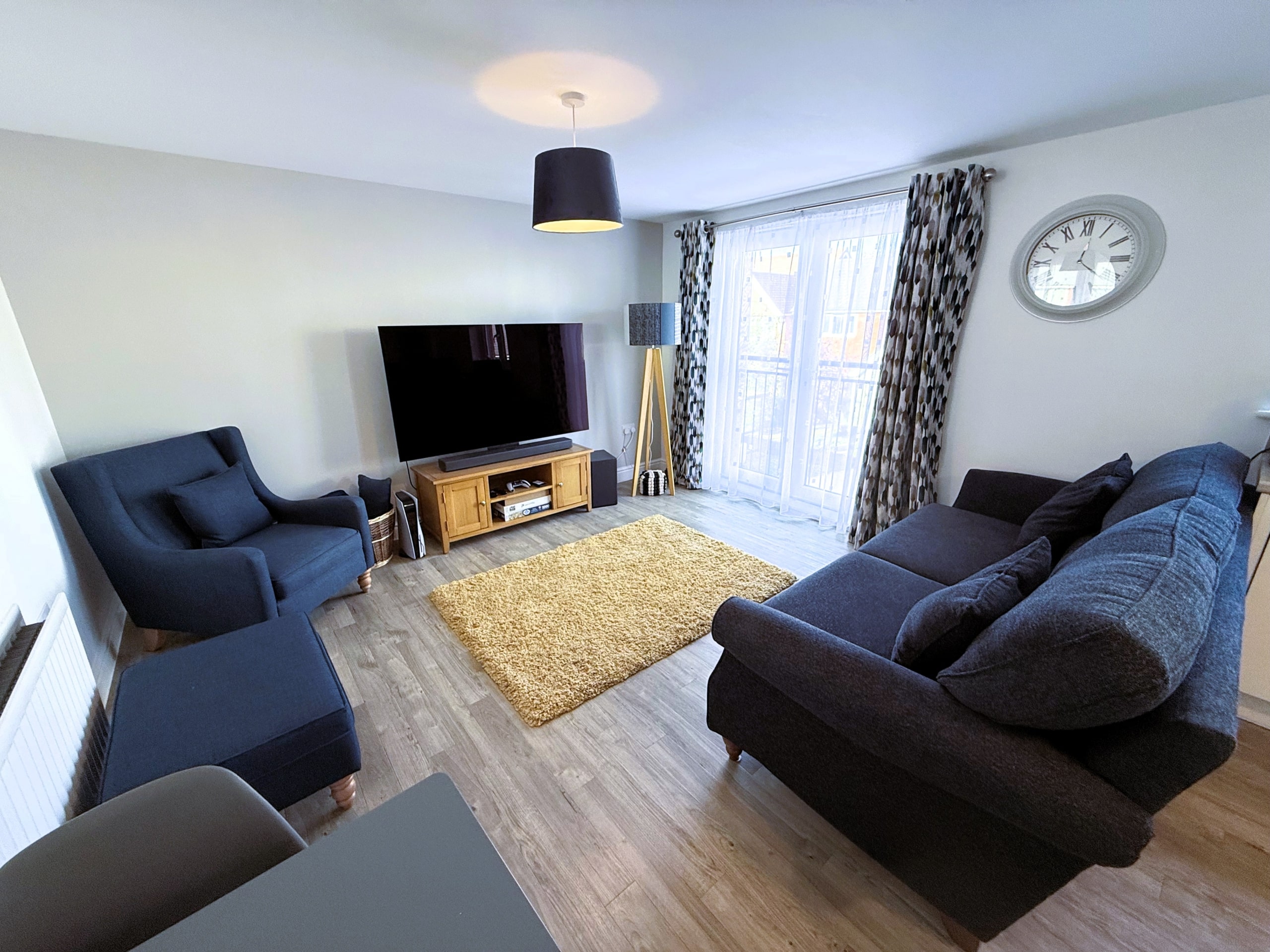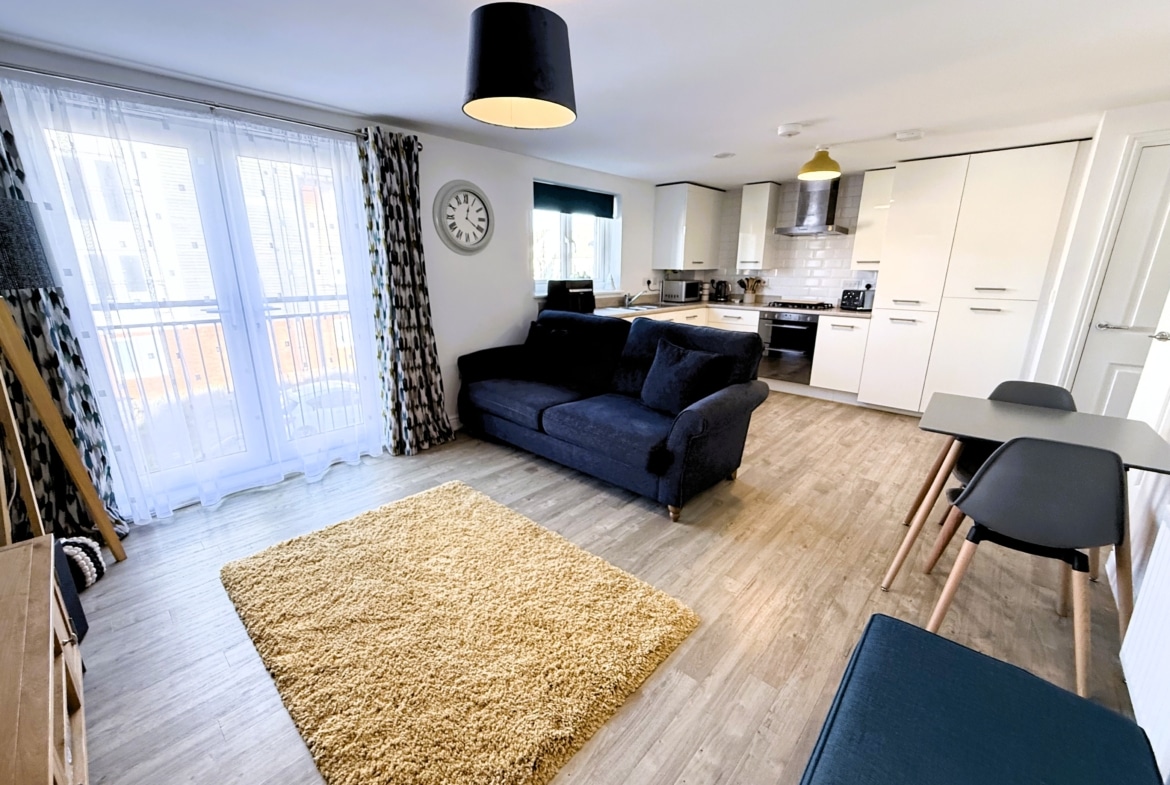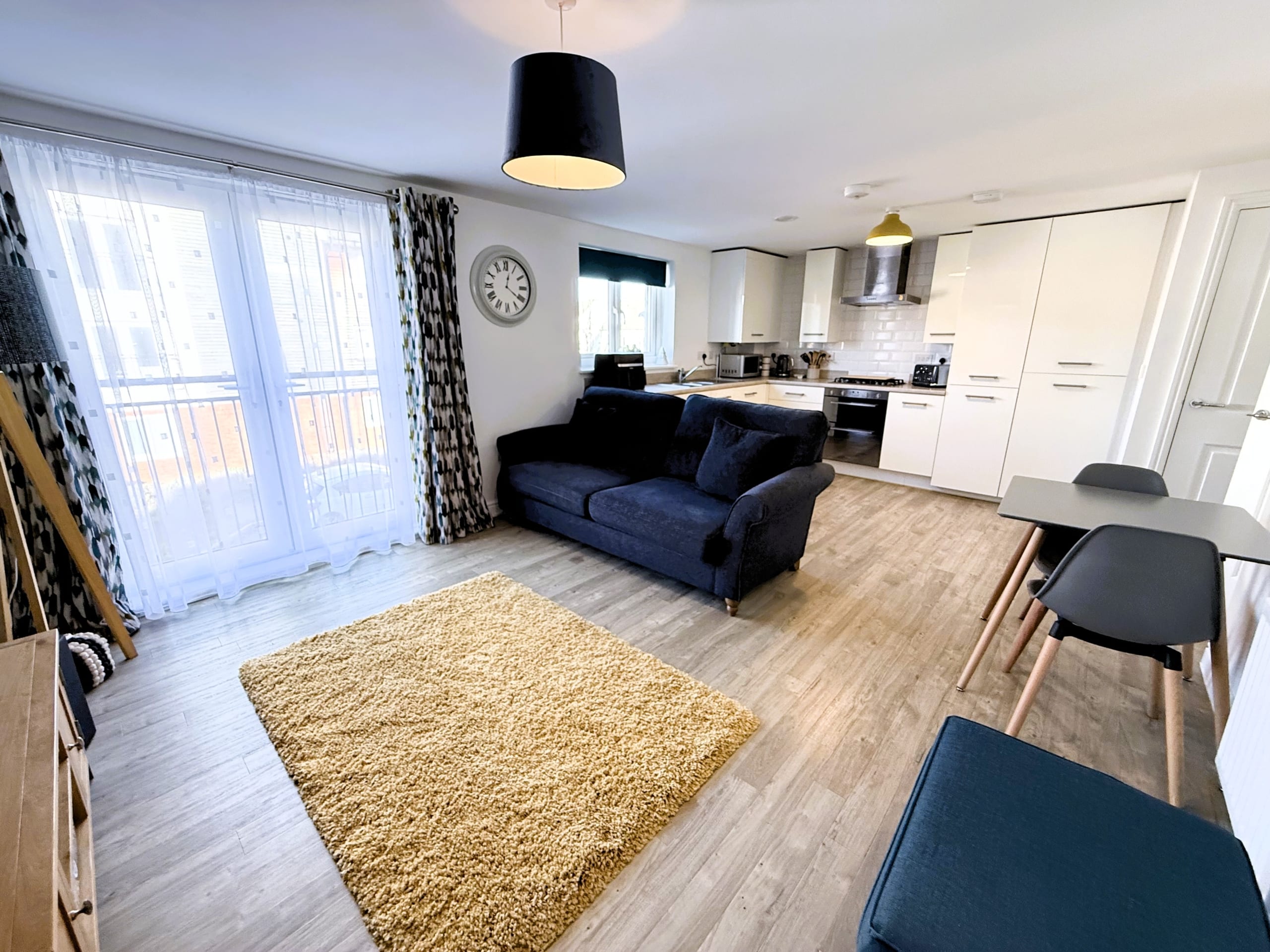 This modern apartment is located on the first floor and offers a spacious open plan feel. Immaculately presented throughout the apartment comprises: Hallway with useful Storage Cupboard, spacious 21′ open plan Living Room/Kitchen which includes Juliette Balcony and generous fitted Kitchen with integrated appliances including Fridge, Freezer, Washer/Dryer, Oven and Hob, Double Bedroom with built-in wardrobe and Bathroom, with white three piece suite.