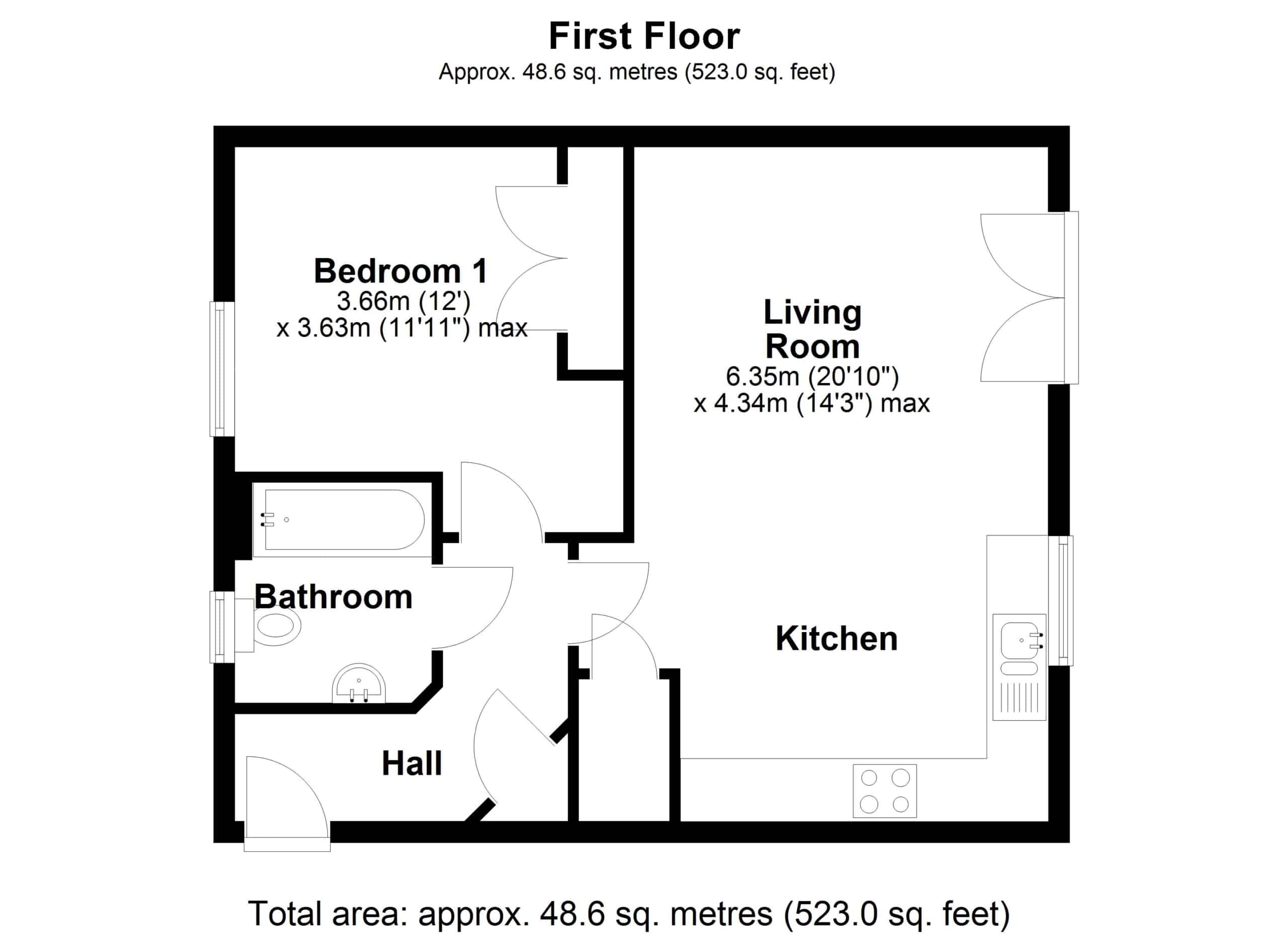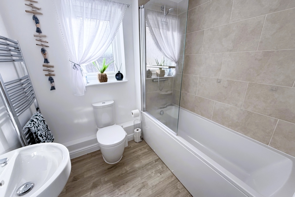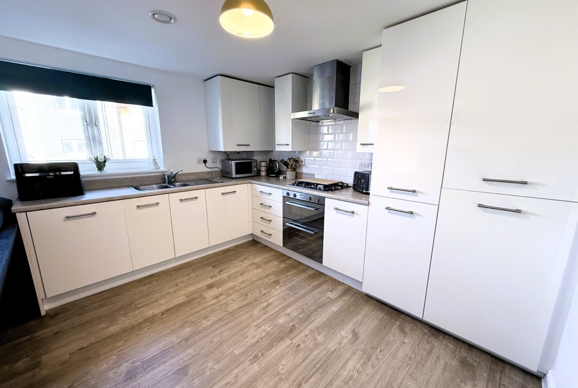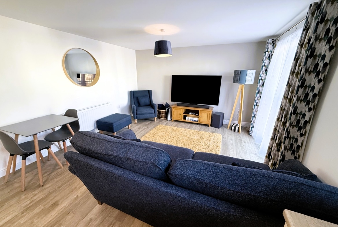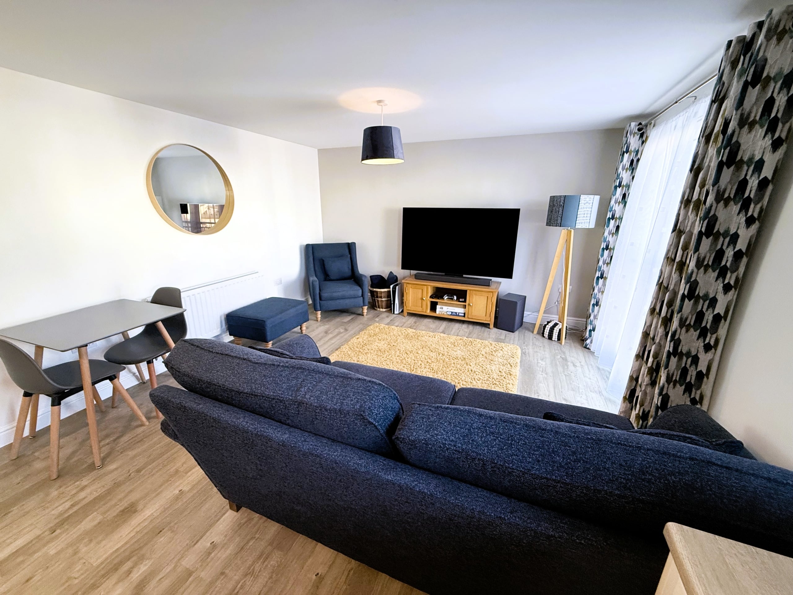 This modern apartment is located on the first floor and offers a spacious open plan feel. Immaculately presented throughout the apartment comprises: Hallway with useful Storage Cupboard, spacious 21′ open plan Living Room/Kitchen which includes Juliette Balcony and generous fitted Kitchen with integrated appliances including Fridge, Freezer, Washer/Dryer, Oven and Hob, Double Bedroom with built-in wardrobe and Bathroom, with white three piece suite.