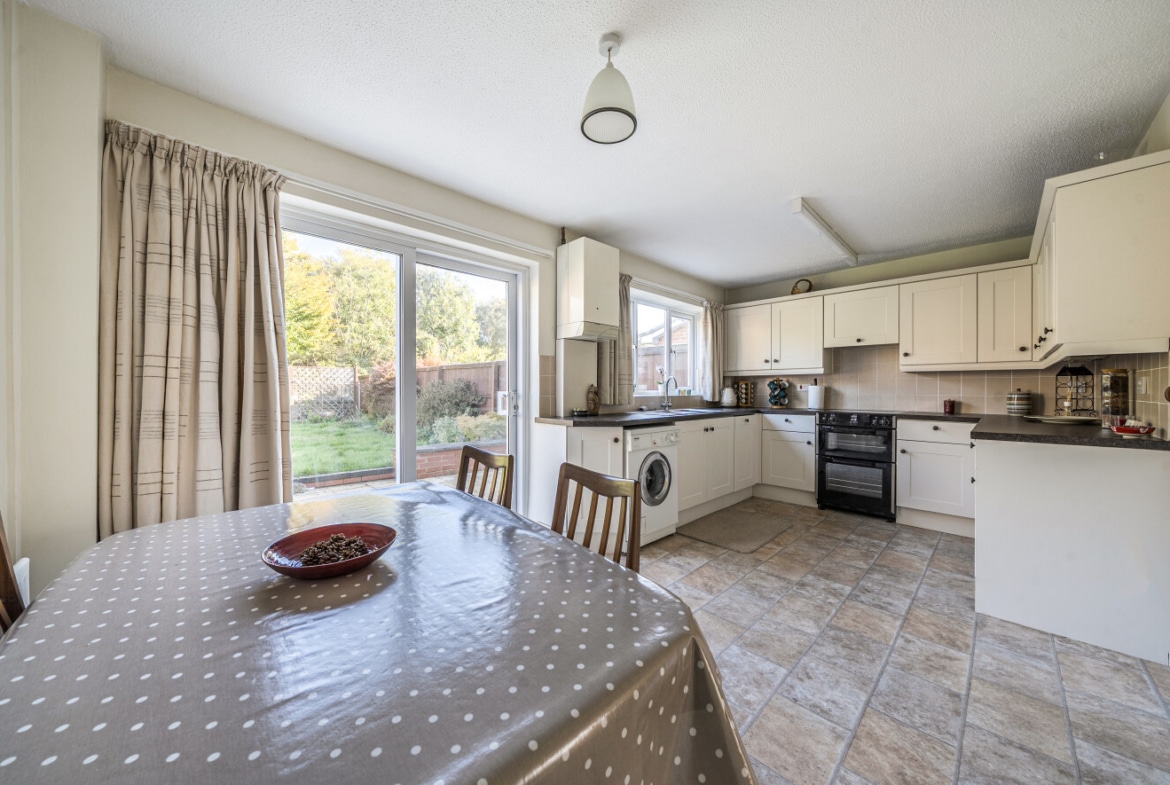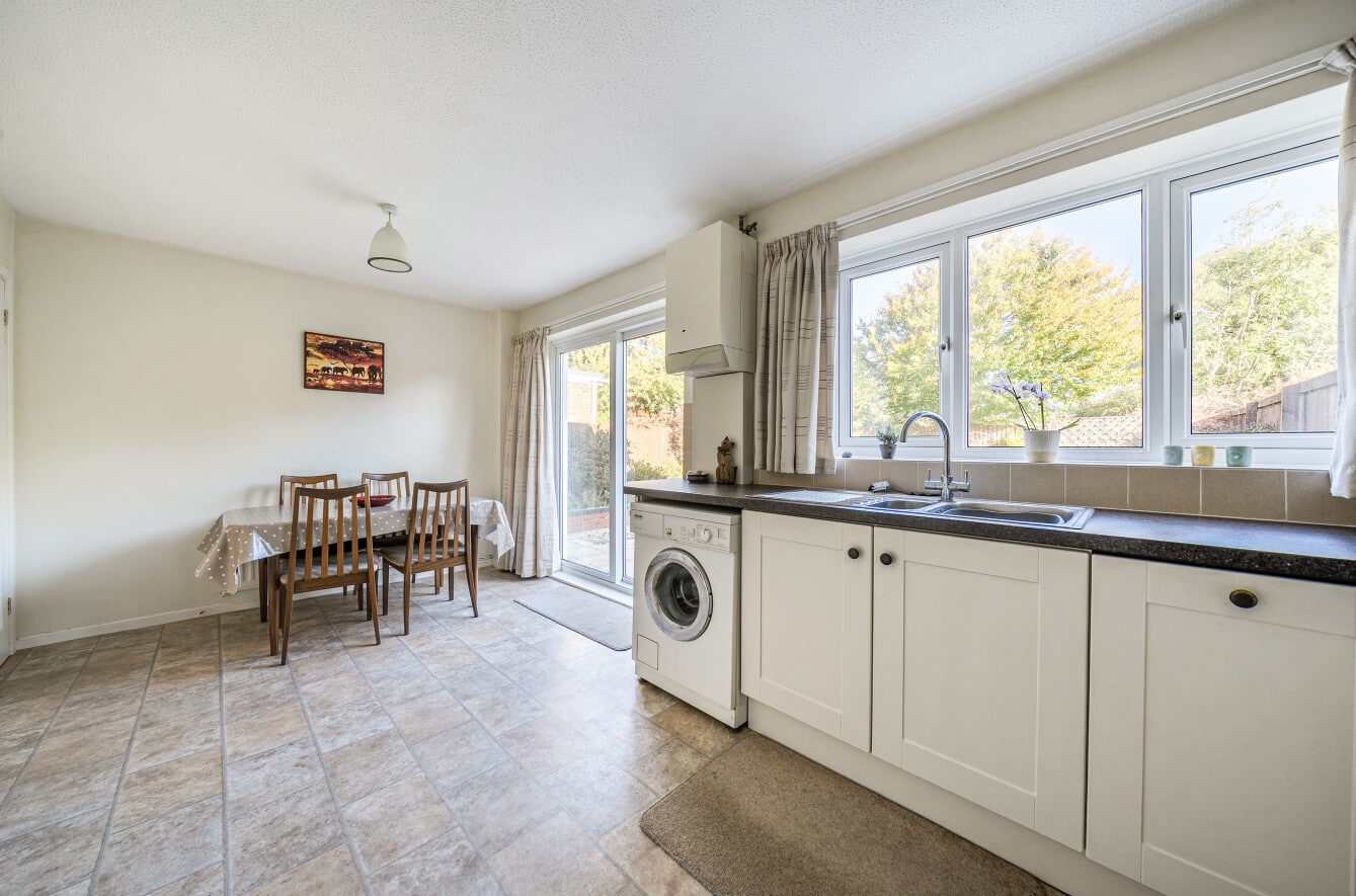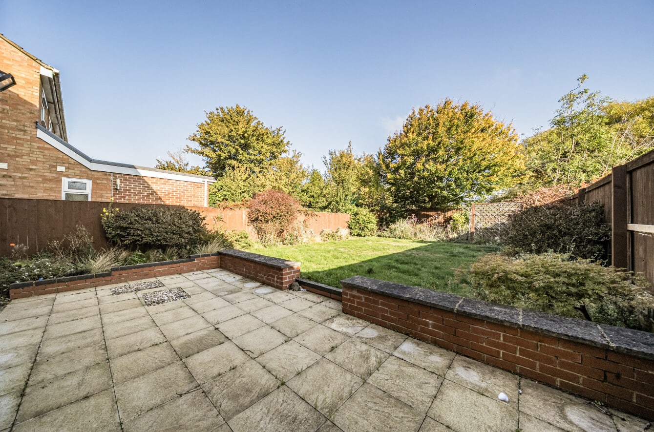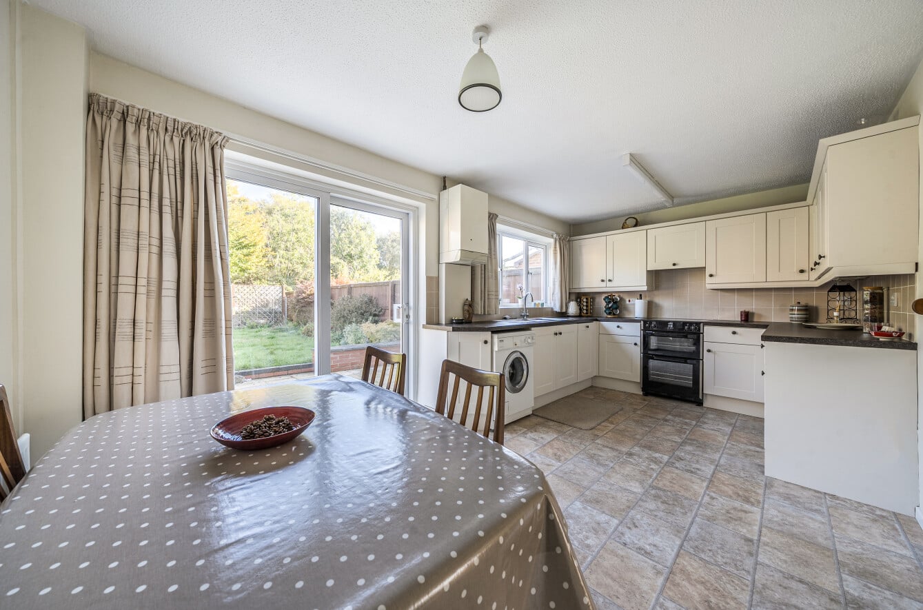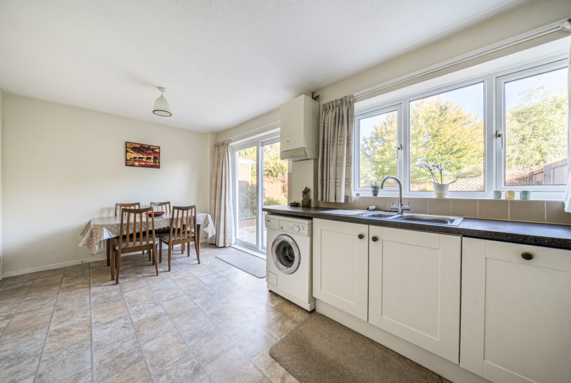 To the rear, you’ll find the open-plan kitchen and dining area – perfect for entertaining or family meals. There’s ample storage throughout, and stylish patio doors lead out to a generous garden featuring both lawn and patio areas, ideal for outdoor dining and play.