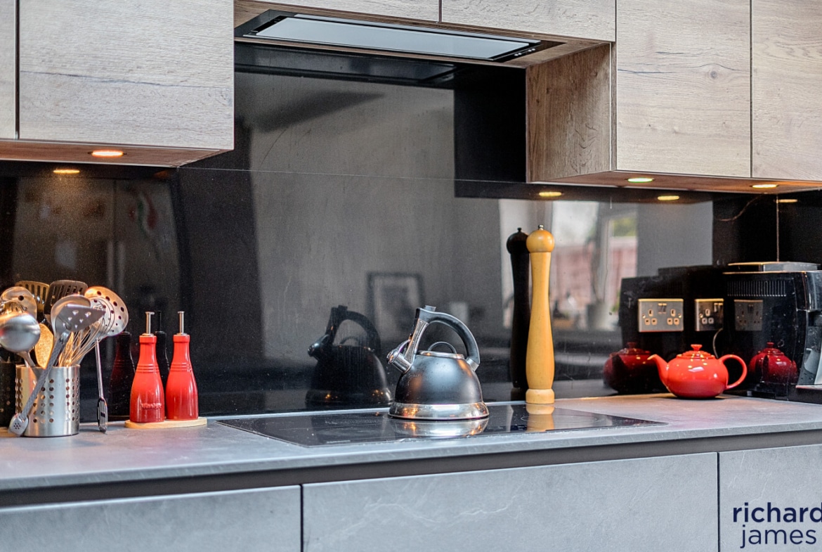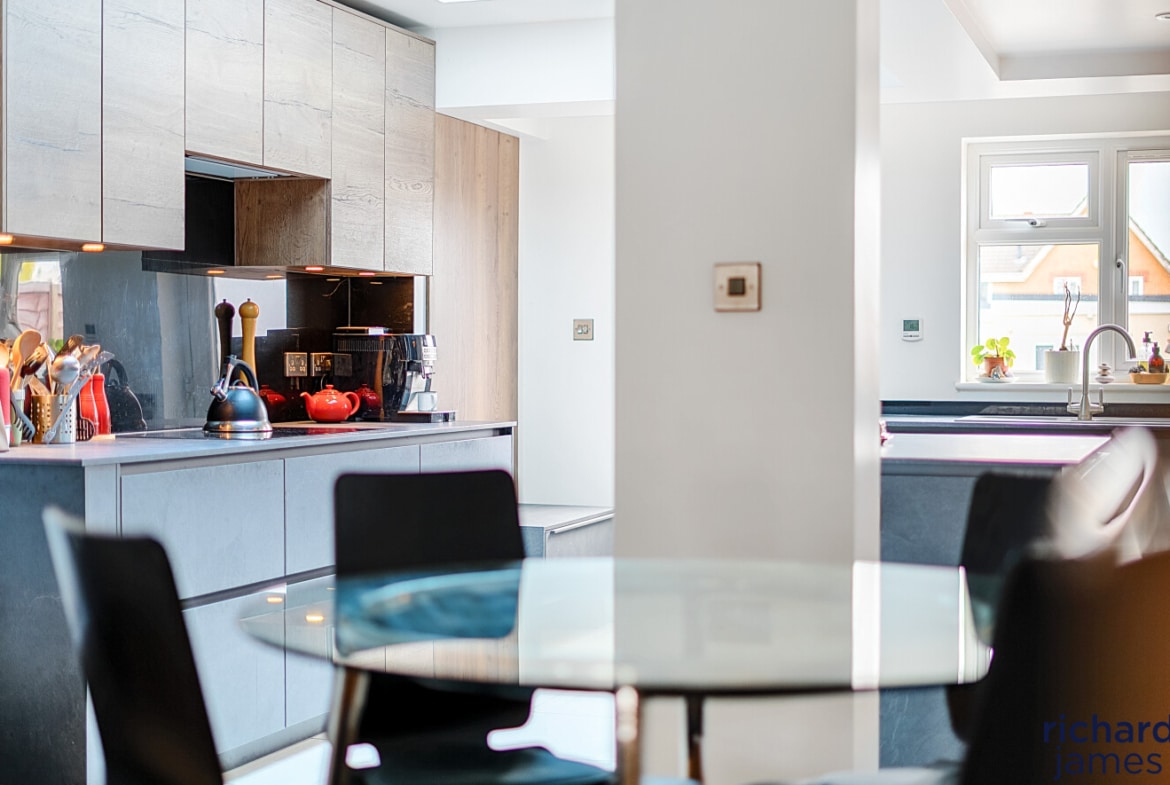 The cosy living room creates a warm and inviting space, while a sleek glass banister staircase adds a stylish modern touch as it leads to the first floor.