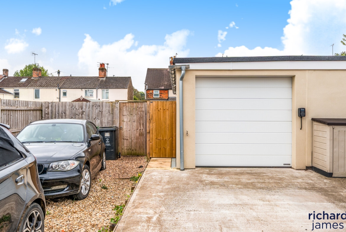 The well-presented garden extends to a tandem-style garage with workspace, electric roller door, and space for a car, with additional private parking for two vehicles at the rear.