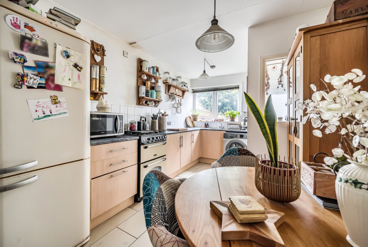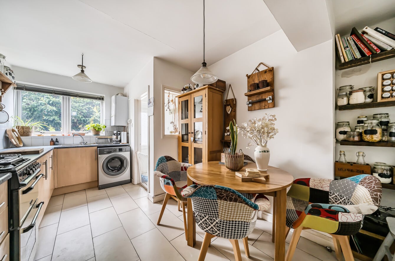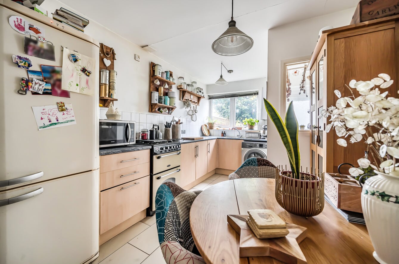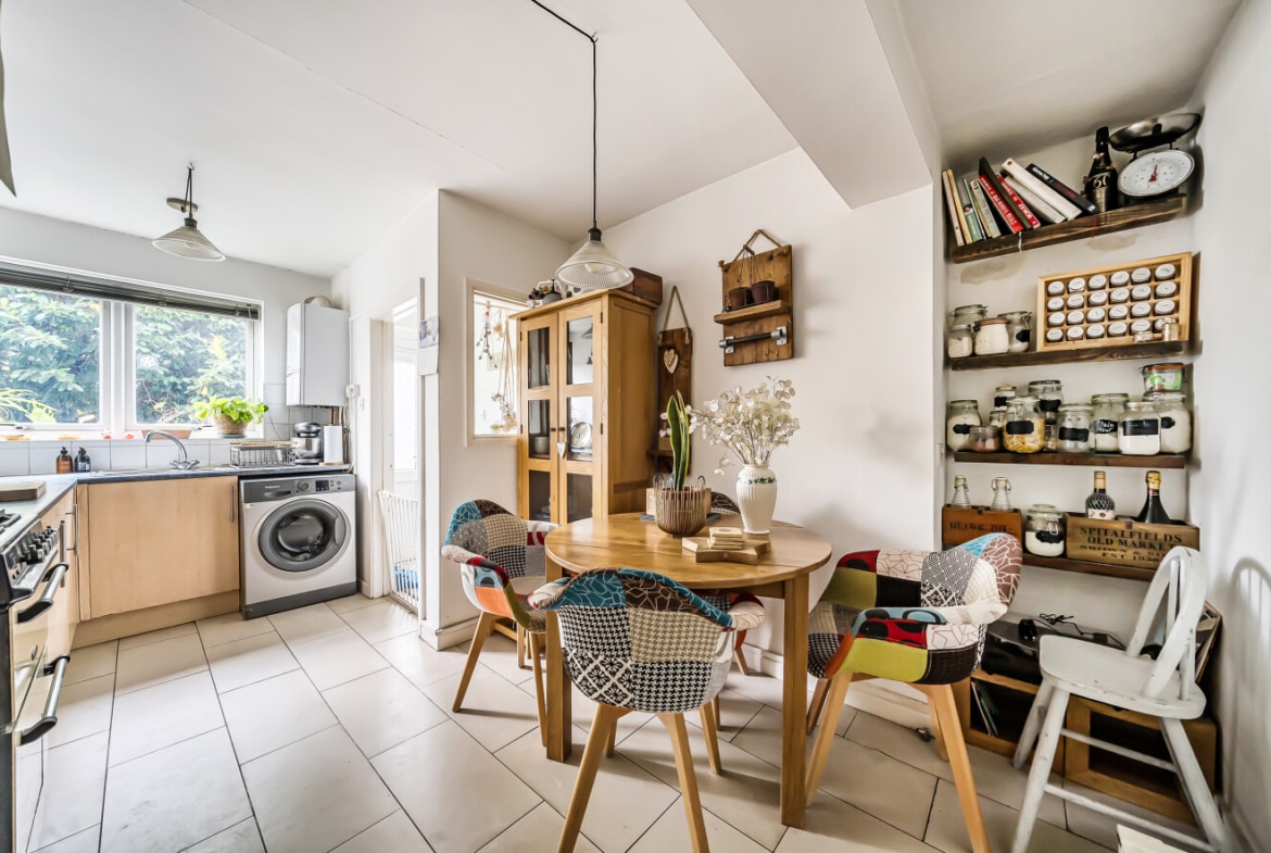 The ground floor also offers a functional family bathroom and an open-plan kitchen and dining area, designed for both everyday living and entertaining. The kitchen provides storage and workspace, while the bright and airy dining area makes a perfect spot for family meals or gatherings with friends.