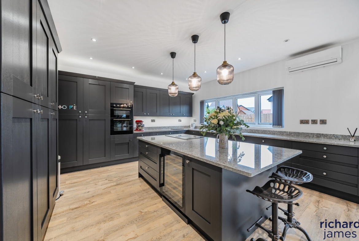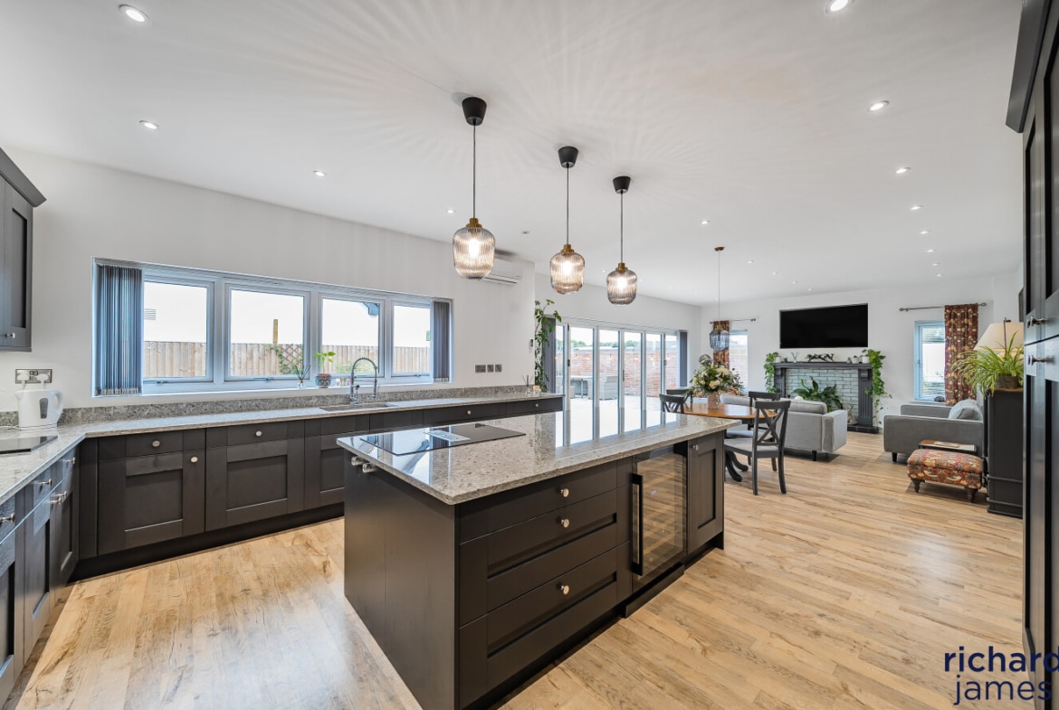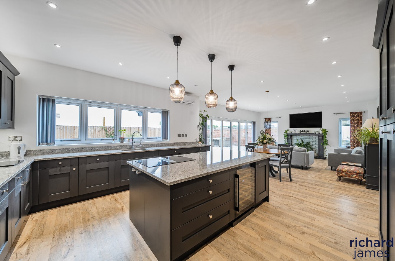 The heart of the property is the expansive kitchen diner and family room, stretching across the entire back of the home. This open plan space is perfect for modern living and entertaining, with high end appliances, elegant countertops, and sleek cabinetry.