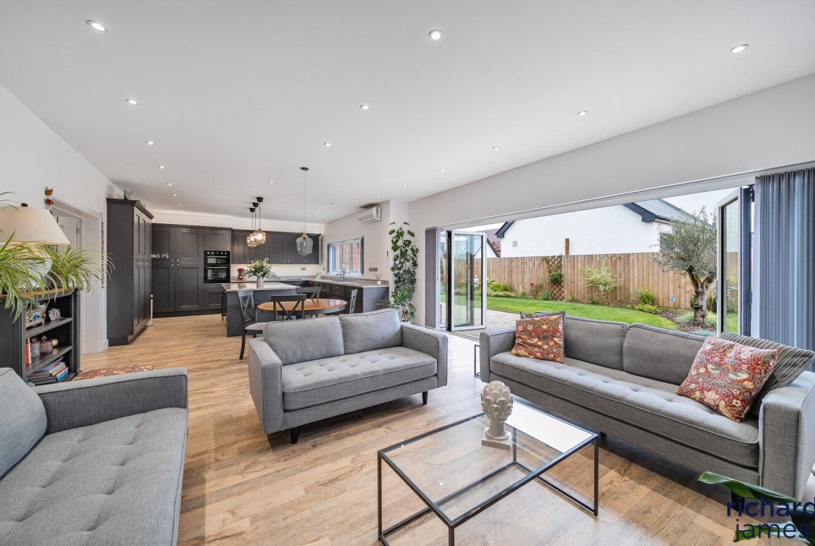The bi-folding doors seamlessly connect the indoors to the beautifully landscaped rear garden, creating an ideal setting for alfresco dining and summer gatherings. Additionally, a well appointed utility room adds practicality to this luxurious space.