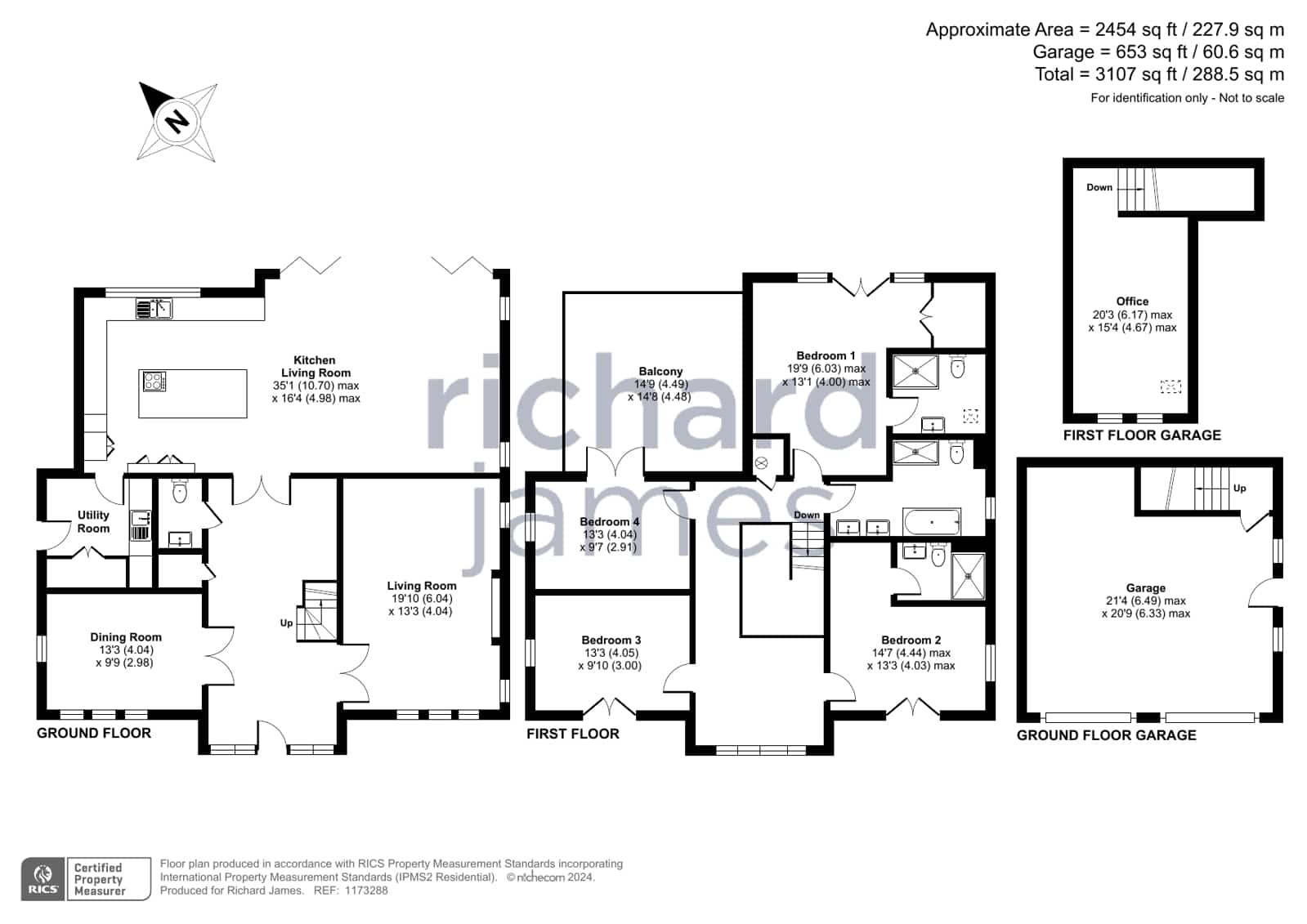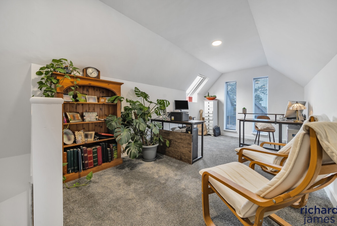 Externally, the rear garden is beautifully landscaped, offering privacy and a serene environment for outdoor living. The property also features ample driveway parking and a double garage, which has been converted into versitile office space. With a shower room, kitchenette and cloakroom with another room above for additional storage/ working space.