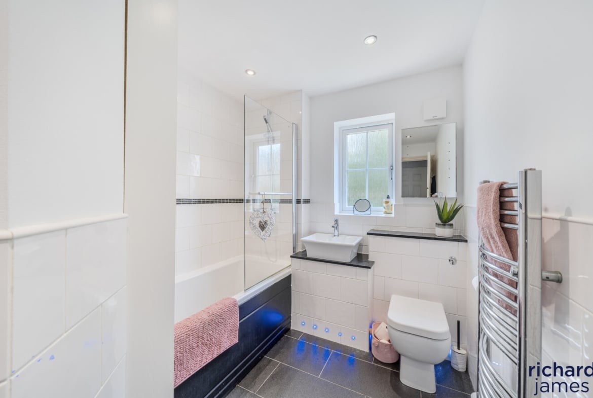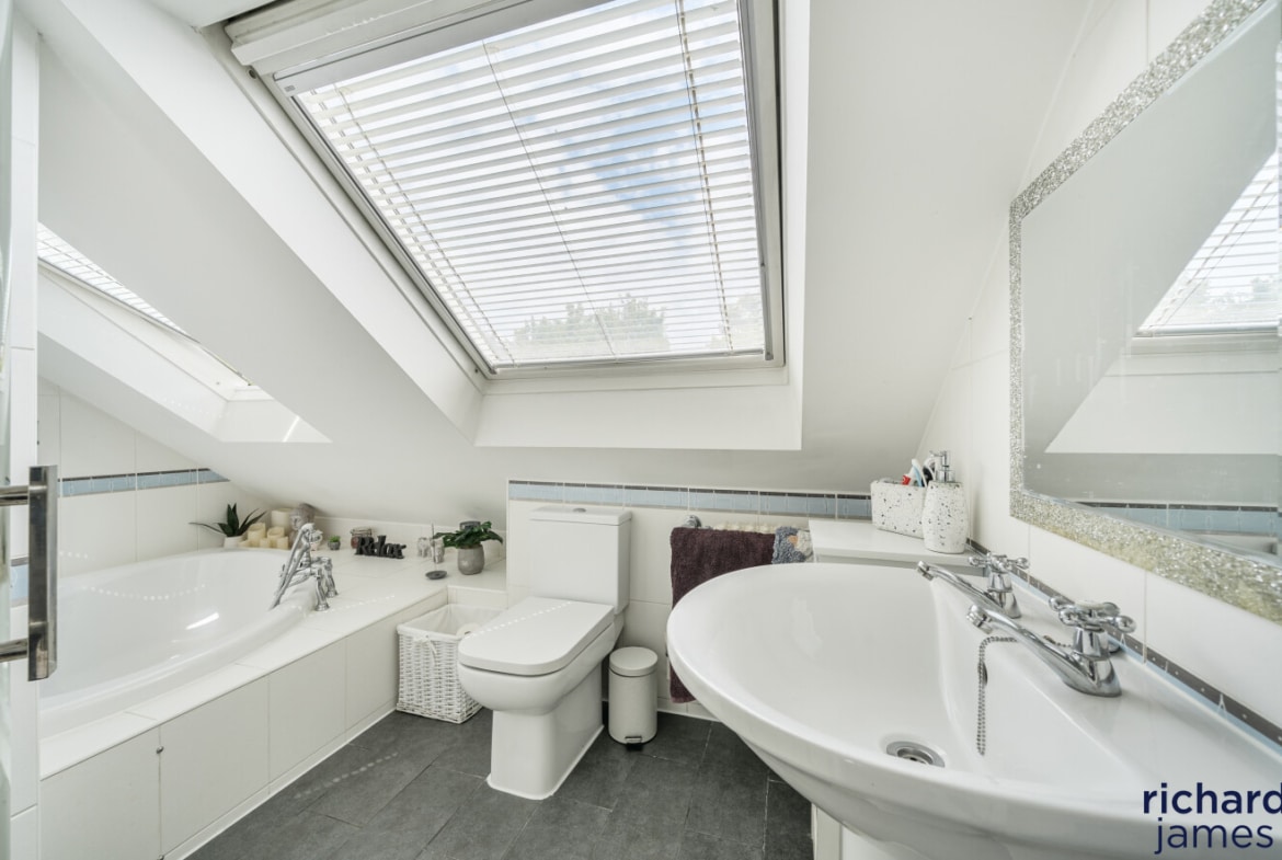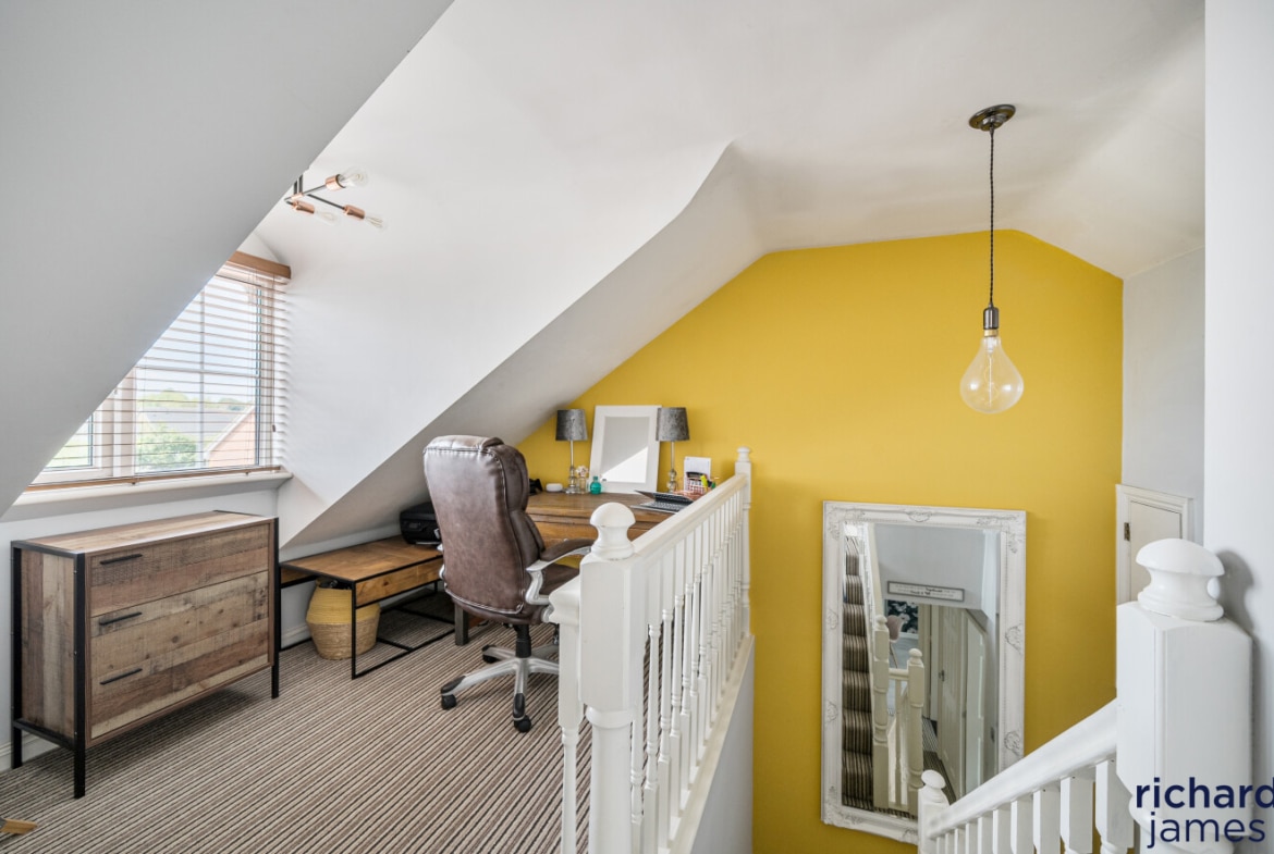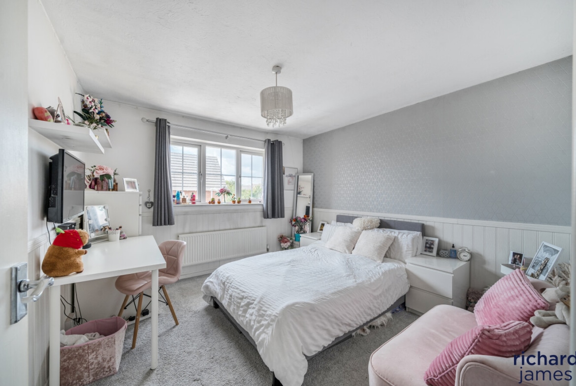 This well-maintained detached house offers ample storage, two ensuites, a family bathroom, and five double bedrooms spread over two floors, including office space. The kitchen/dining room opens to a private rear garden, a haven for wildlife. Situated in a quiet cul-de-sac, it features driveway parking, a front lawn, and excellent access to schools, shops, countryside, and road links.