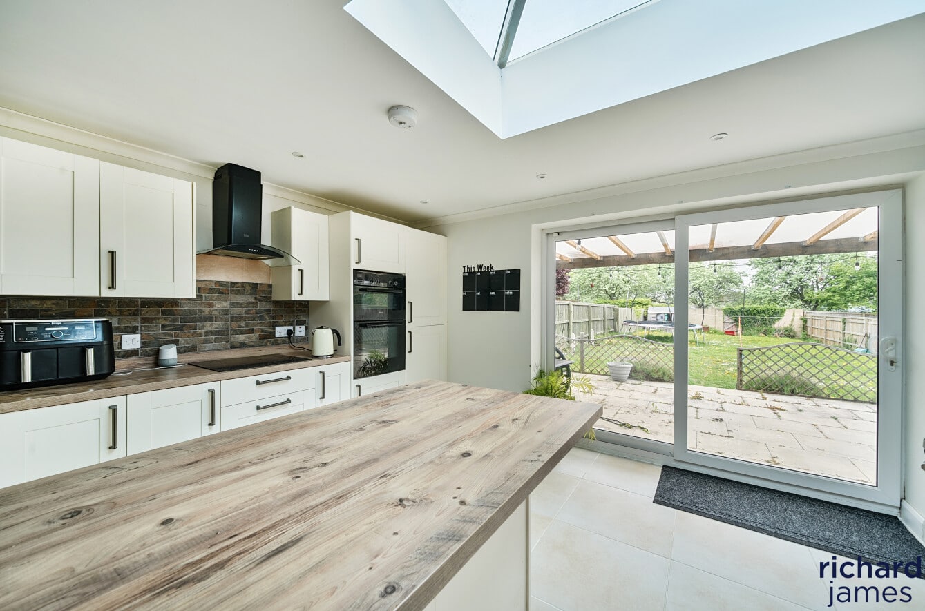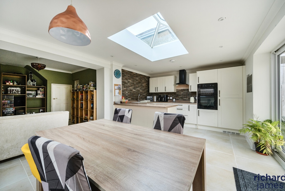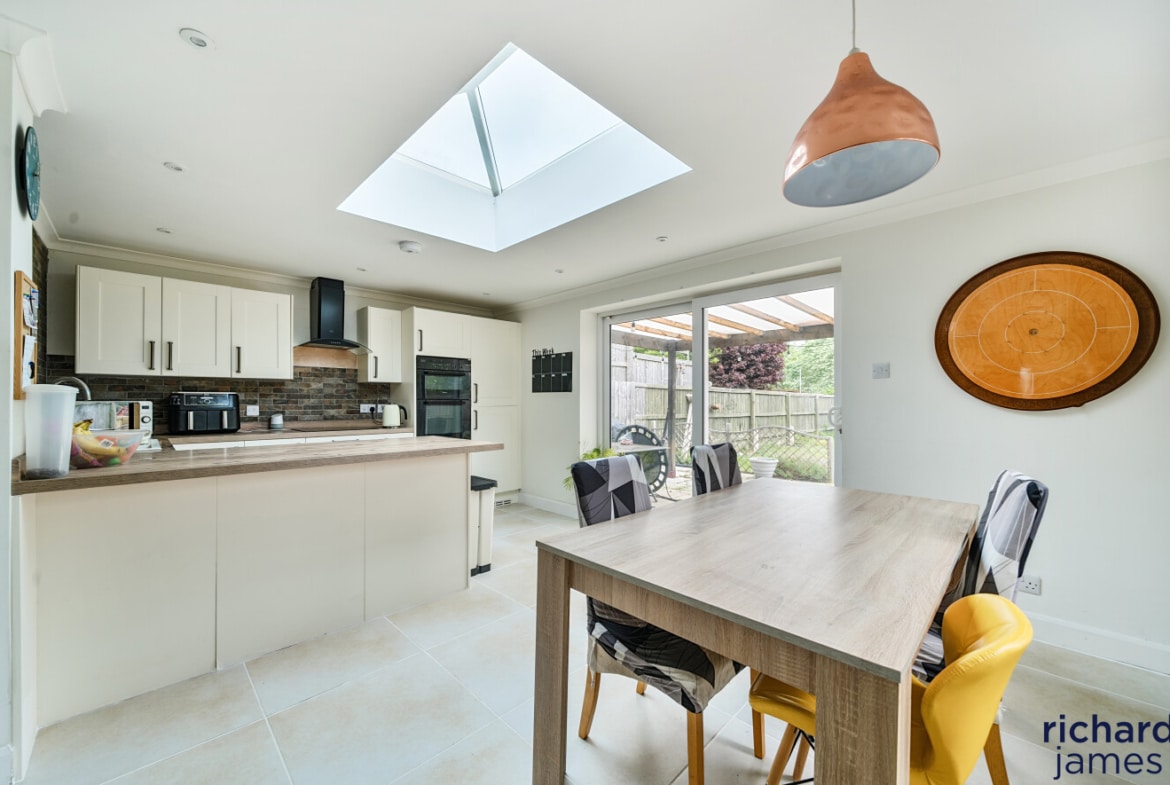 The heart of the home is the stunning open-plan kitchen/diner, complete with a lantern roof, a separate sitting area, and sliding doors opening onto the garden, creating a bright and welcoming space for entertaining and everyday life.