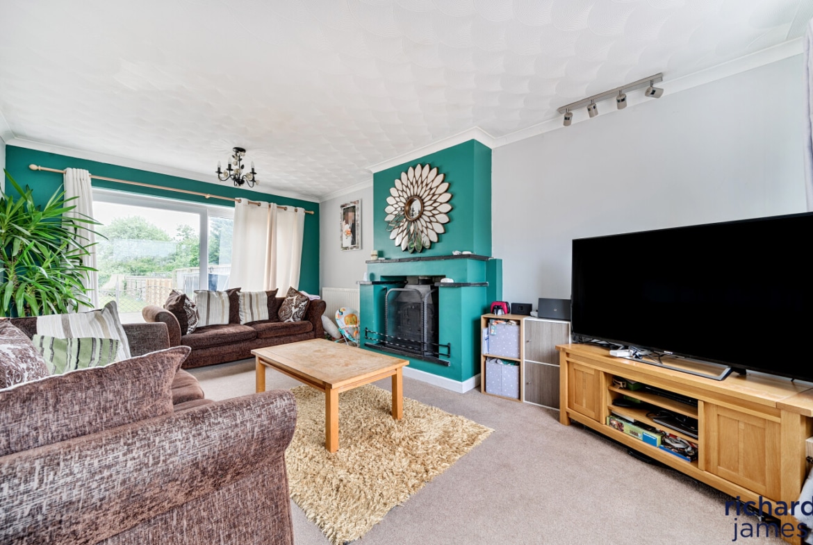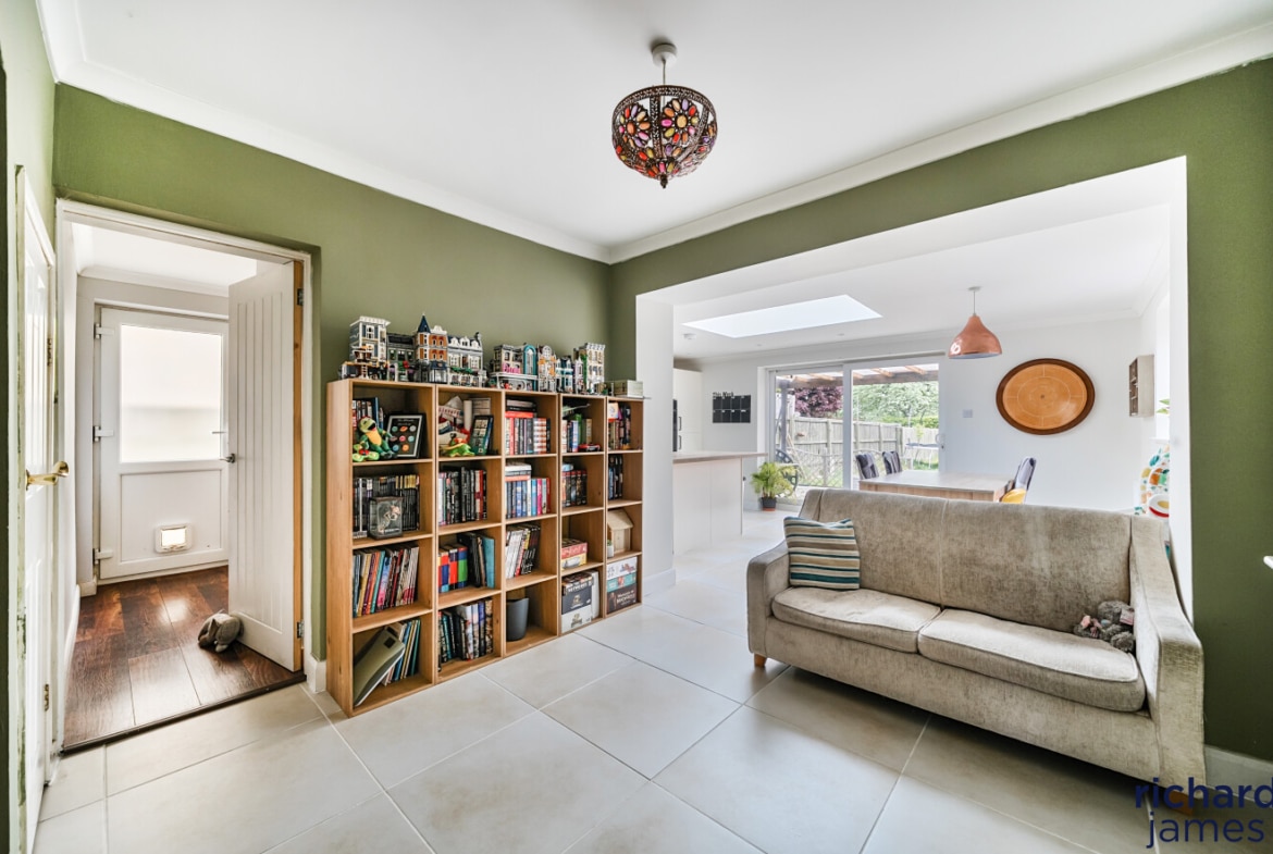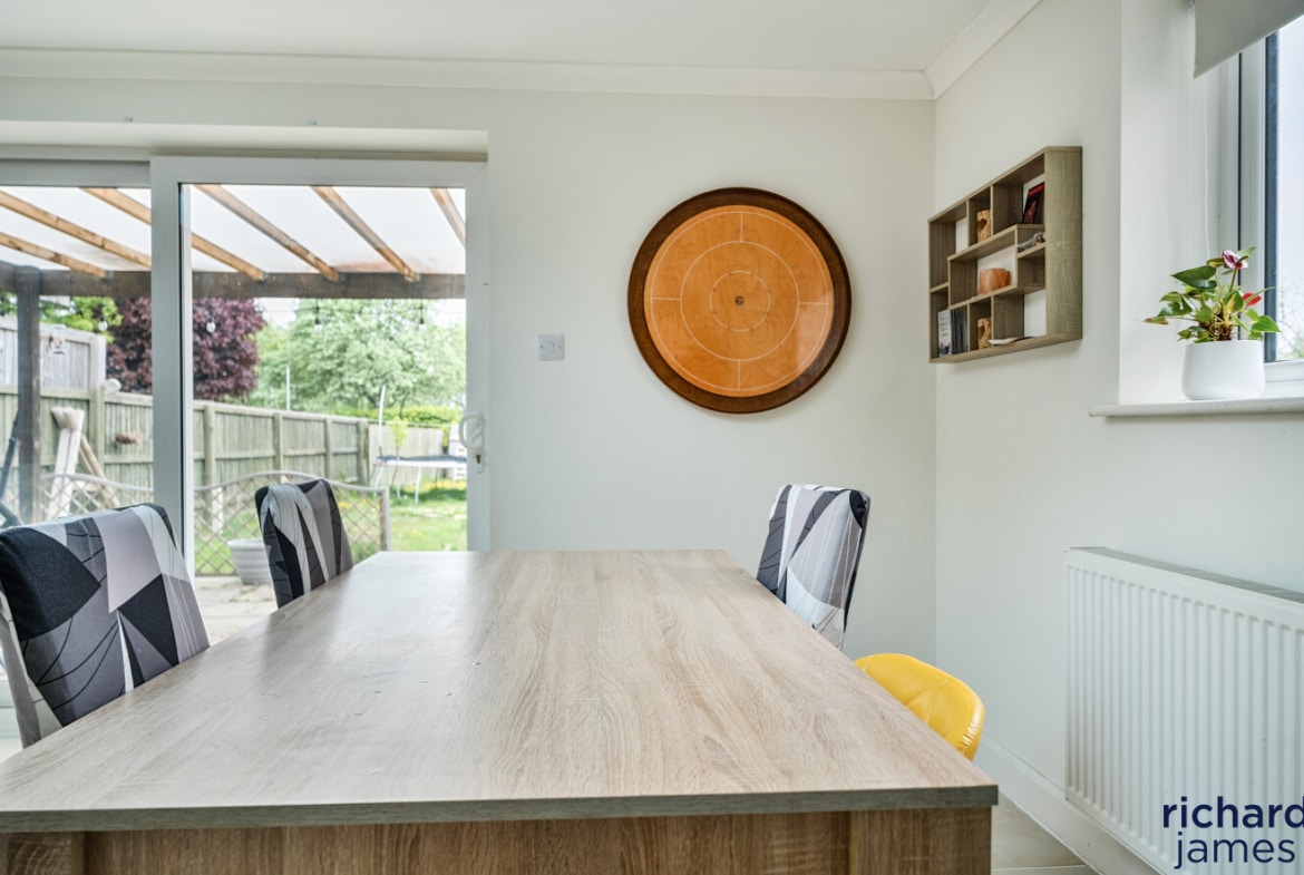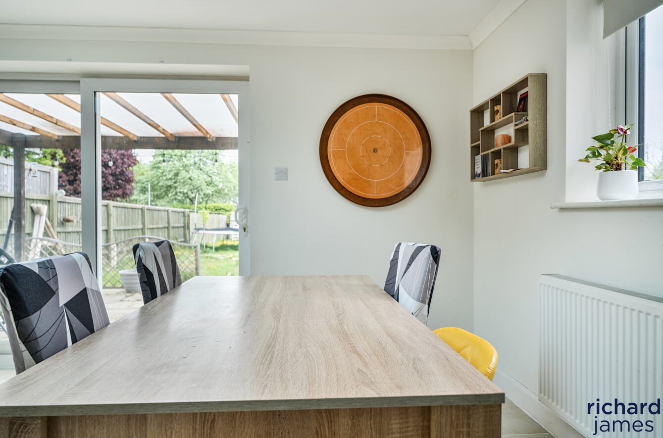 The dual-aspect lounge is equally inviting, featuring a cosy log burner for those colder evenings. The garage has been thoughtfully converted to create a large additional reception room, currently used as an office — ideal for those working from home or needing extra flexible living space.