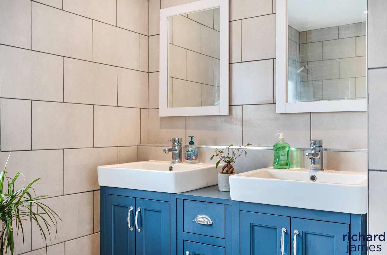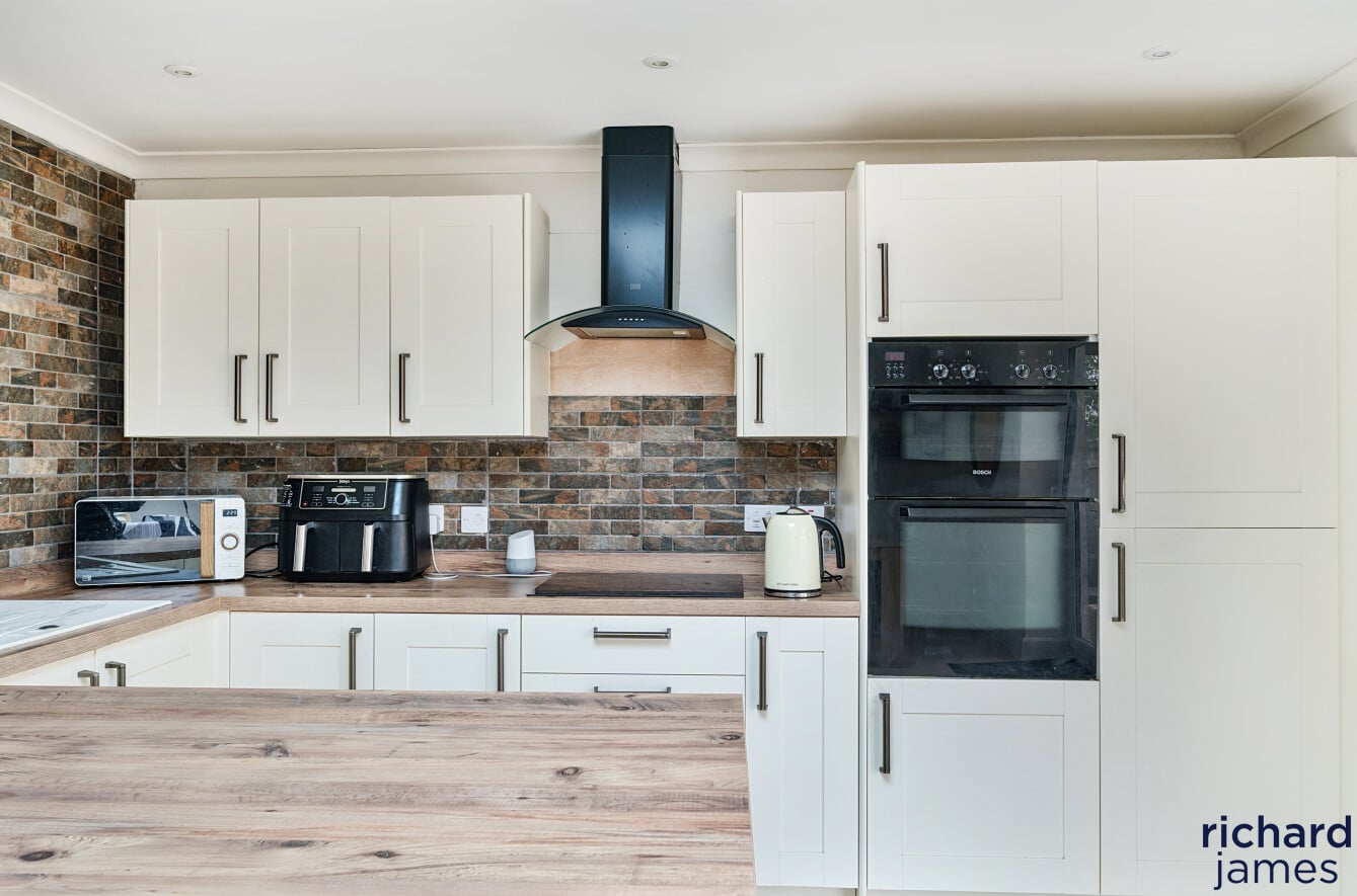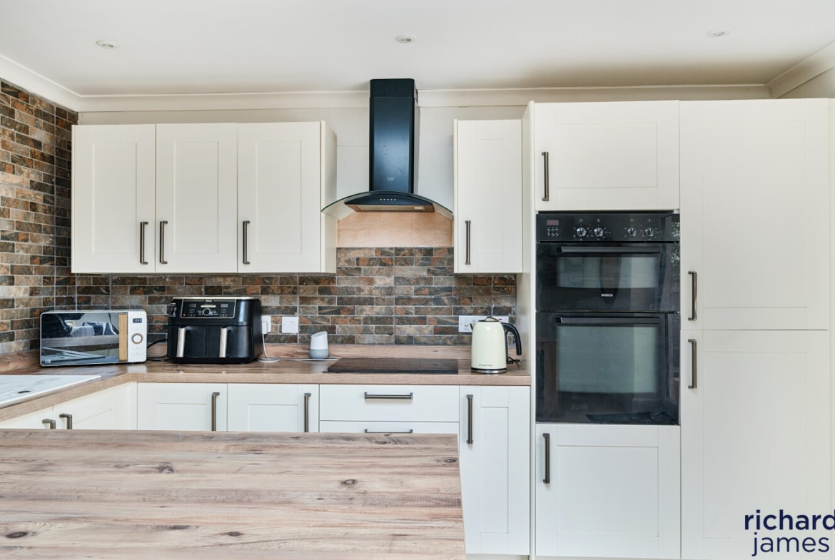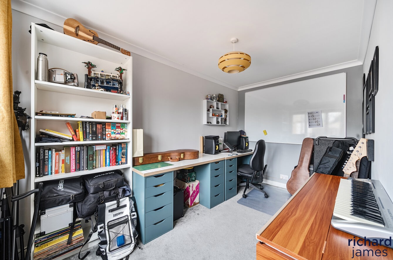 The dual-aspect lounge is equally inviting, featuring a cosy log burner for those colder evenings. The garage has been thoughtfully converted to create a large additional reception room, currently used as an office — ideal for those working from home or needing extra flexible living space.