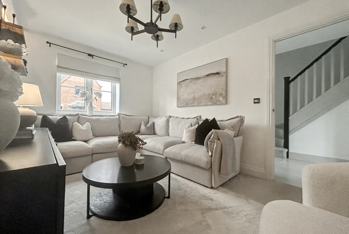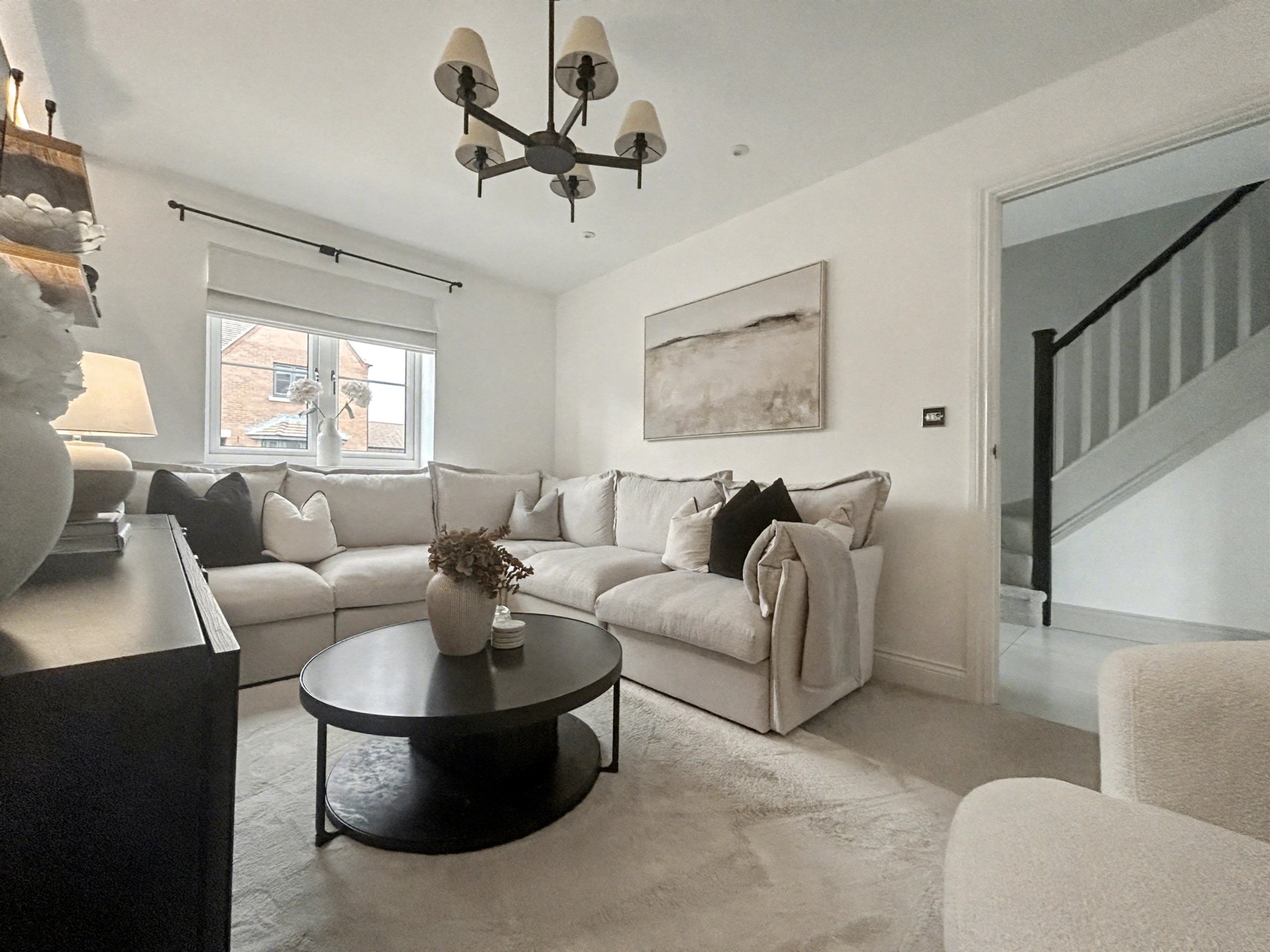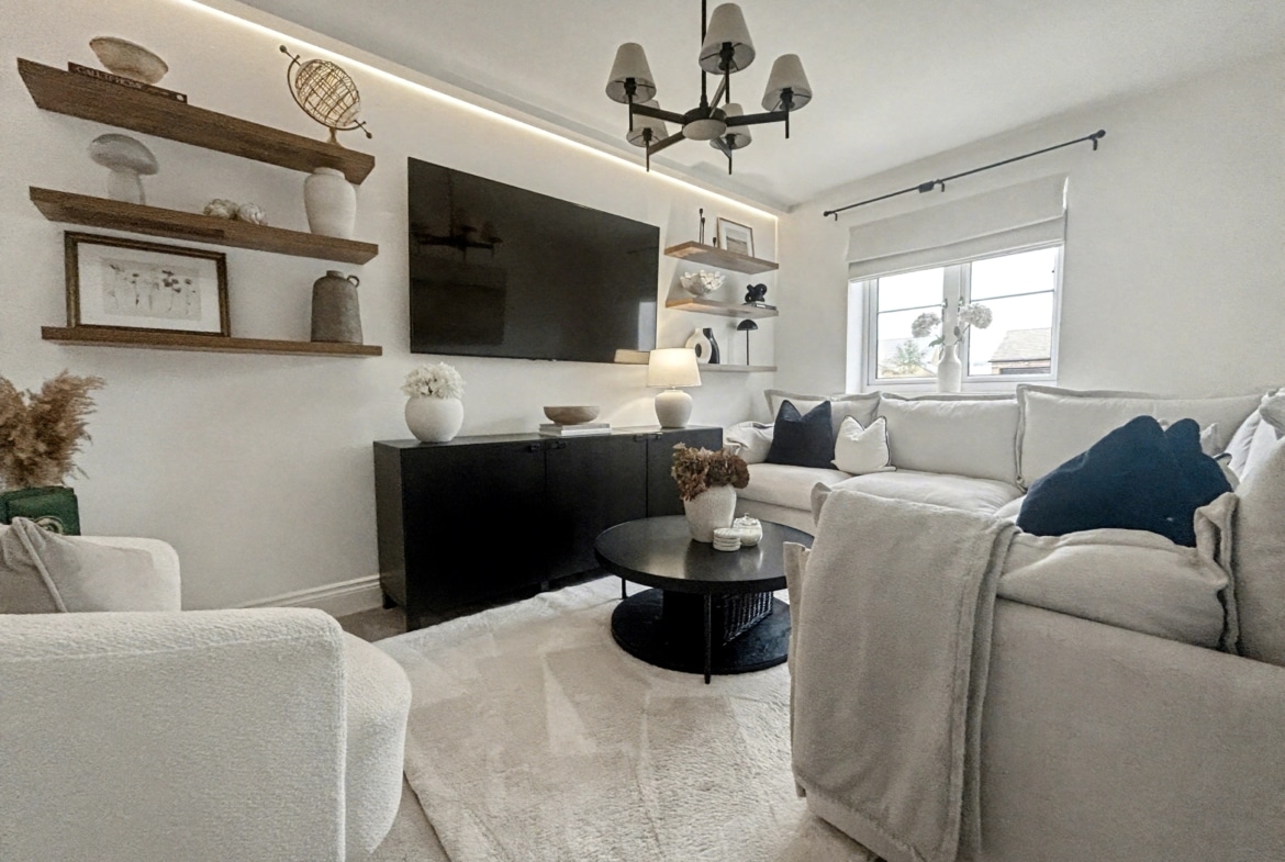 The living room offers a cosy retreat with elegant feature lighting, plush tones, and a warm, inviting ambiance. Throughout the ground floor, underfloor heating ensures year-round comfort and a seamless modern finish.