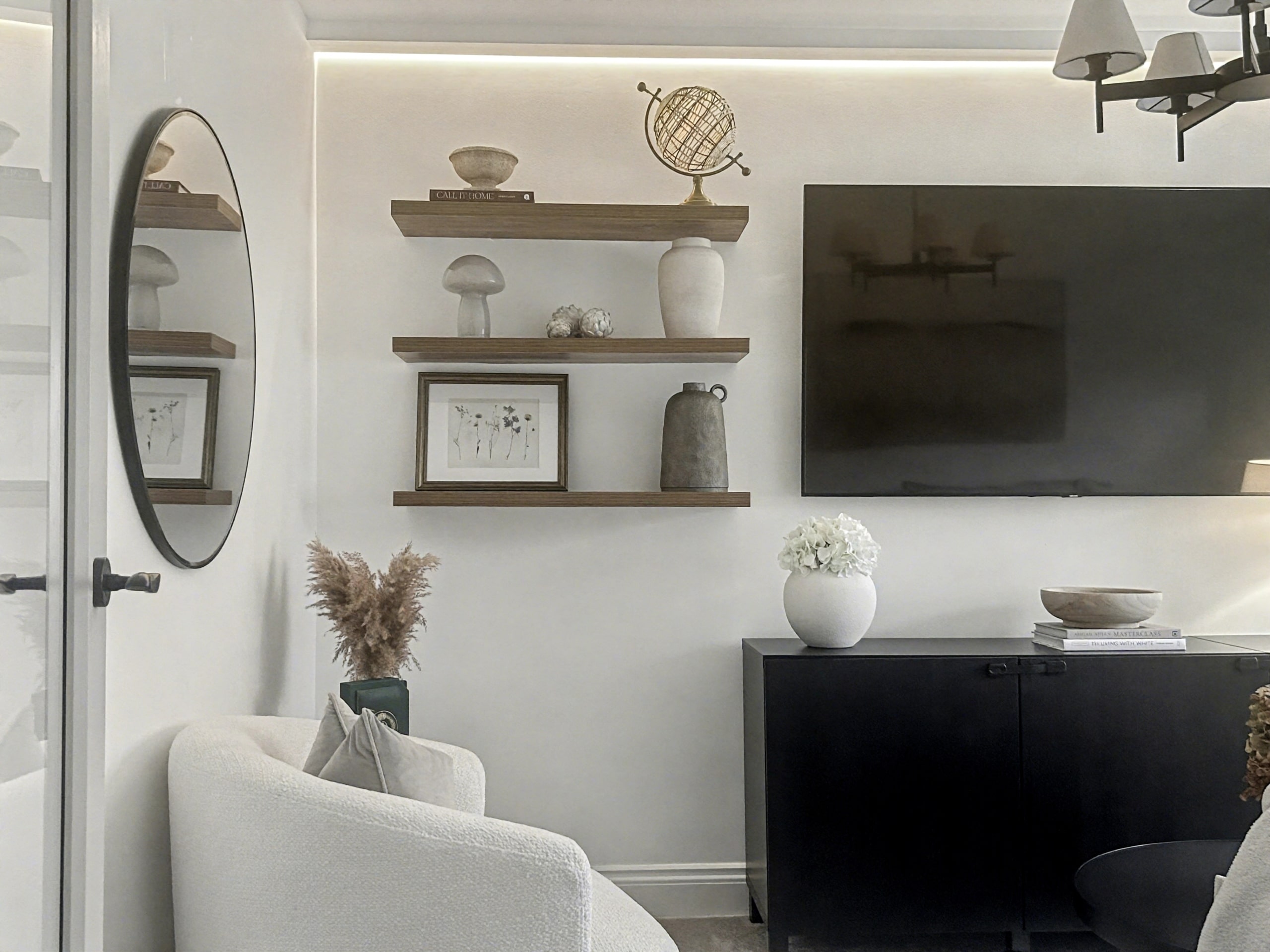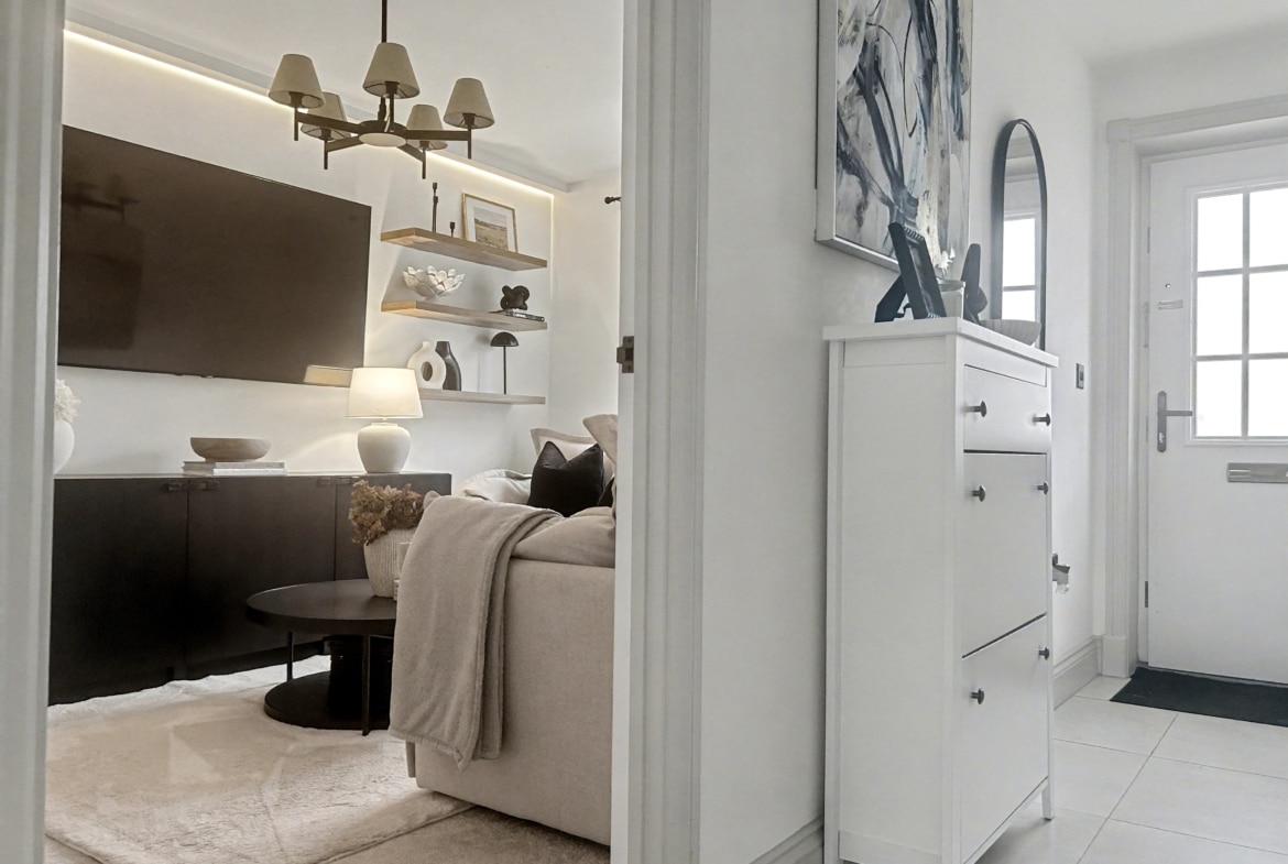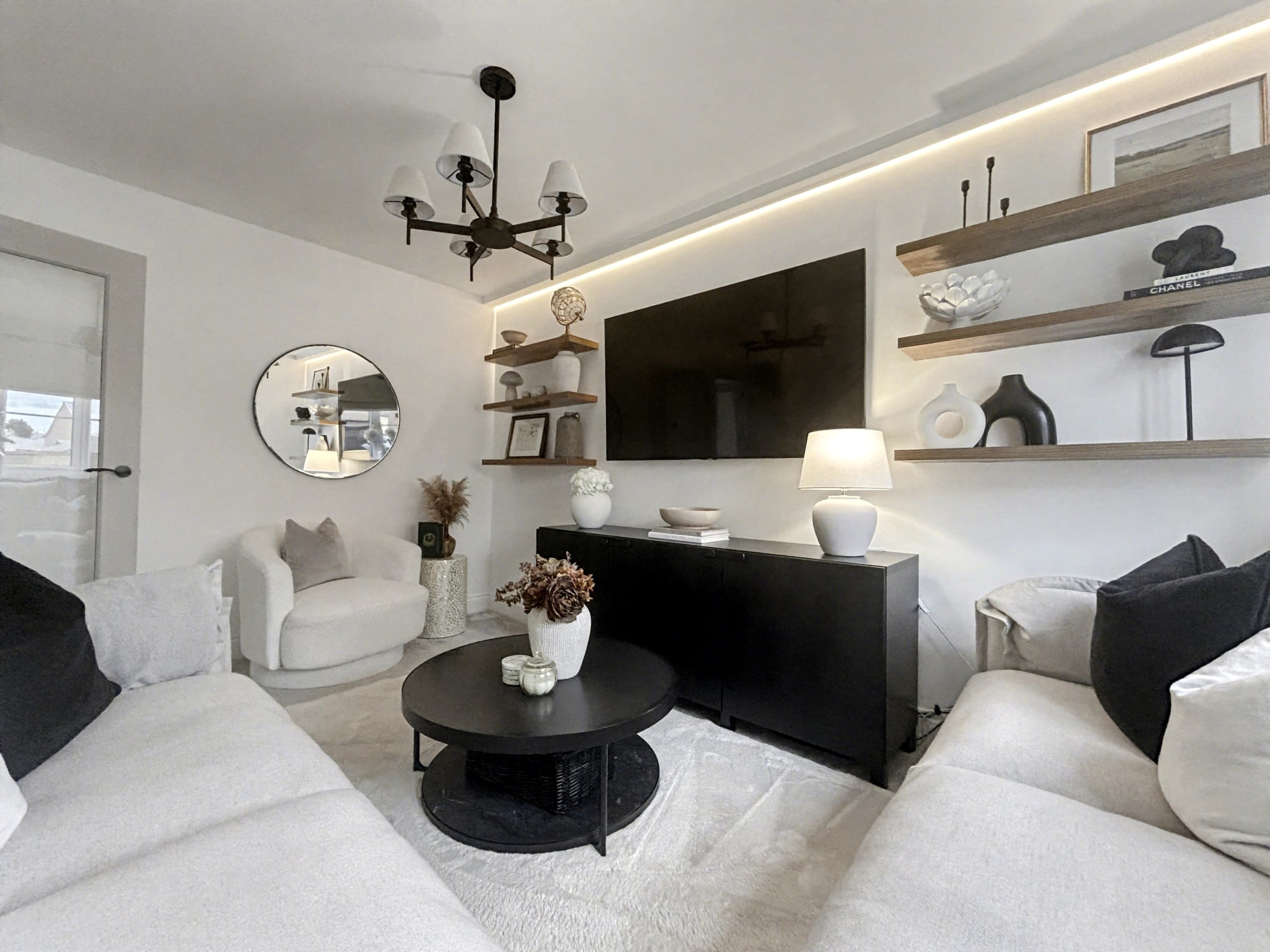 The living room offers a cosy retreat with elegant feature lighting, plush tones, and a warm, inviting ambiance. Throughout the ground floor, underfloor heating ensures year-round comfort and a seamless modern finish.