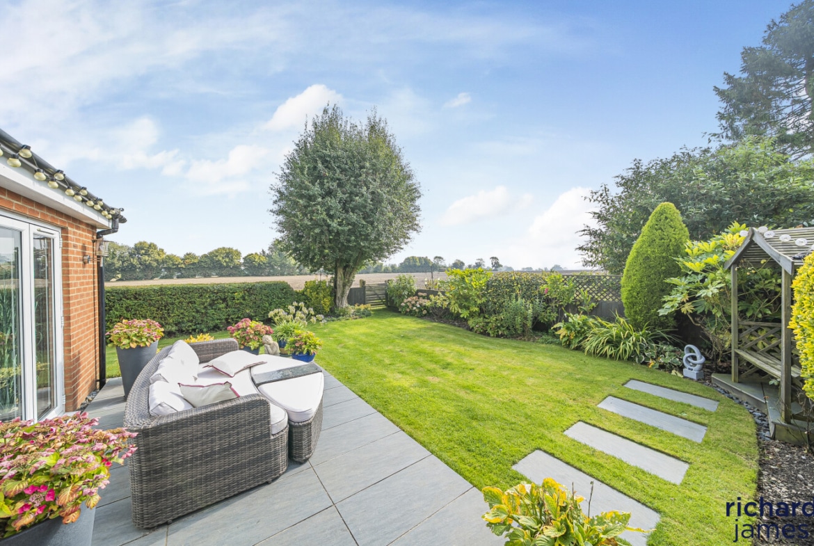Further features include the well tended Rear Garden, laid predominantly to lawn with modern paved seating areas, ideal for alfresco dining and enjoy the sunny aspect and privacy. The lawn extends to side, leading to raised vegetable/herb garden, and gives personal door access to the Double Garage. The gardens are enclosed by hedging allowing far reaching views across the fields. To the front, is paved with steps down to the driveway which leads to the detached Double Garage.