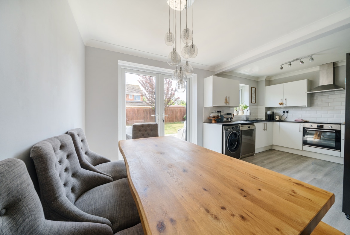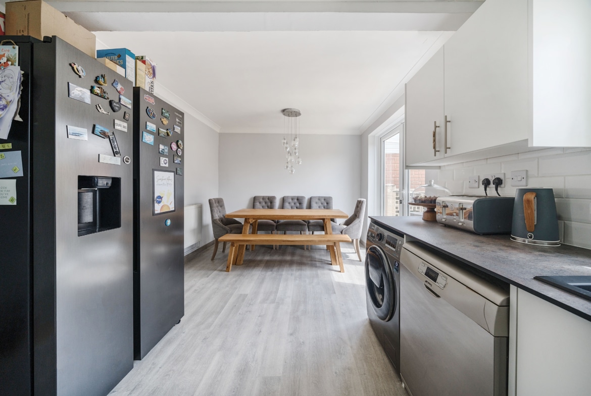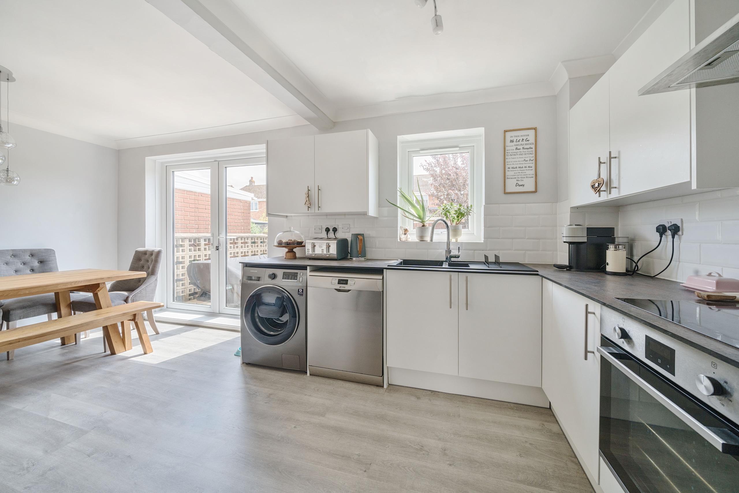 The ground floor welcomes you with a light-filled living room at the front of the home—ideal for relaxing or entertaining. To the rear, a stylish and recently refitted kitchen/diner spans the width of the property, offering a sociable space for cooking and dining. With direct access to the south-facing garden, it’s perfect for summer barbecues, morning coffee in the sun, or simply unwinding outdoors.