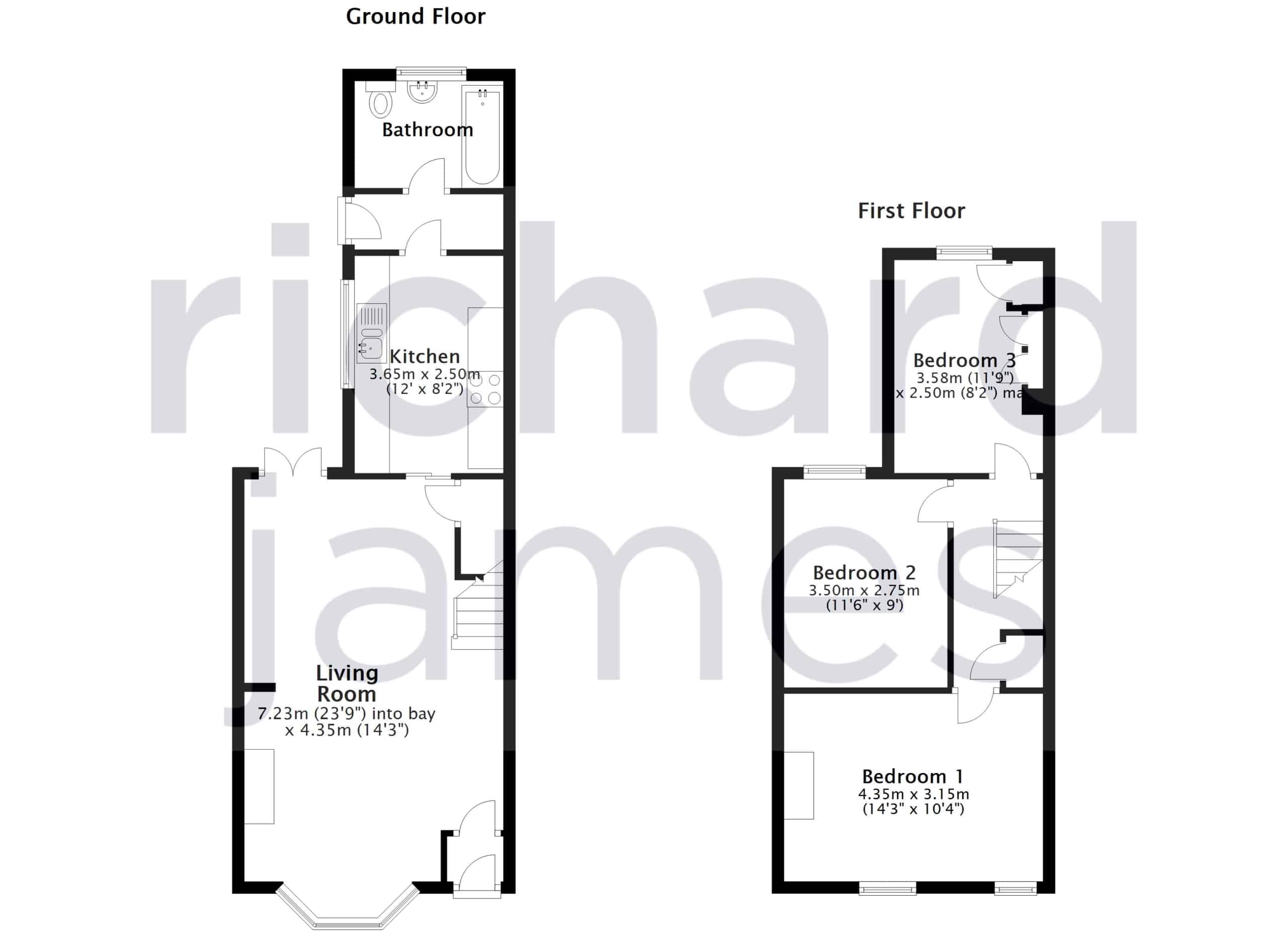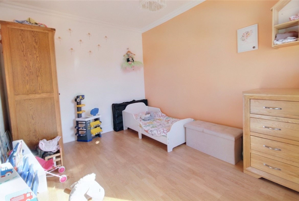 Upstairs, the first-floor landing leads to a notably large main bedroom, a comfortable double second bedroom, and a well-sized third bedroom—ideal as a guest room, home office, or nursery.