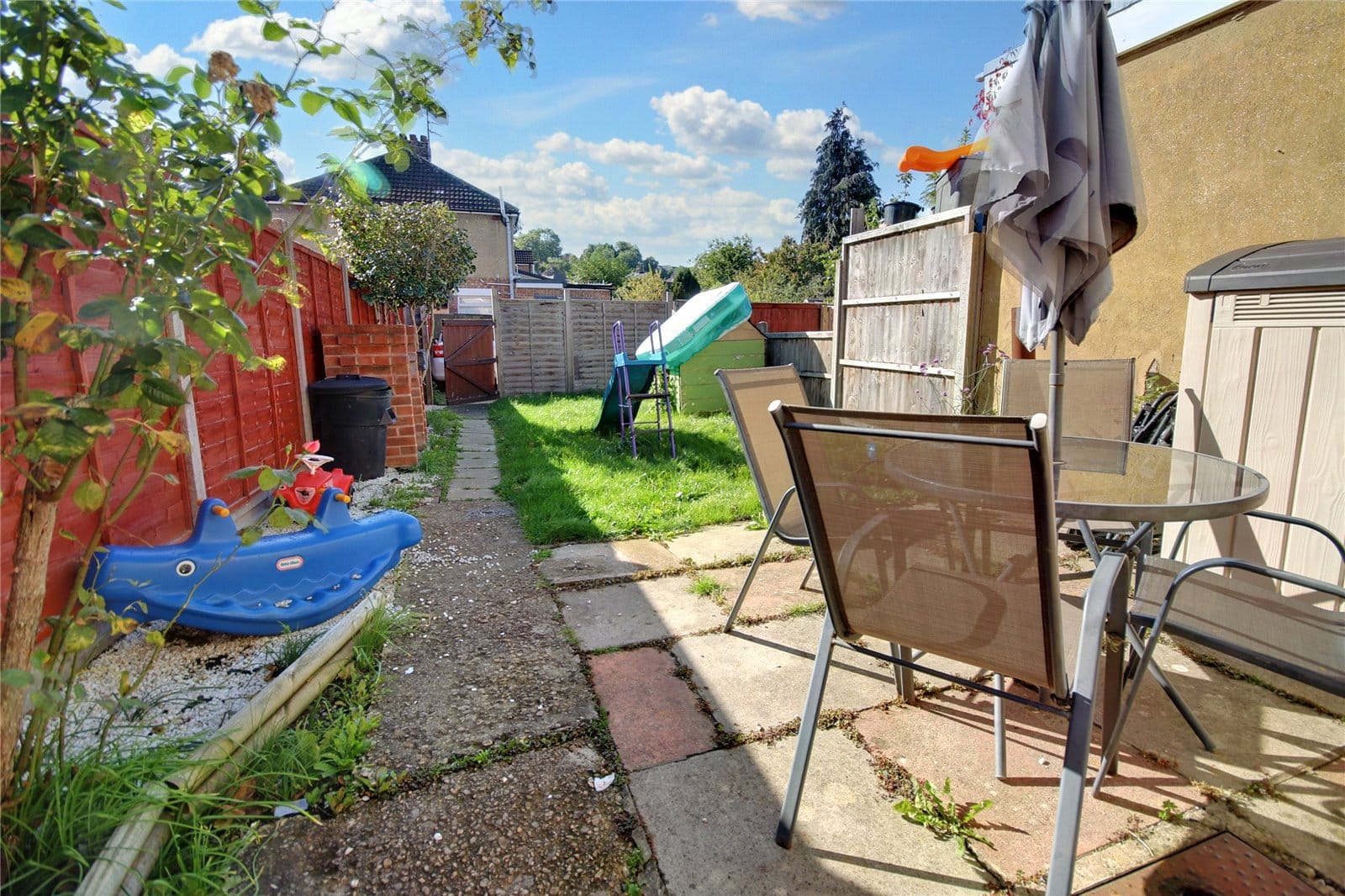 Outside, the enclosed rear garden is perfectly set up for relaxing or hosting summer barbecues, with a patio seating area that opens onto a lawn. Beyond the garden, gated rear access brings you to a private driveway offering parking for two vehicles—an incredibly valuable feature for this central location.