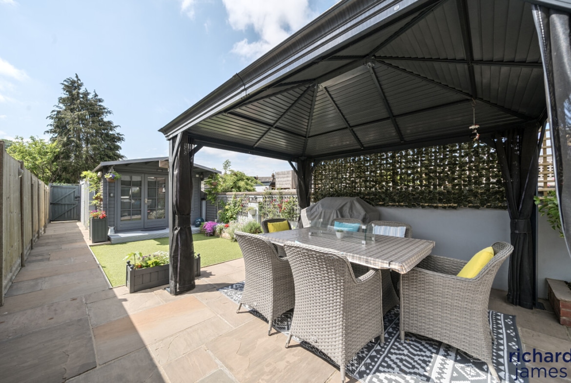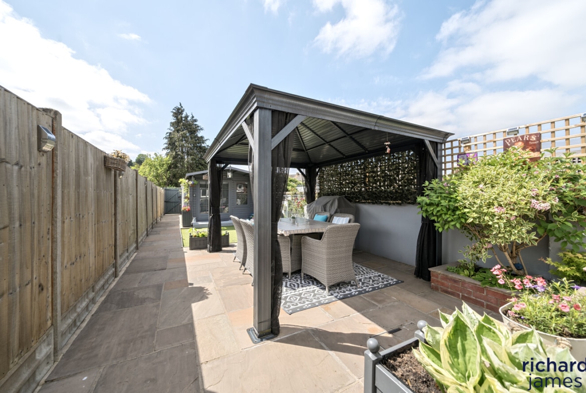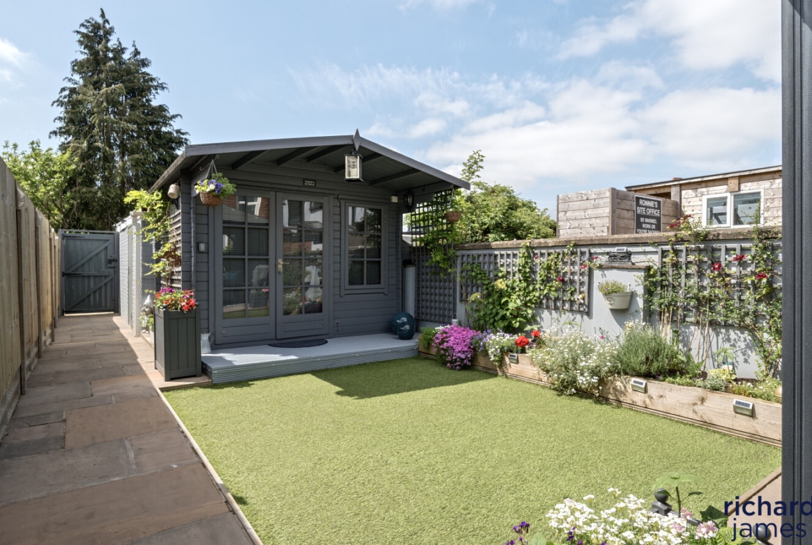 To the rear is an enclosed landscaped rear garden with a patio seating and barbecue area with an artificial lawn with a summer house looking onto it. There is also a detached garage at the rear of the garden accessed via rear lane.