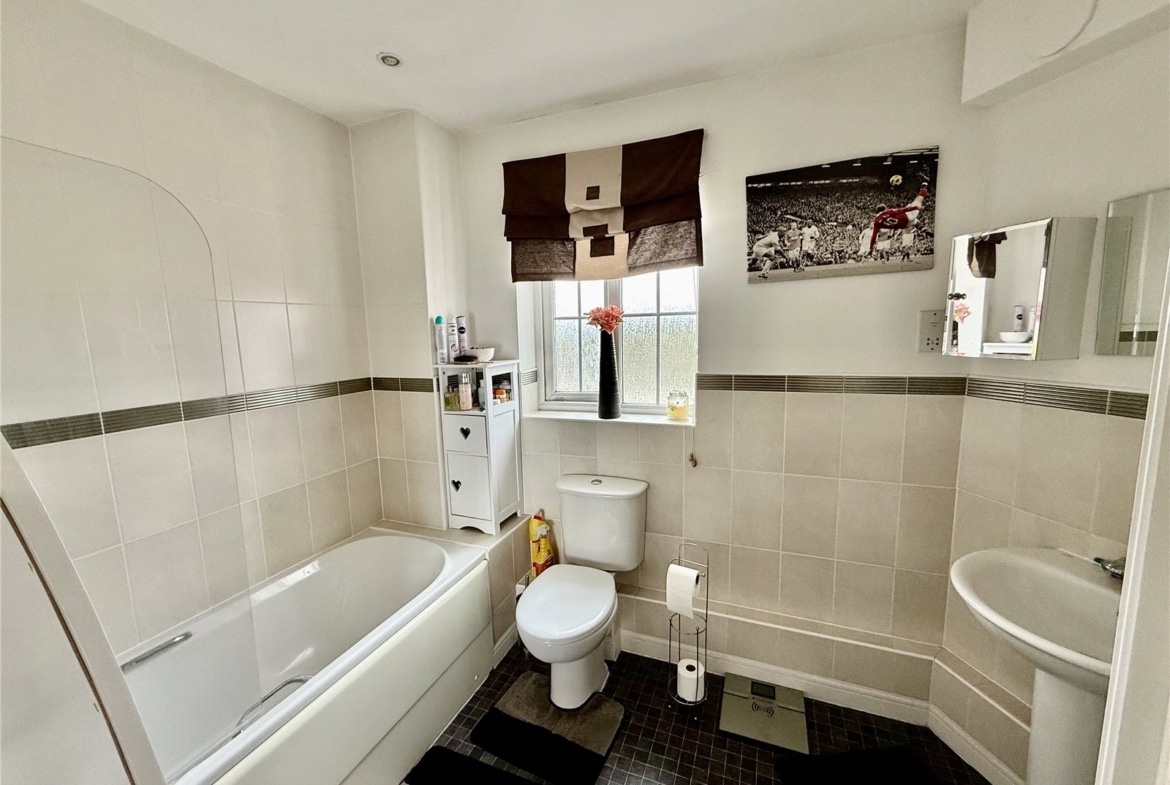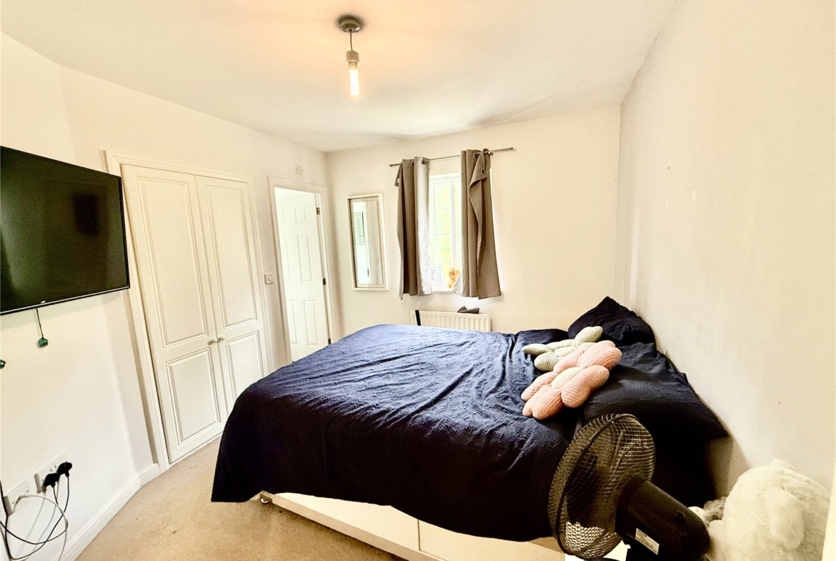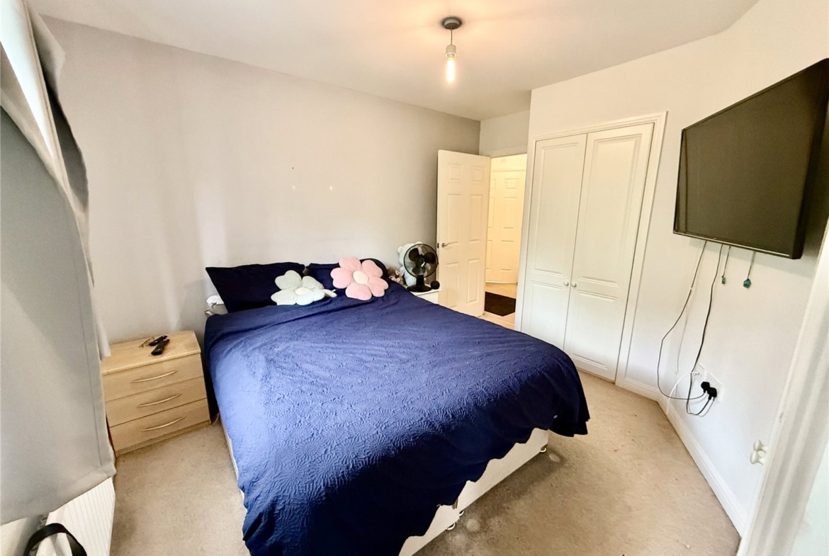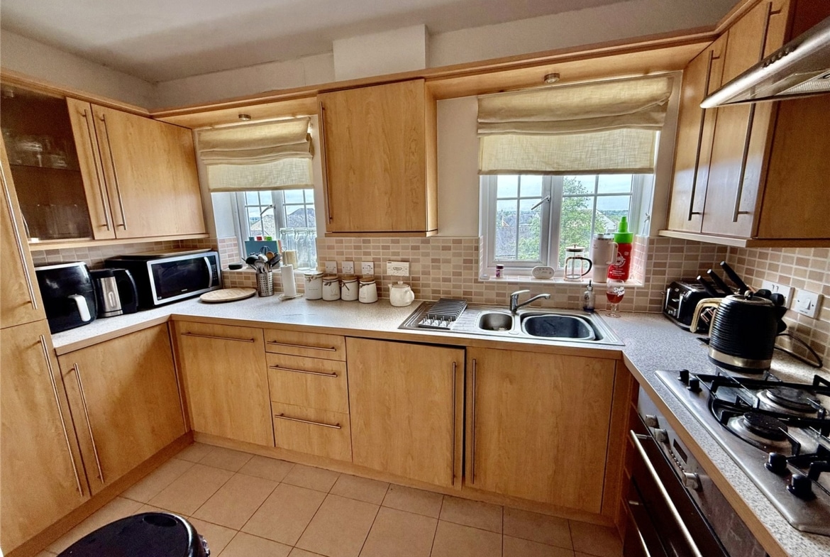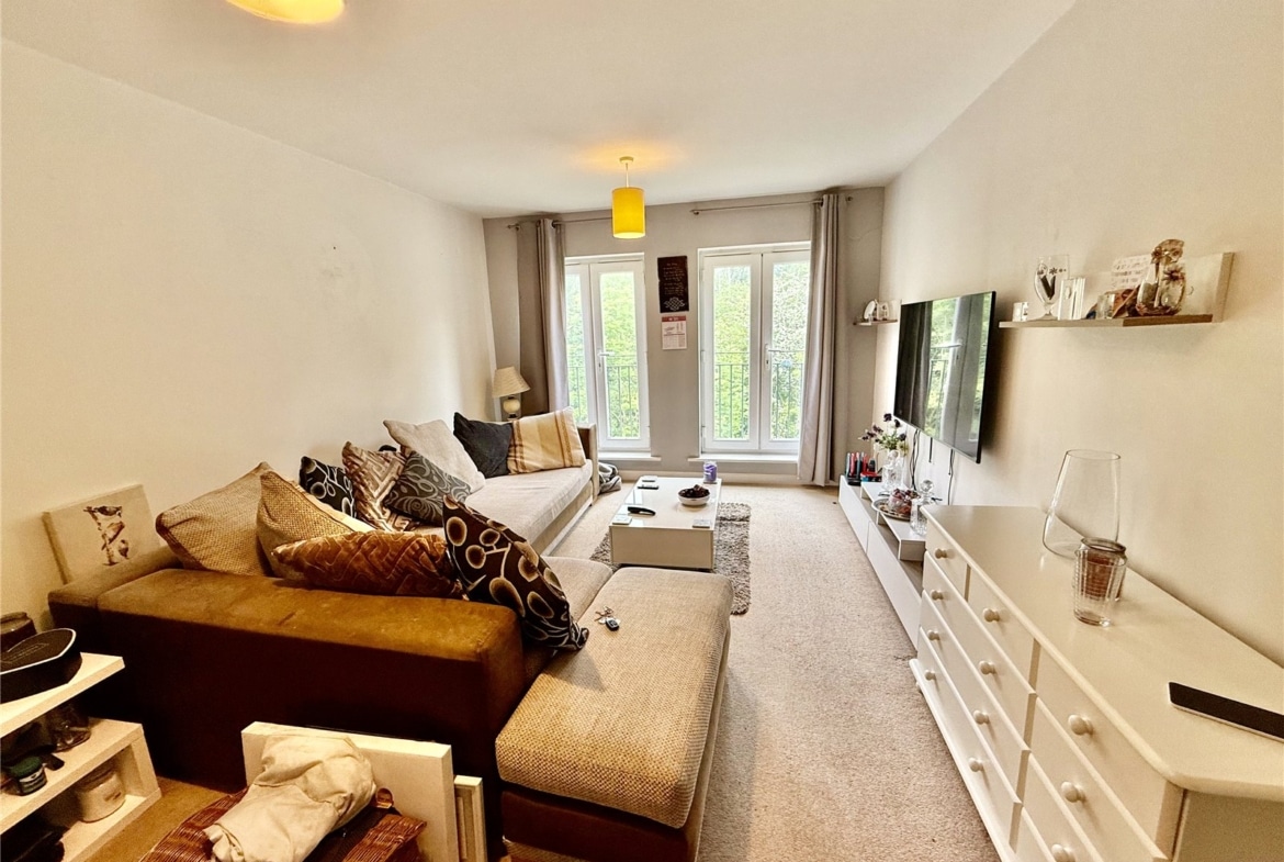 Both bedrooms are generously sized doubles and feature fitted wardrobes. The master bedroom benefits from its own ensuite shower room, while the main family bathroom includes a shower over the bath. With windows in every room, the apartment is filled with natural light throughout. Additional features include gas central heating and one allocated parking space.