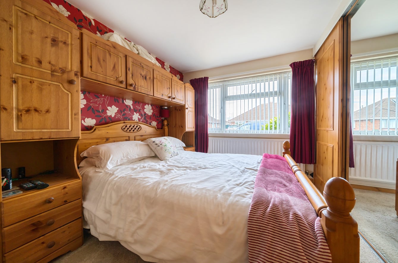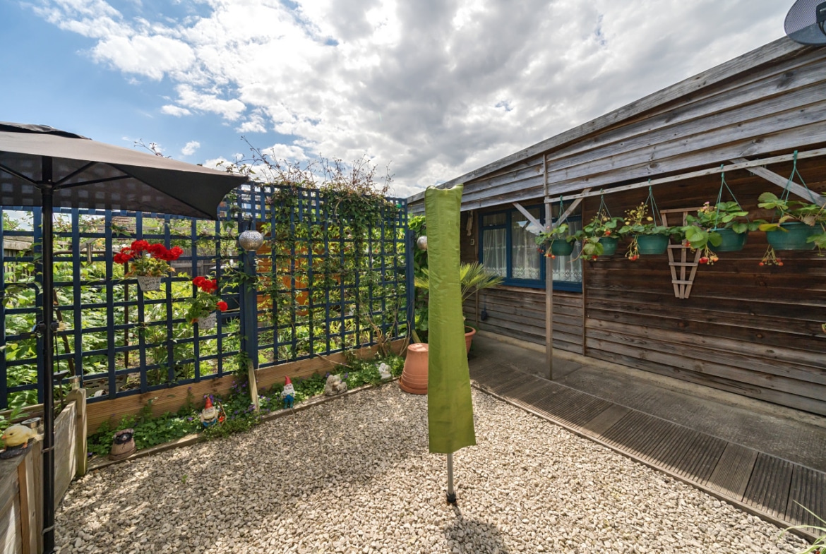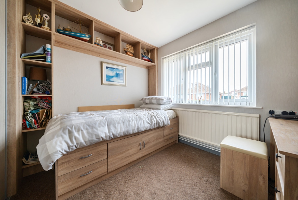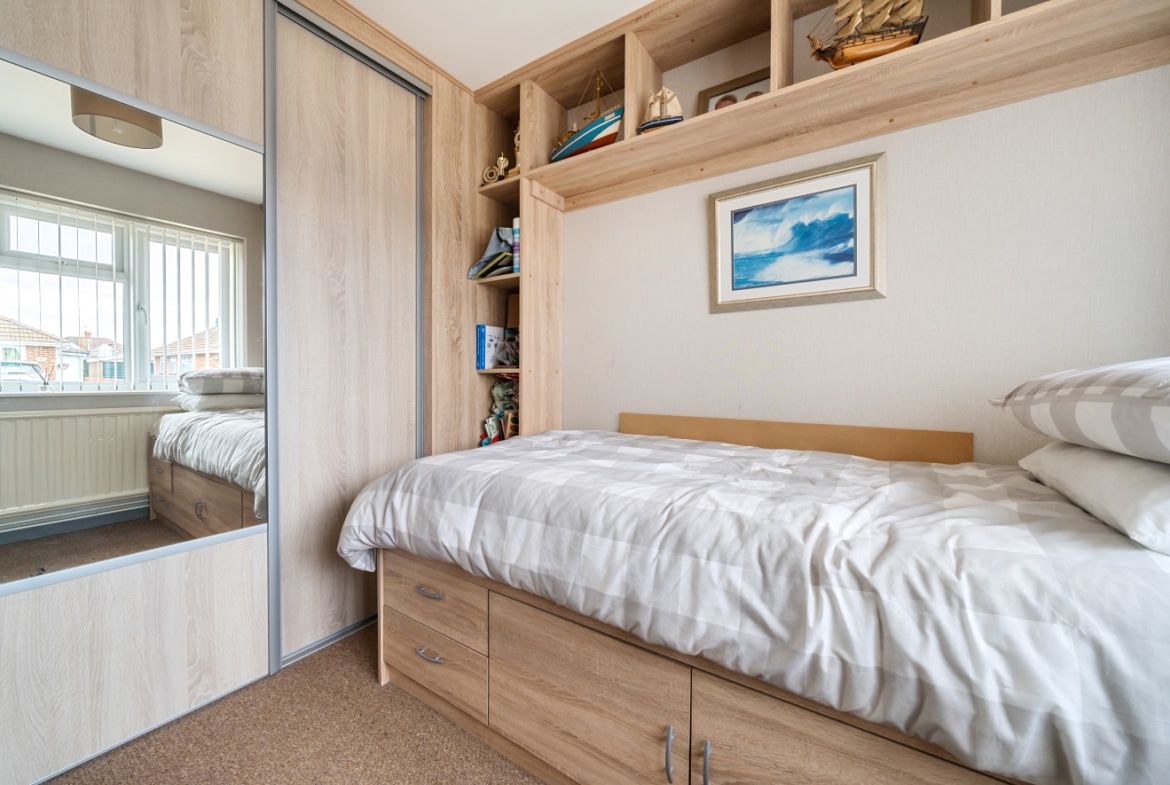 Upon entering the bungalow, you’ll find two bedrooms. The first bedroom is a comfortable double room with built-in wardrobes, providing plenty of storage. The second bedroom is currently set up as a single room but can easily accommodate a double bed if desired. It also features built-in wardrobes, maximizing space and functionality.