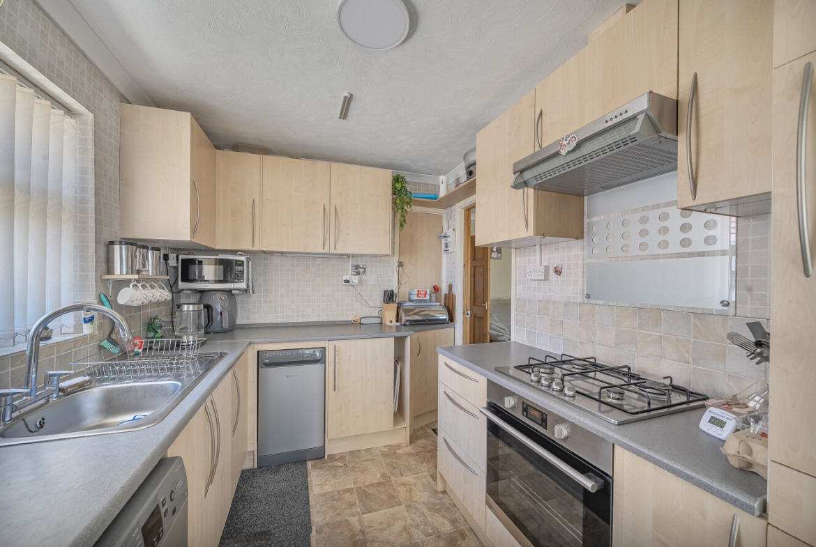 The kitchen is well-equipped and boasts integrated appliances, including a fridge freezer and dishwasher. It also features a larder cupboard and a gas hob with an electric oven, catering to all your culinary needs. At the back of the kitchen, there is a porch area with fitted units, providing additional storage space and utility.