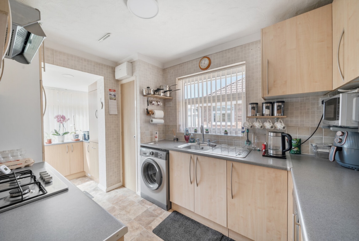 As you approach the bungalow, you’ll notice a generous driveway that can accommodate up to 4 cars, providing ample off-street parking. Behind the driveway, there is a large garage with power, offering additional storage space. At the back of the garage, there is also room for a tumble dryer.