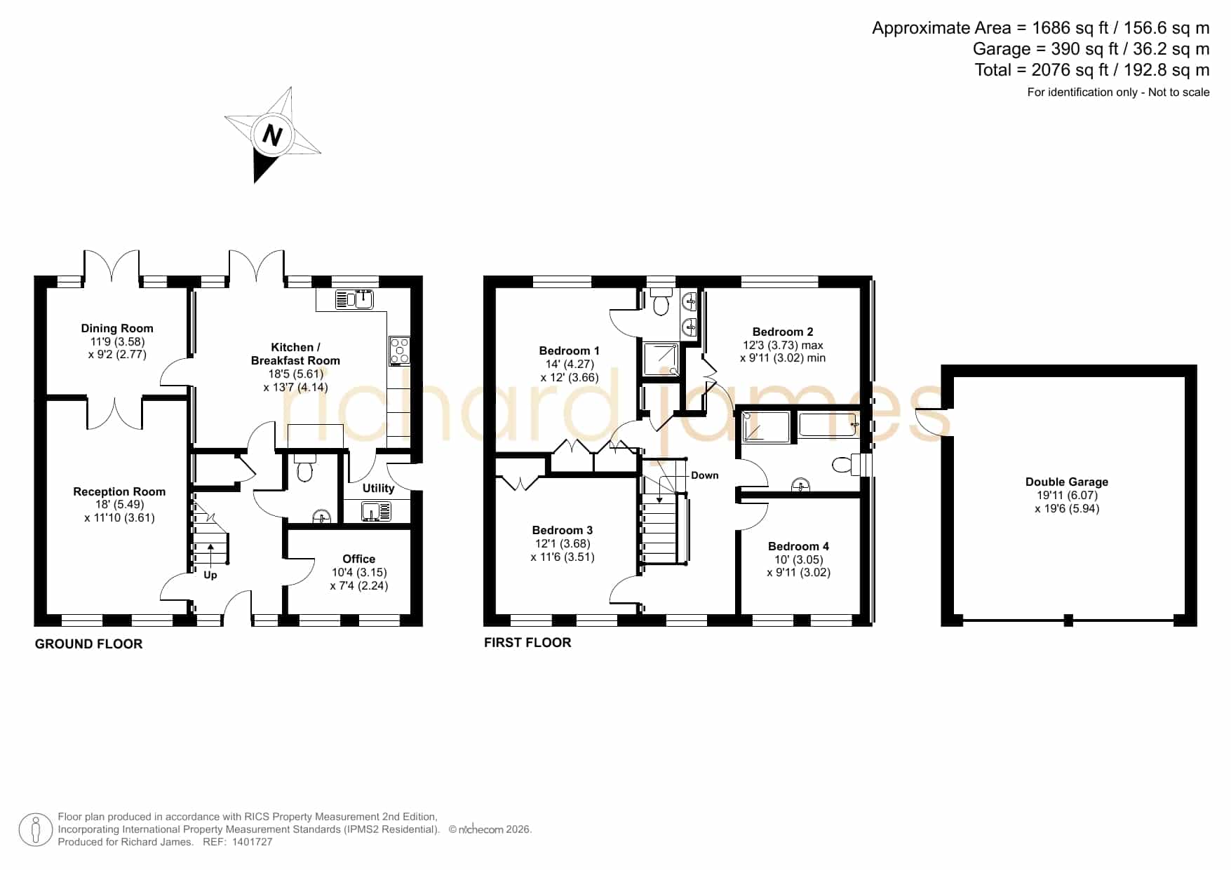 The property is set back from the road with a generous driveway leading to a detached double garage, providing ample off-road parking and storage. Internally, the accommodation is both spacious and versatile, extending to approximately 1,686 sq ft of well-planned living space, with an additional 390sq ft within the garage.