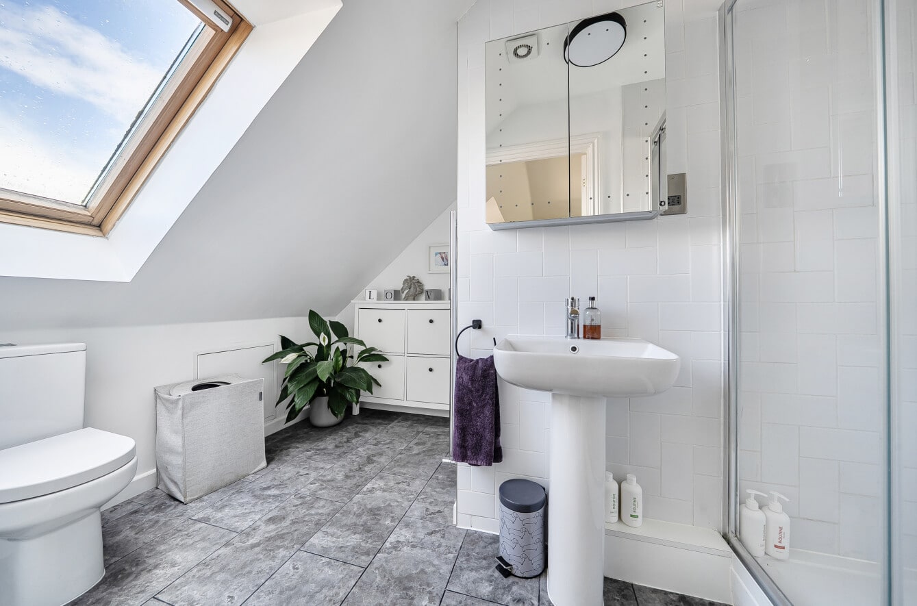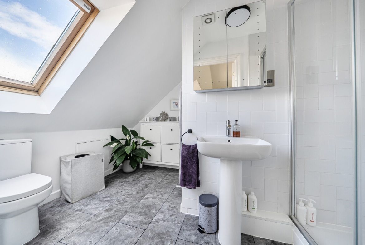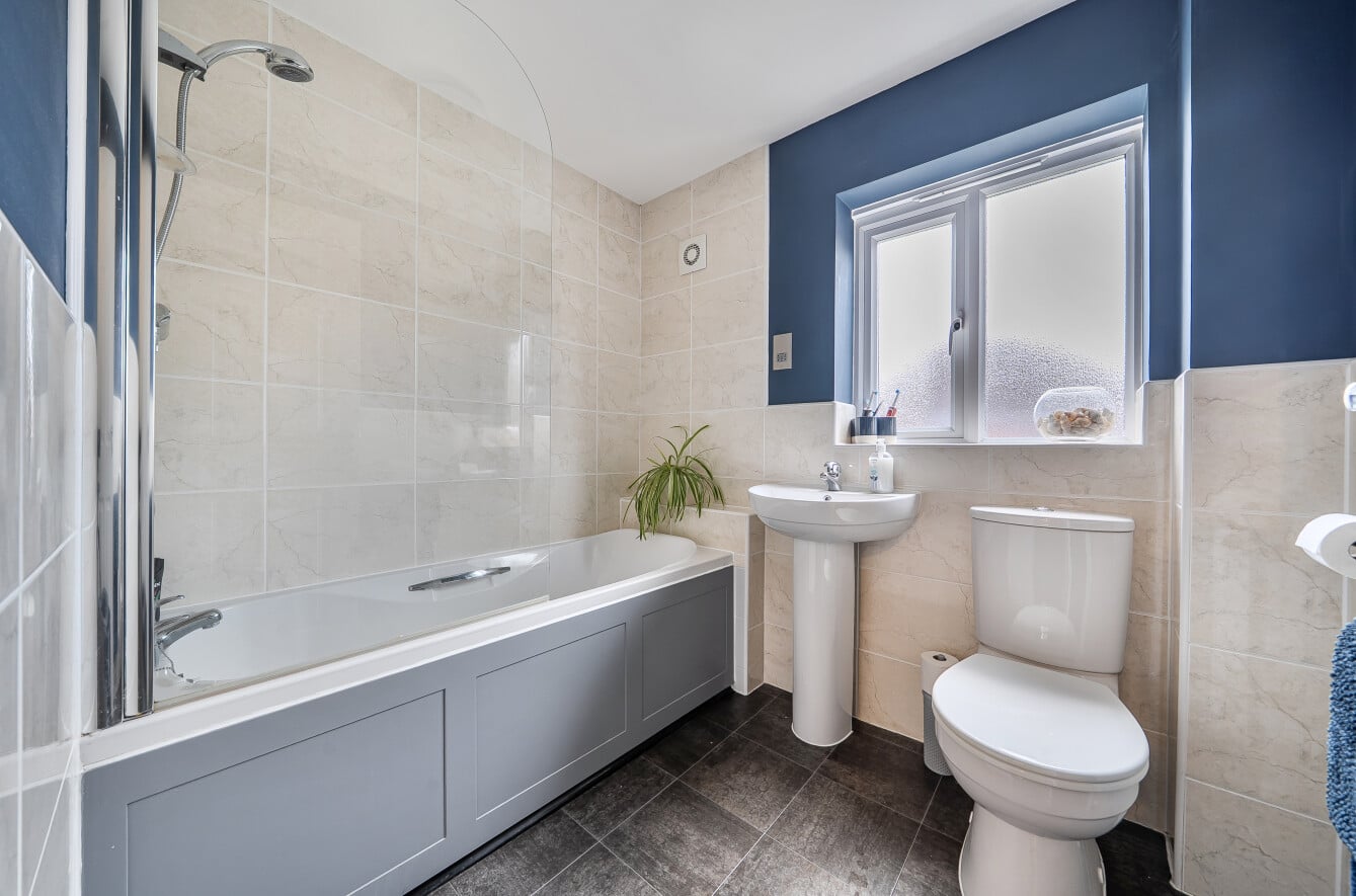 Ascending to the first floor, you’ll find three well-proportioned bedrooms. Bedroom 2 measures approximately 12 square meters and also offers an en-suite shower room, offering a comfortable space for family members or guests. Bedroom 3, slightly smaller at around 9.3 square meters, is ideal as a child’s room, home office, or guest bedroom. The family bathroom on this level is modern and functional, fitted with contemporary fixtures to meet all your bathing needs.