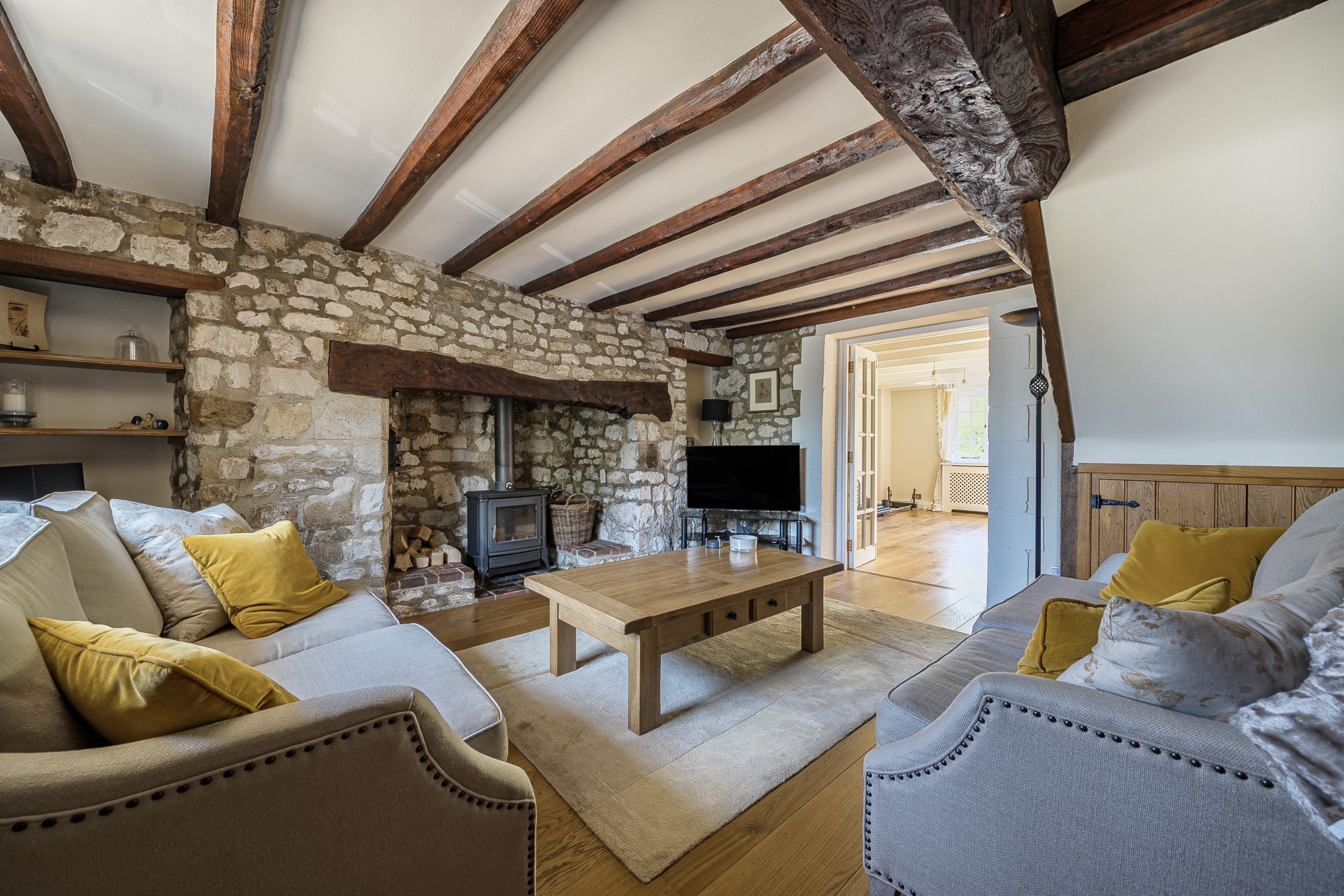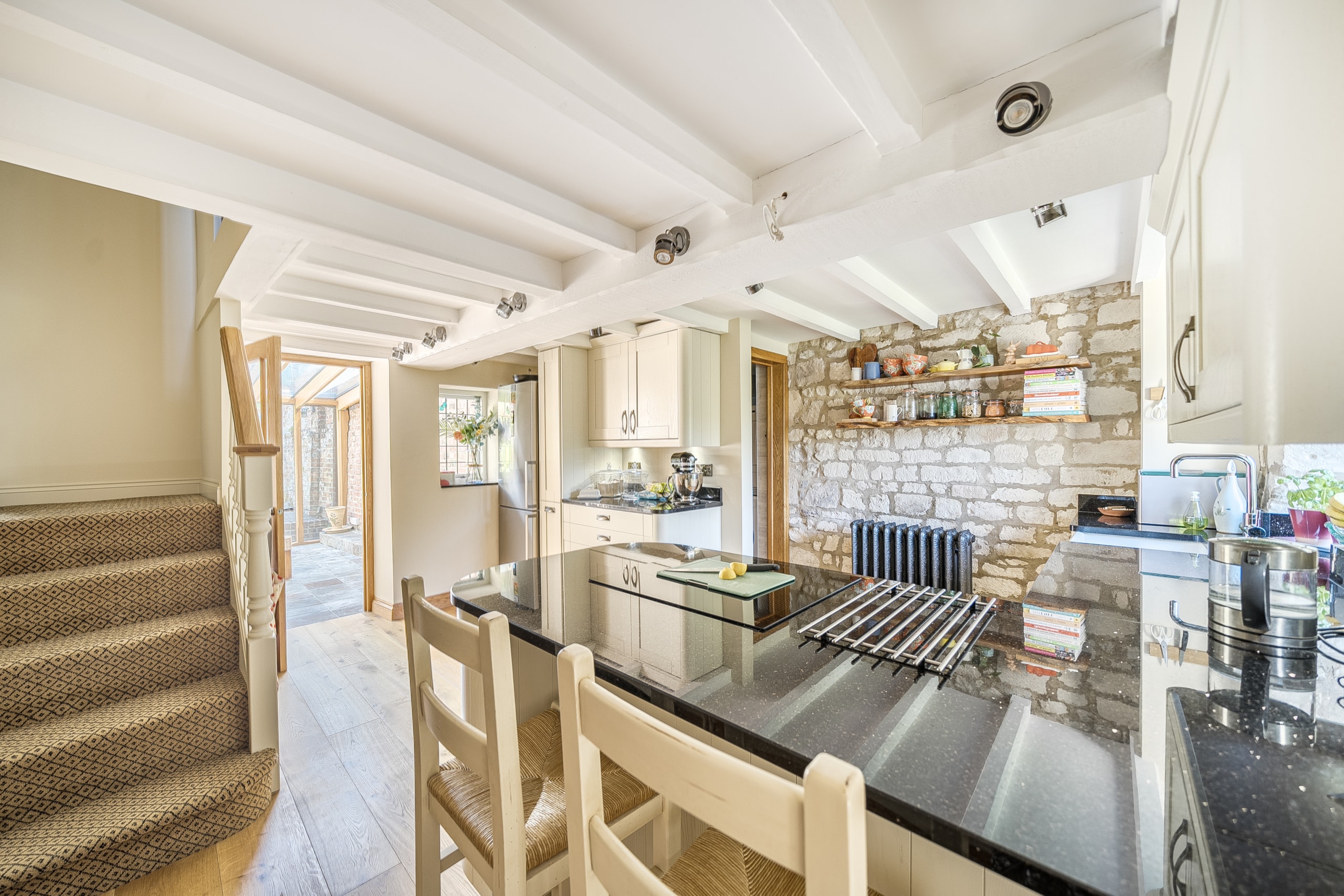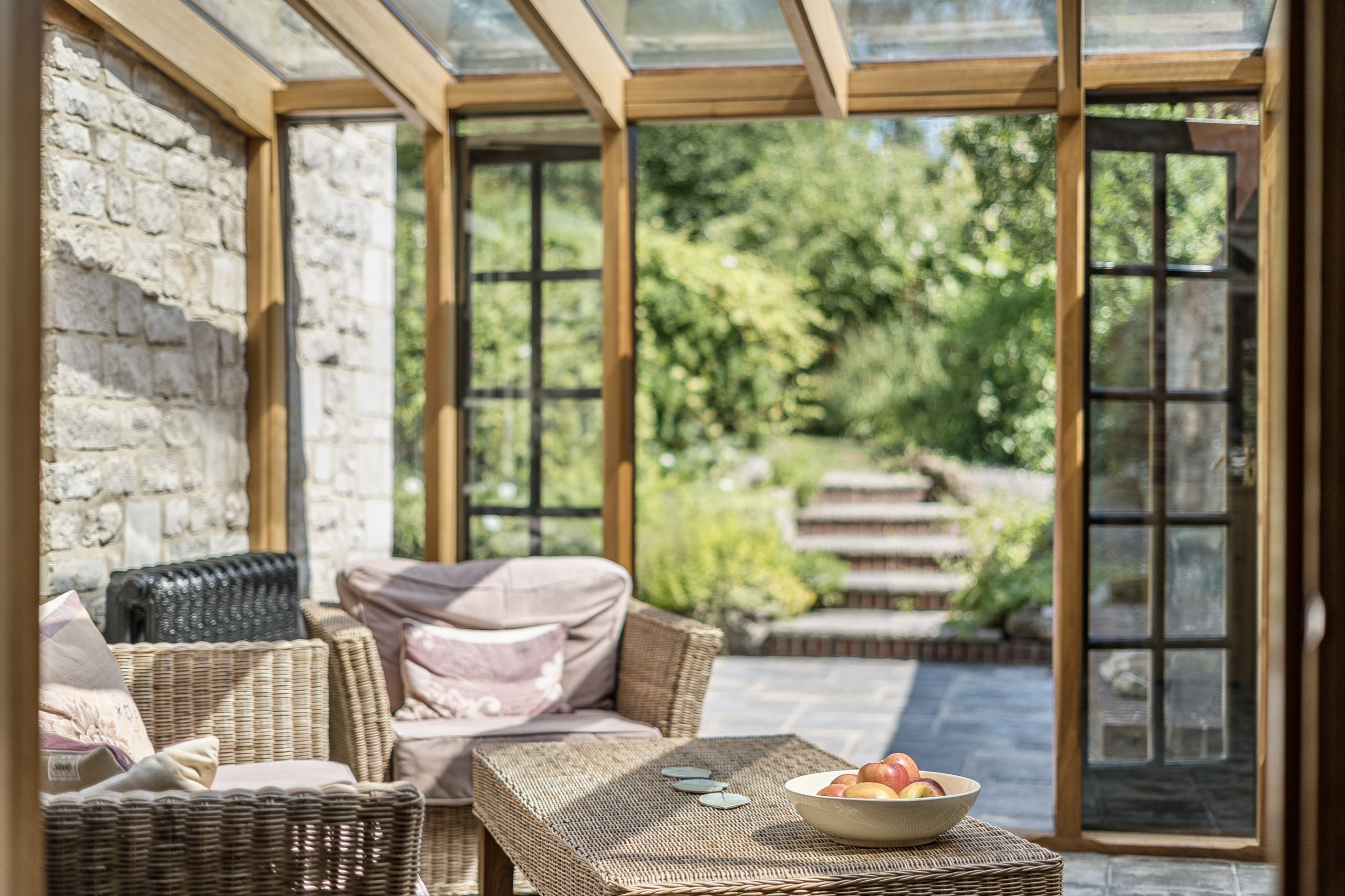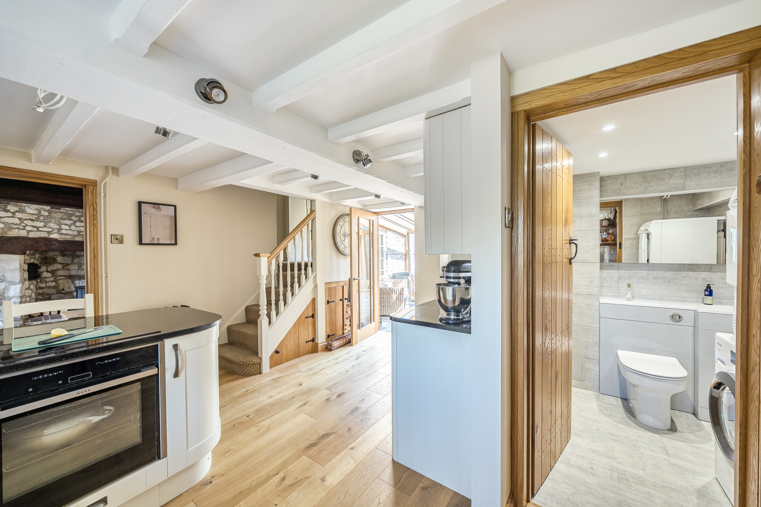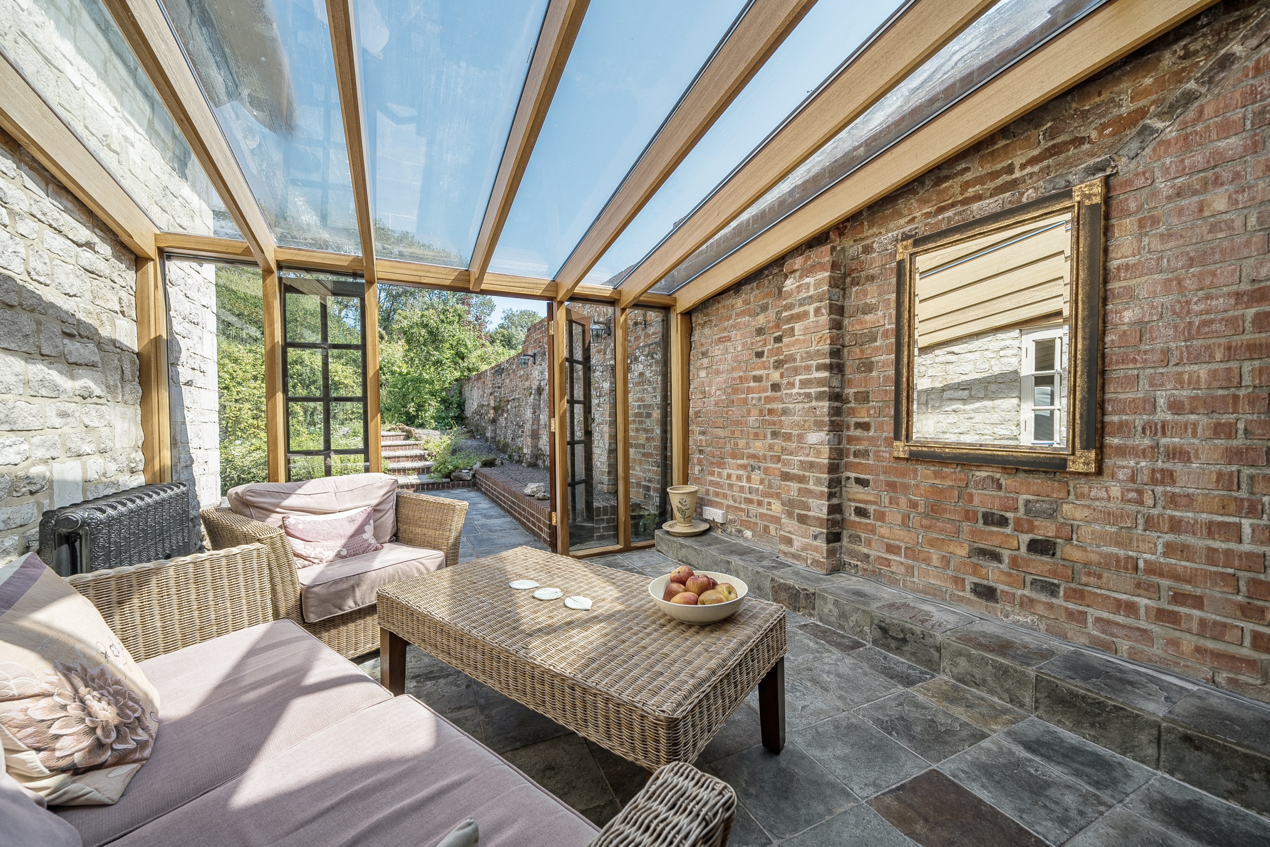 Just off the kitchen lies a stunning Sun room, seamlessly connecting the indoors with the outside. With exposed stone walls and a timber-framed glass roof, this character-filled space is bathed in light and offers tranquil views of the garden. French doors open onto a paved terrace and landscaped steps, ideal for morning coffee or evening gatherings.