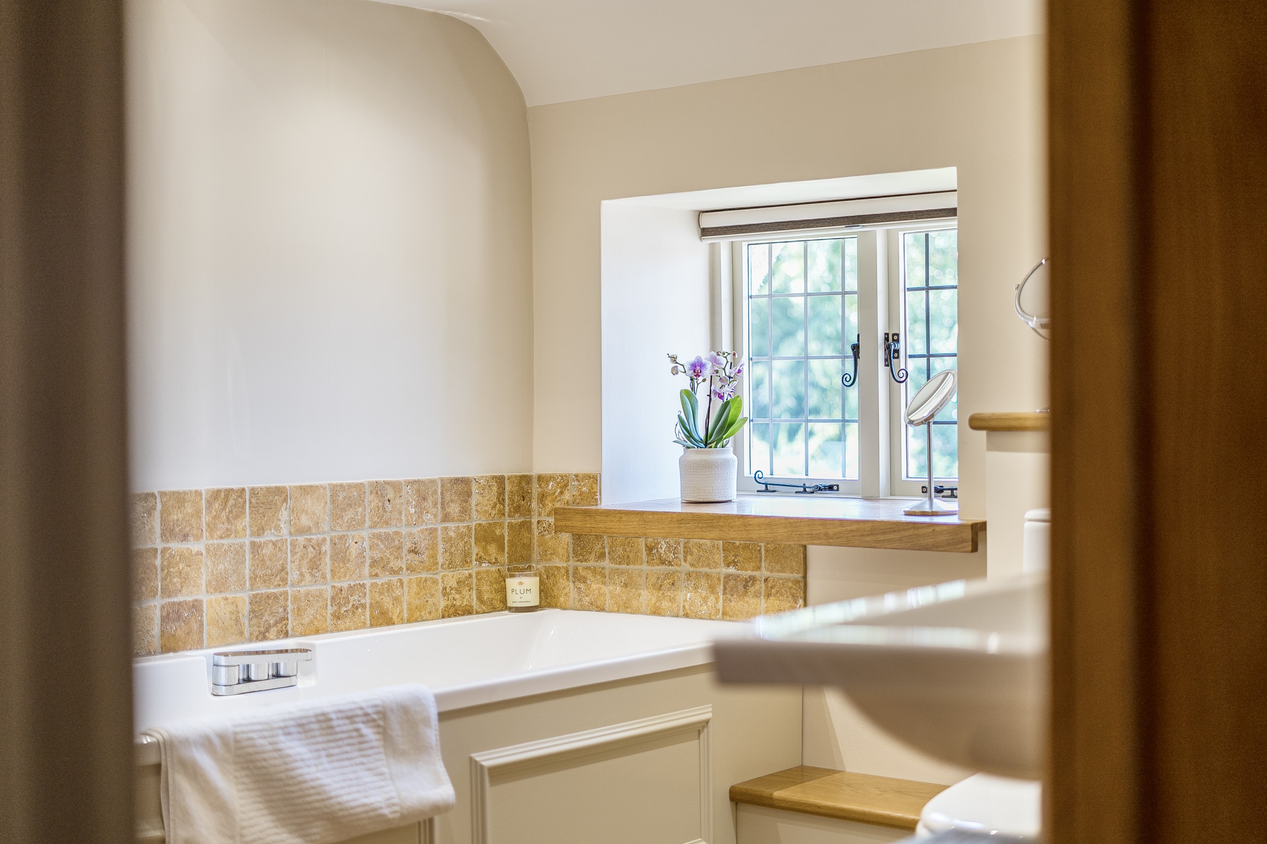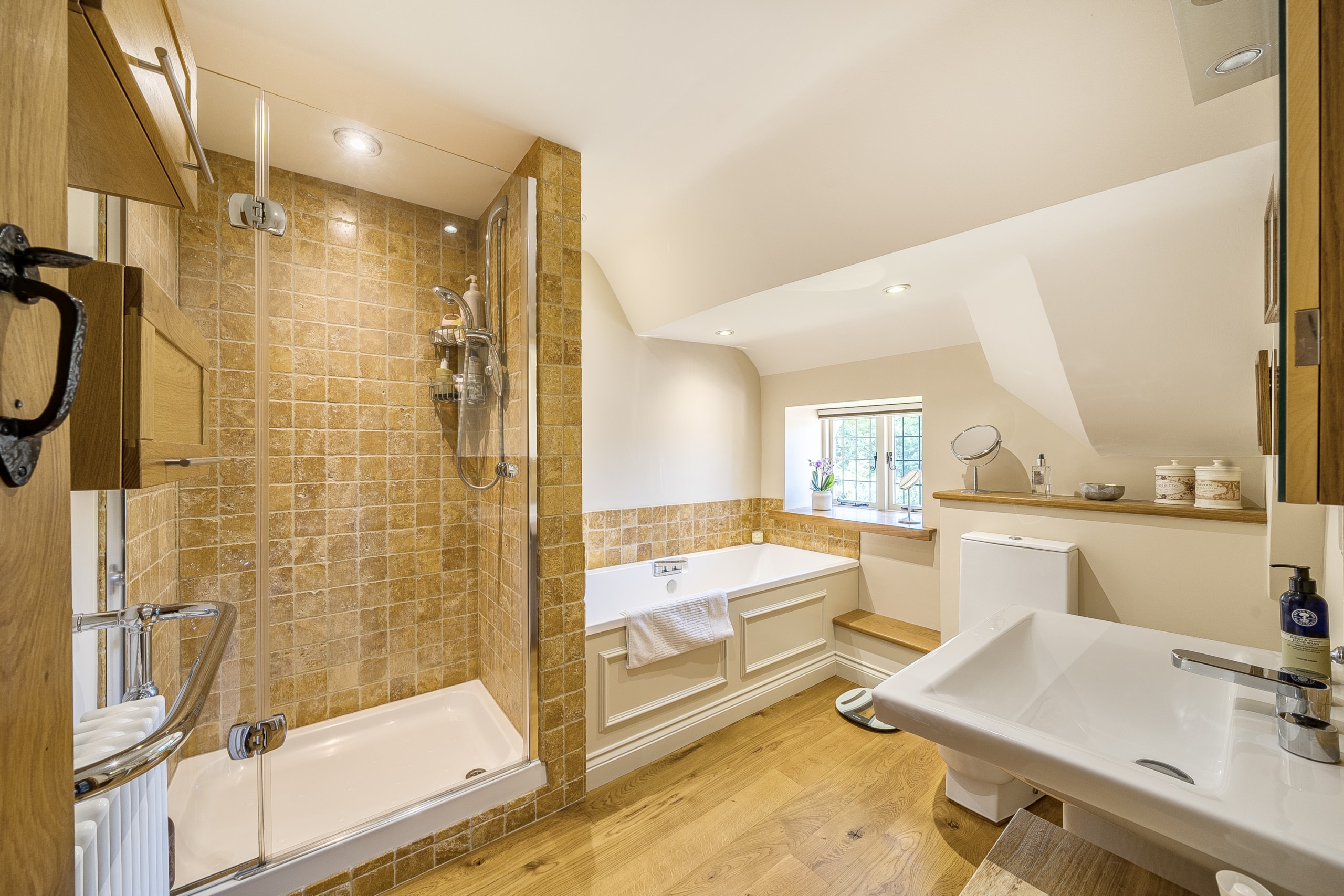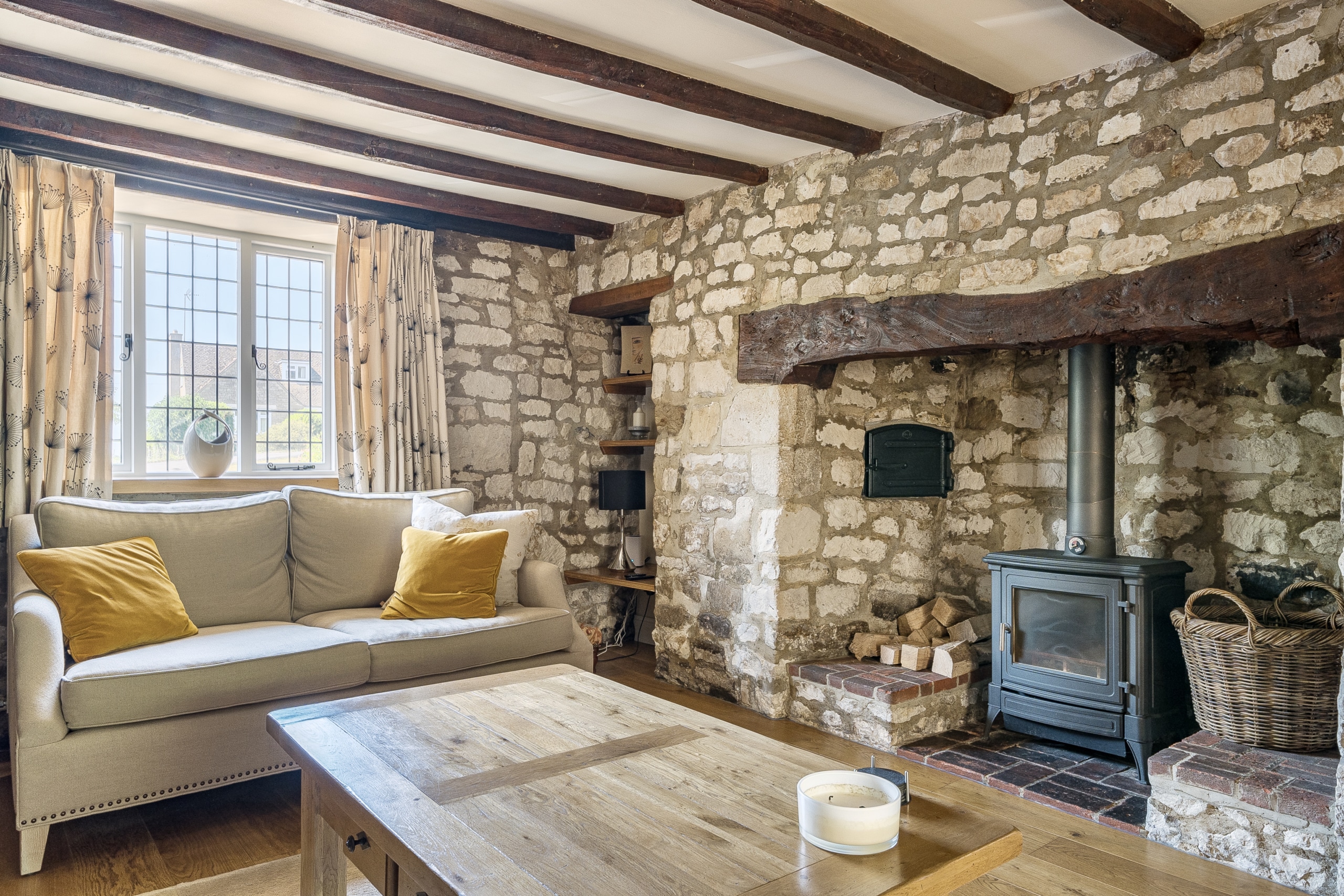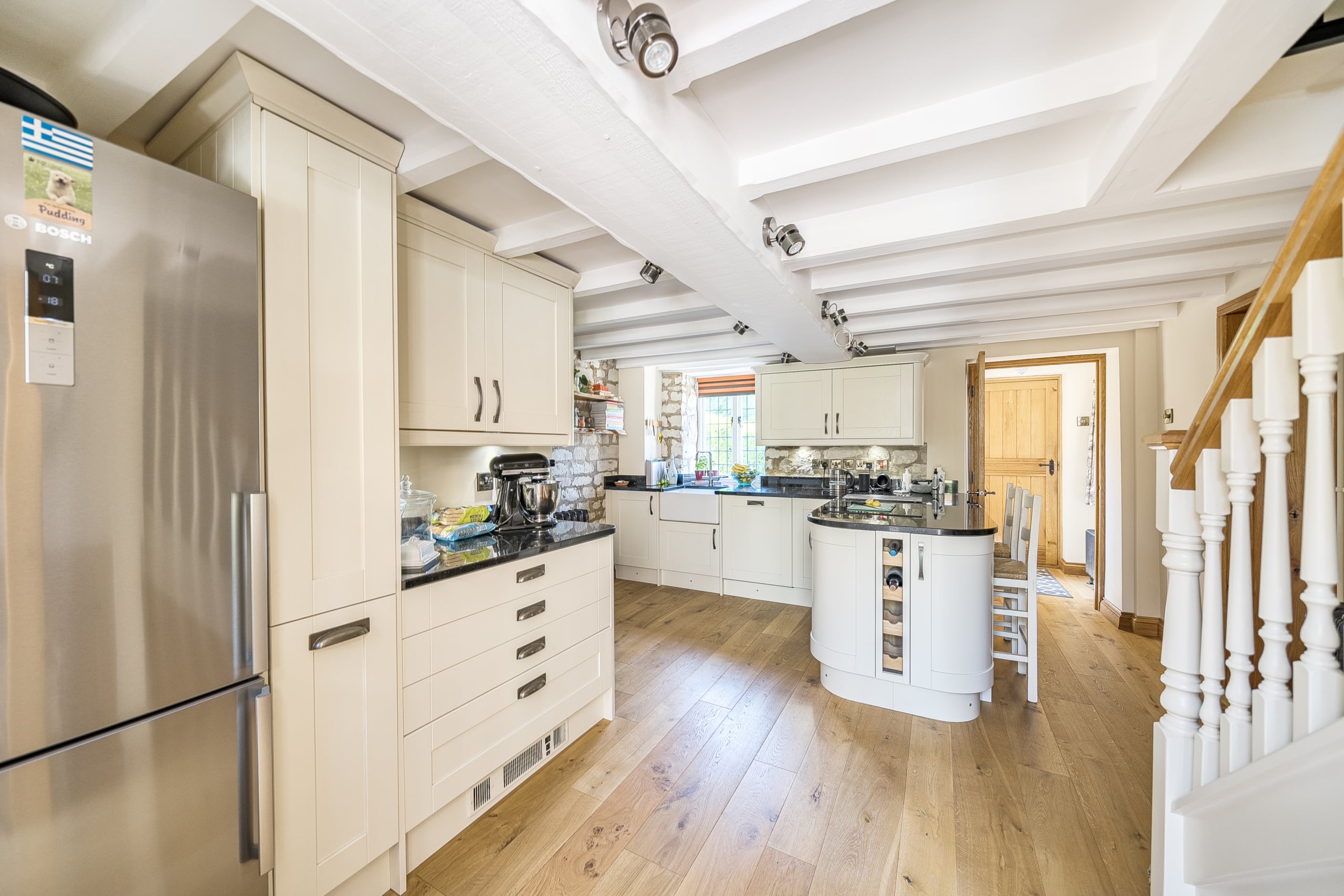 Just off the kitchen lies a stunning Sun room, seamlessly connecting the indoors with the outside. With exposed stone walls and a timber-framed glass roof, this character-filled space is bathed in light and offers tranquil views of the garden. French doors open onto a paved terrace and landscaped steps, ideal for morning coffee or evening gatherings.
