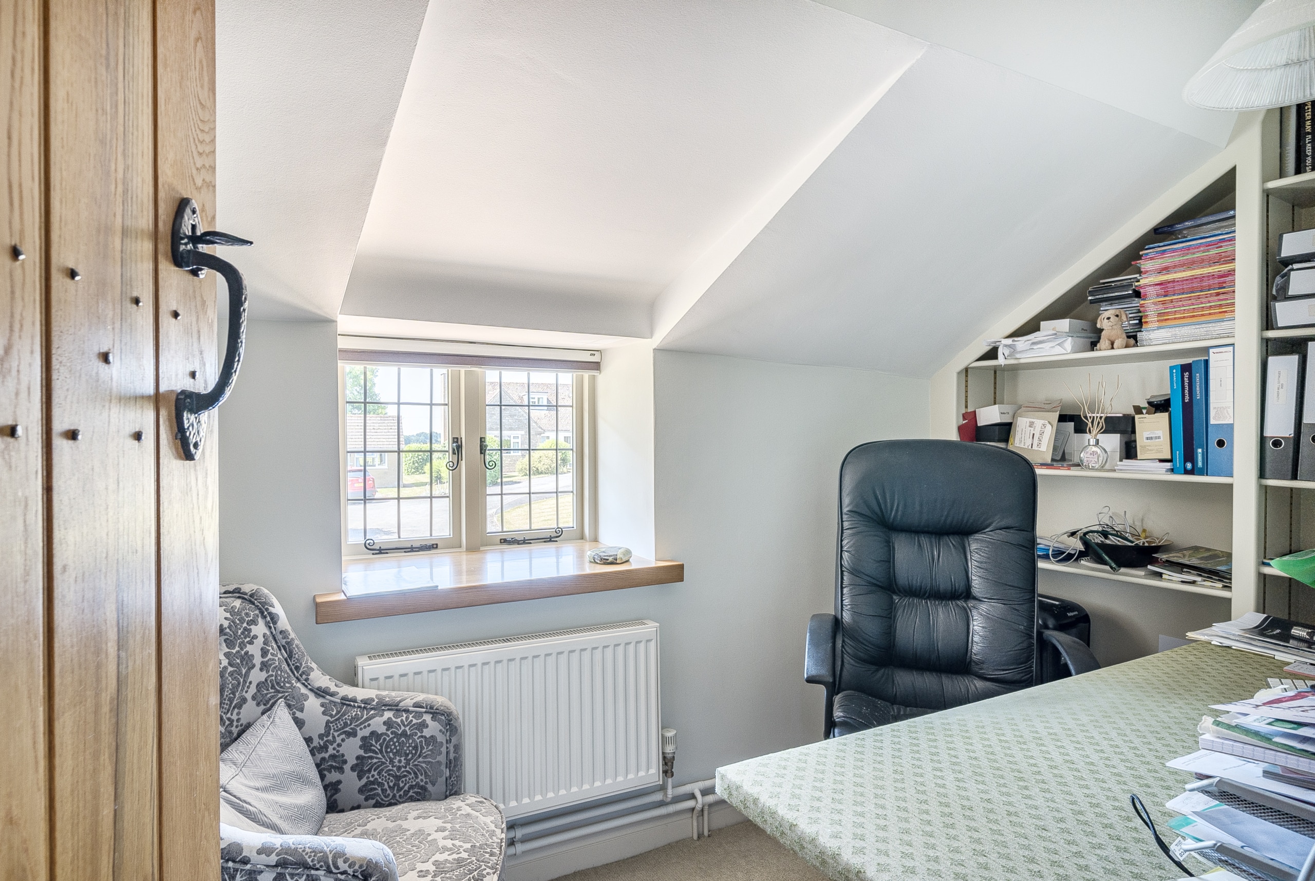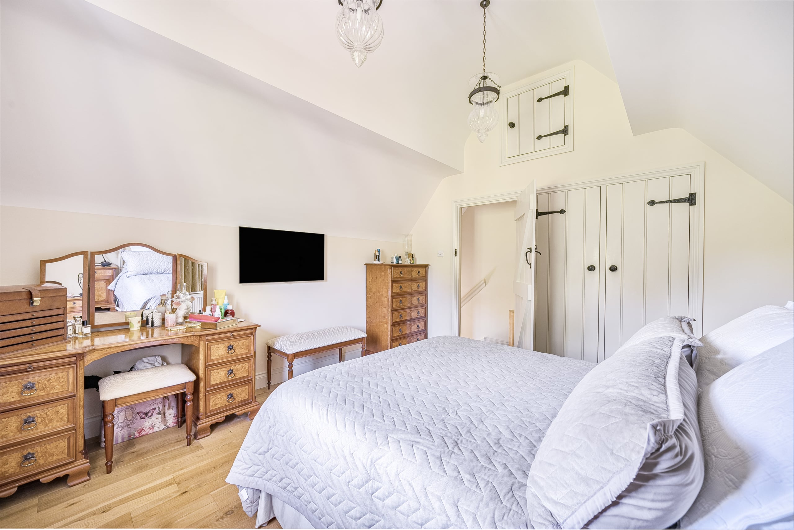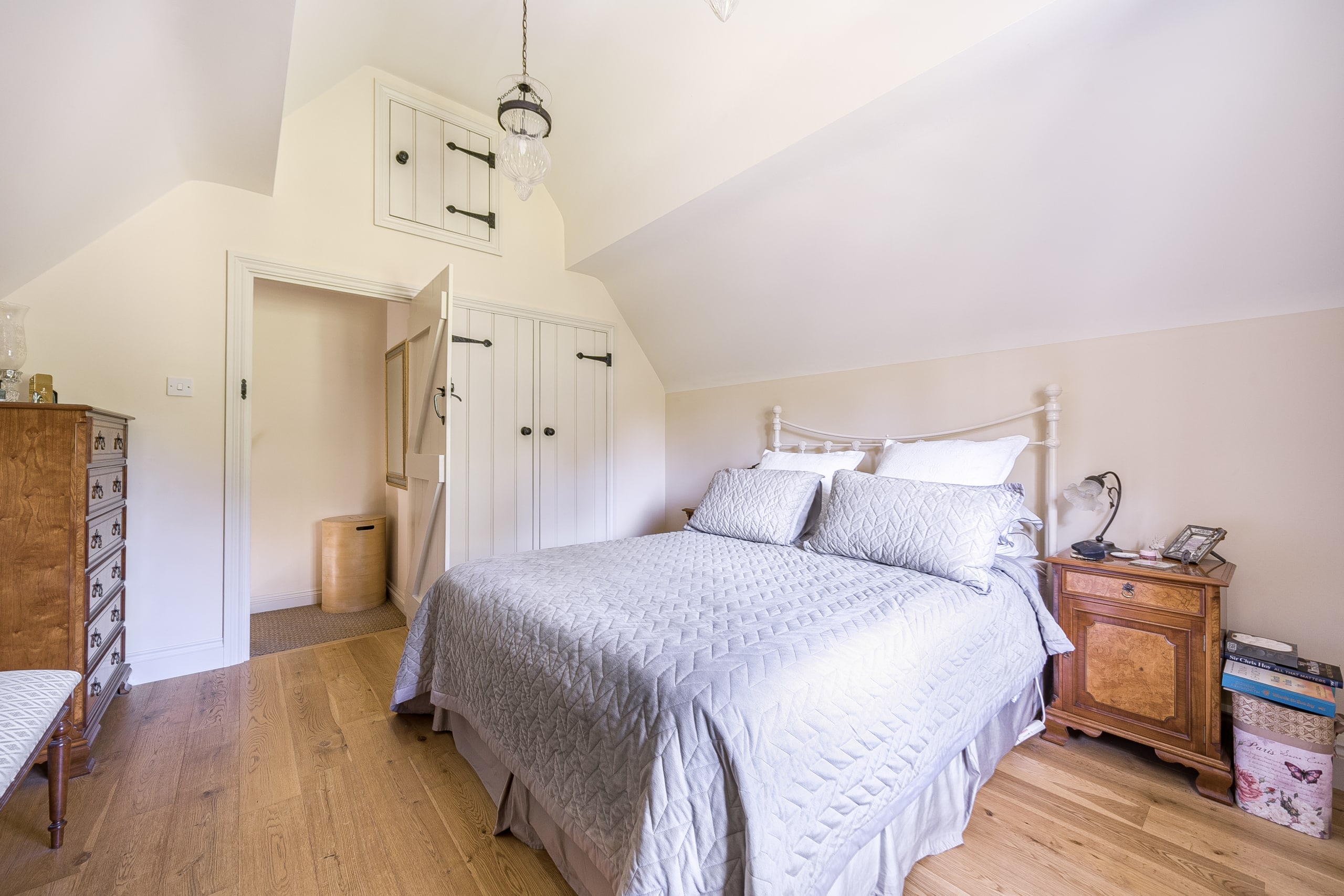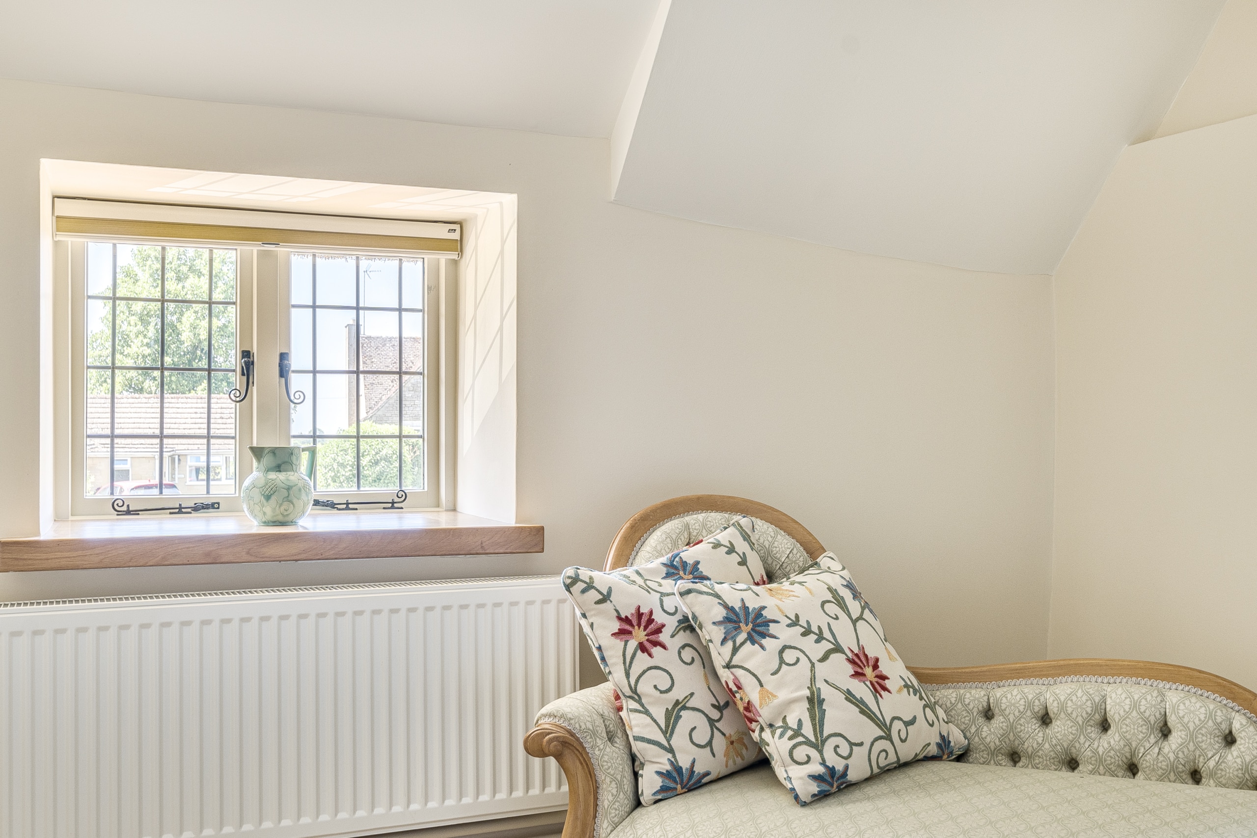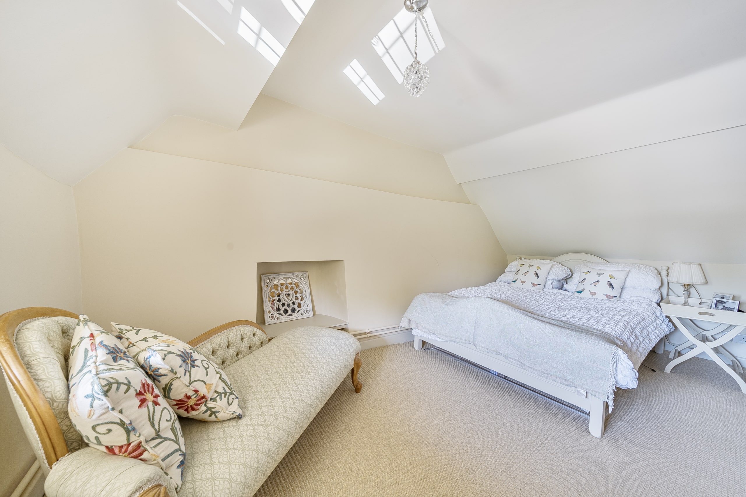 Just off the kitchen lies a stunning Sun room, seamlessly connecting the indoors with the outside. With exposed stone walls and a timber-framed glass roof, this character-filled space is bathed in light and offers tranquil views of the garden. French doors open onto a paved terrace and landscaped steps, ideal for morning coffee or evening gatherings.