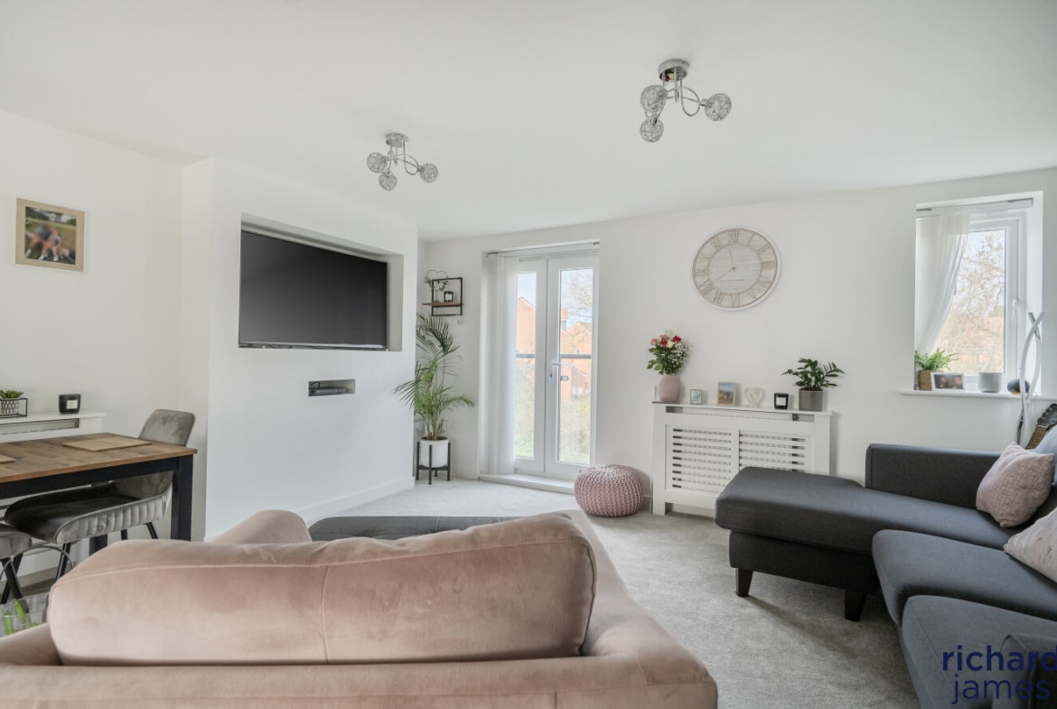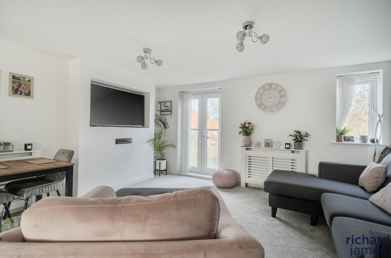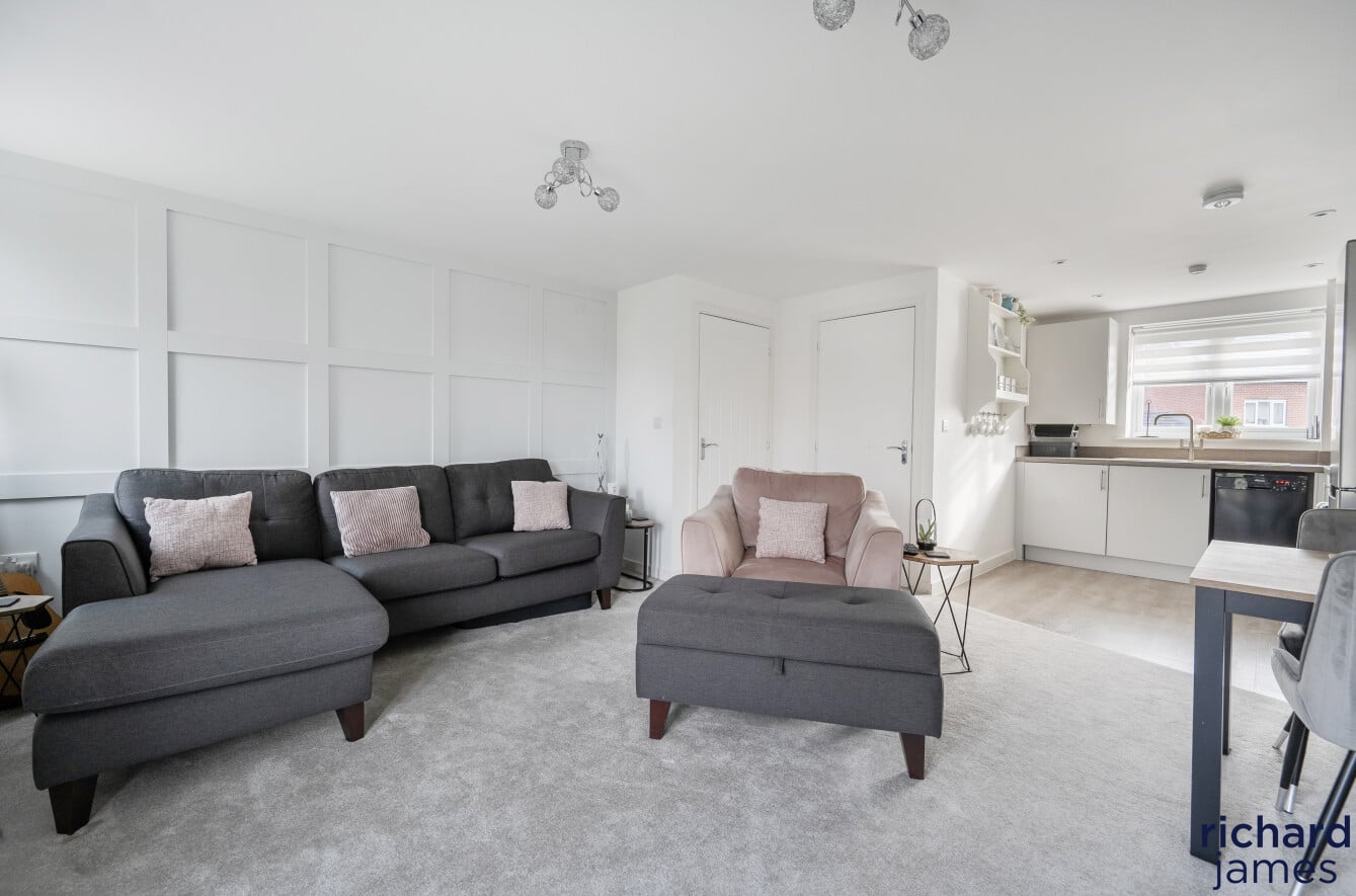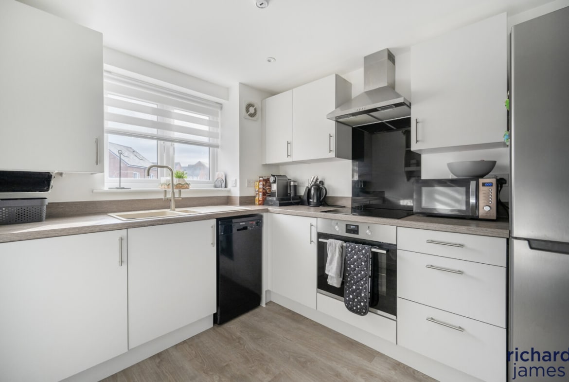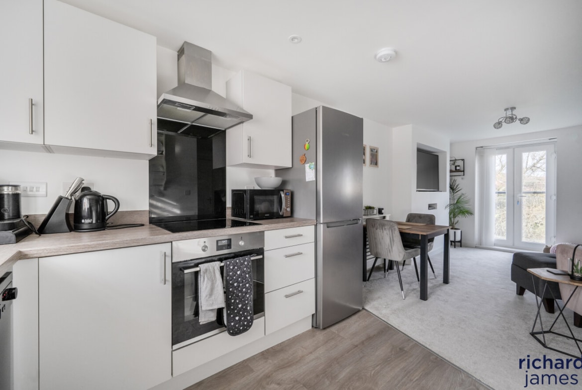The layout flows seamlessly into a separate fitted kitchen, complete with modern appliances including an integrated oven and hob. This practical space offers ample worktop and cupboard storage, making it perfect for those who enjoy cooking and preparing meals in a well-equipped environment.