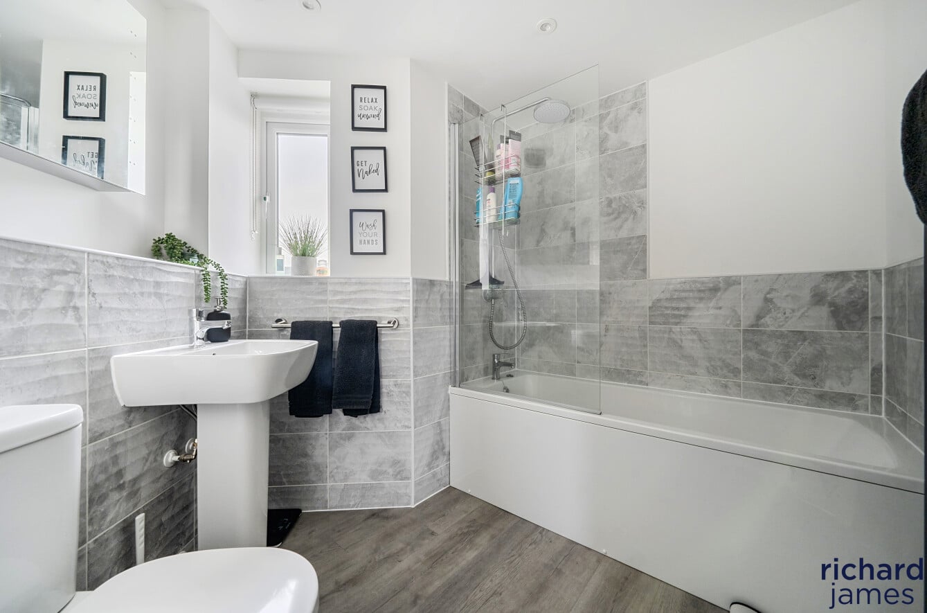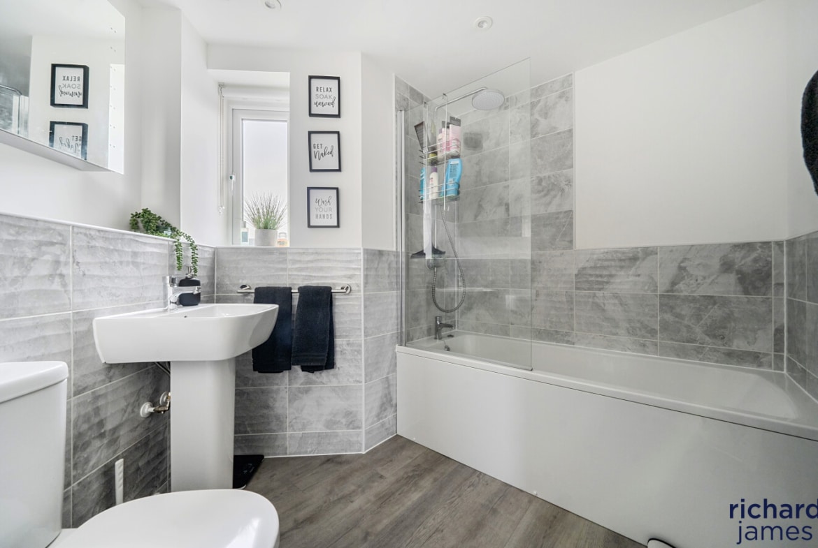 The property is complemented by a contemporary bathroom suite featuring a full-size bath with shower attachment, WC and wash basin, finished to a high standard with modern fixtures and fittings throughout.