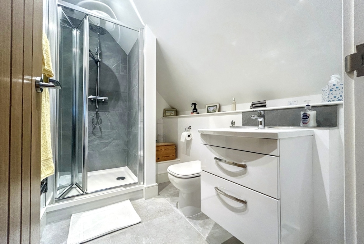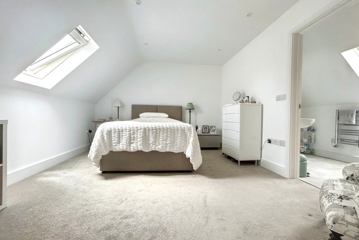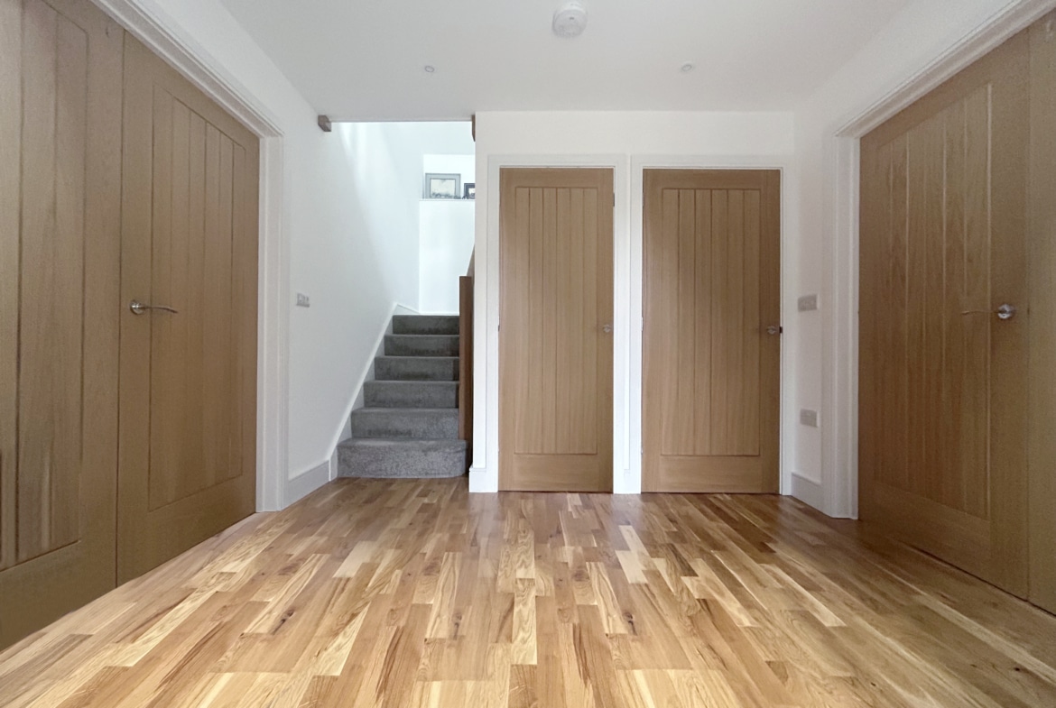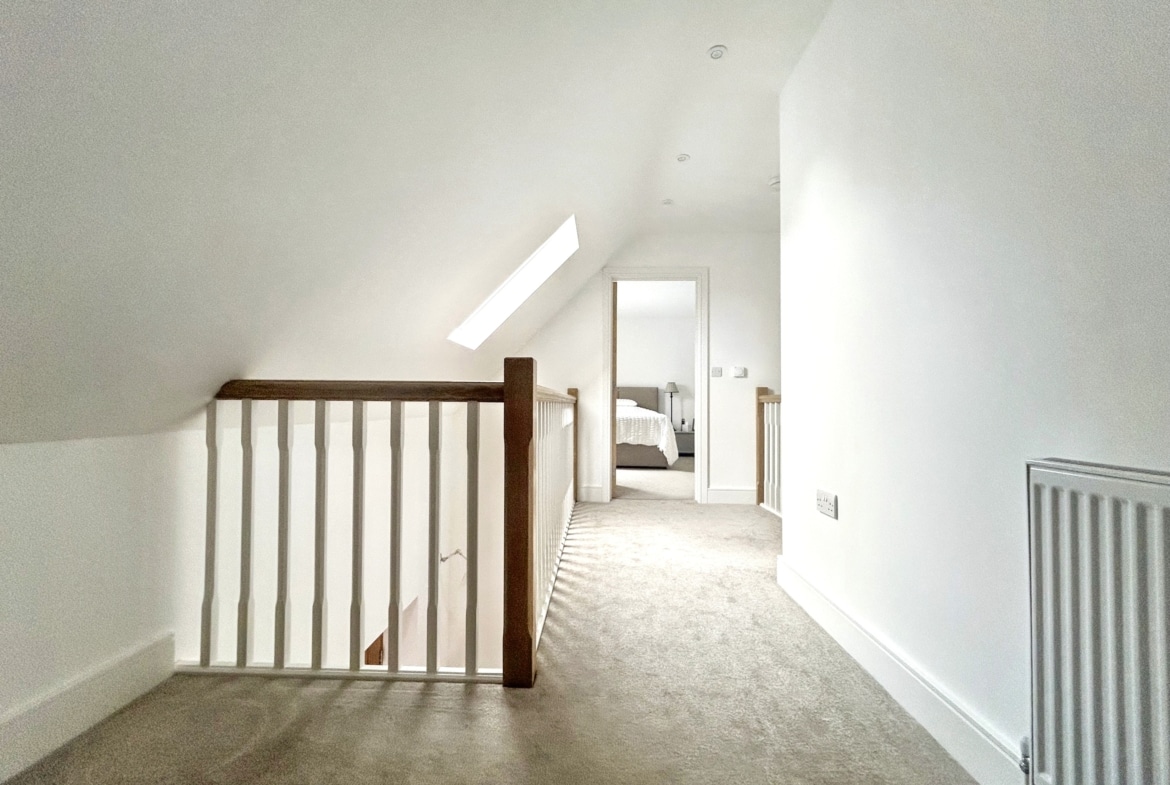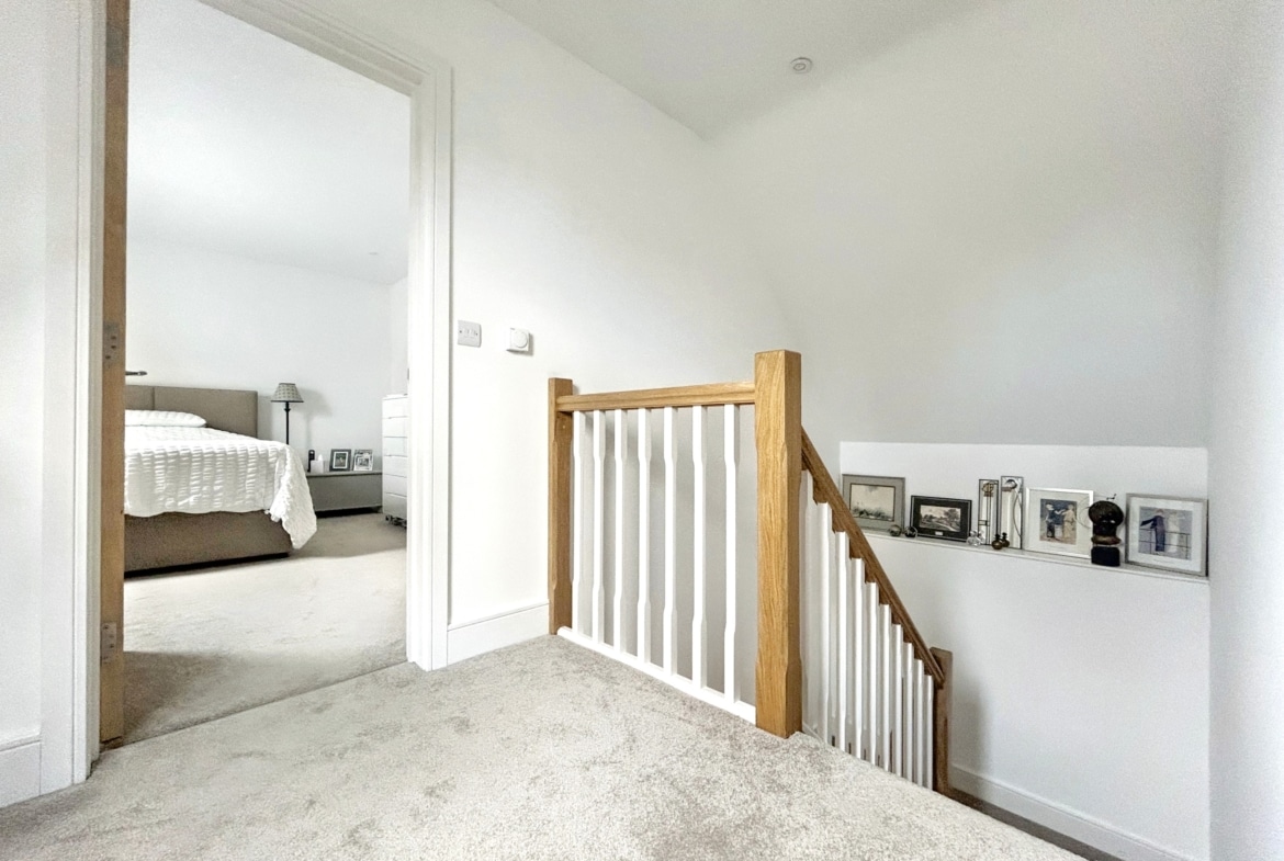 Upstairs, a spacious galleried landing leads to the principal bedroom with its own luxurious en-suite, along with two additional bedrooms and a sleek family shower room. Everything is finished to a high standard, with underfloor heating, engineered oak and porcelain tile flooring, and designer fittings by Duravit, Hansgrohe, and Acqualisa.