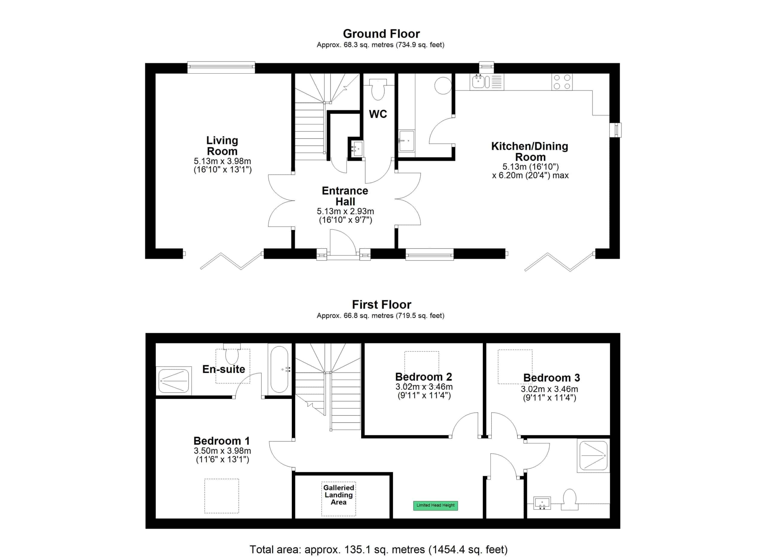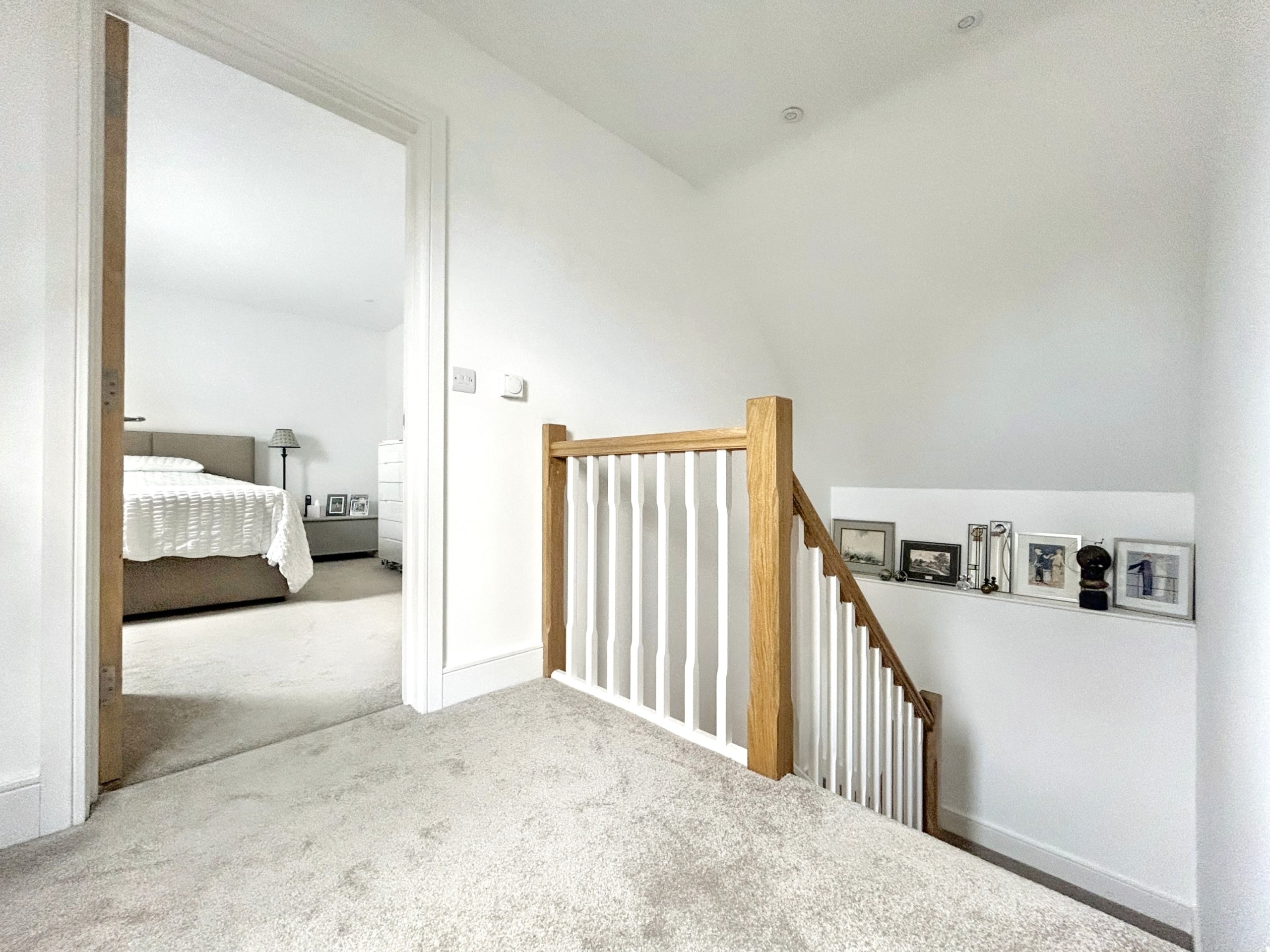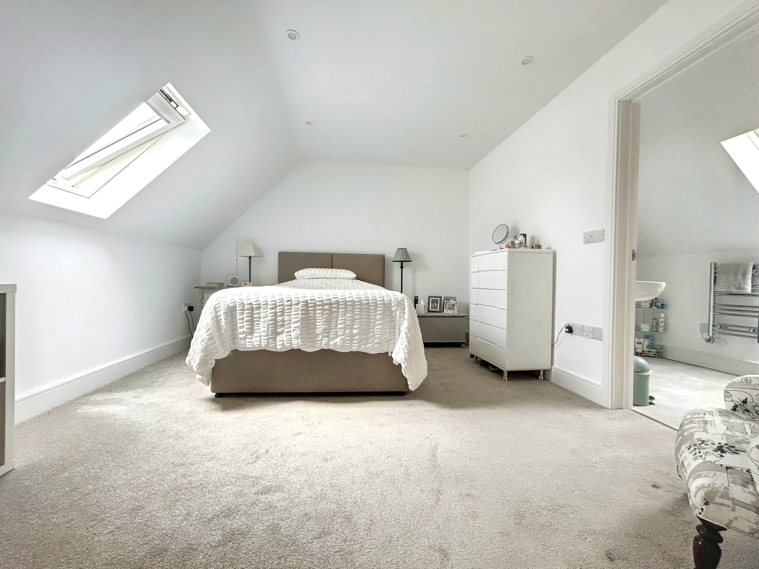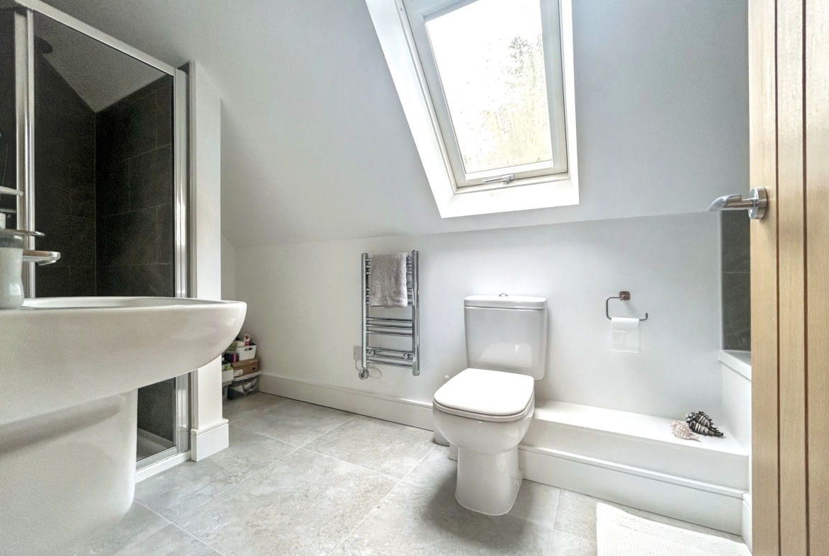 Upstairs, a spacious galleried landing leads to the principal bedroom with its own luxurious en-suite, along with two additional bedrooms and a sleek family shower room. Everything is finished to a high standard, with underfloor heating, engineered oak and porcelain tile flooring, and designer fittings by Duravit, Hansgrohe, and Acqualisa.