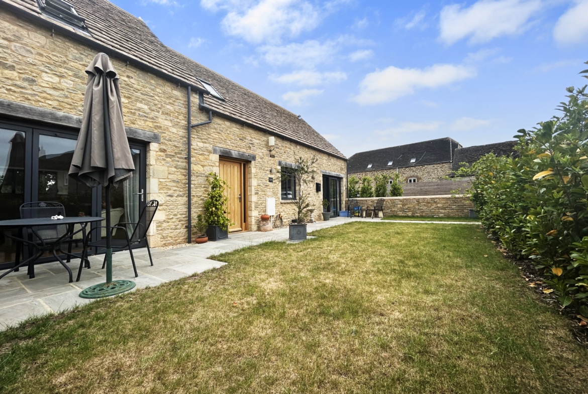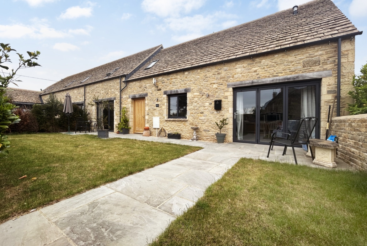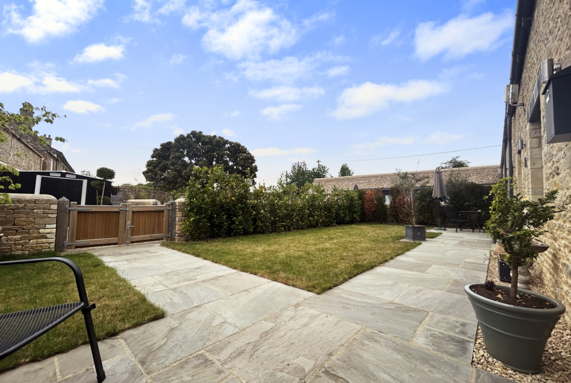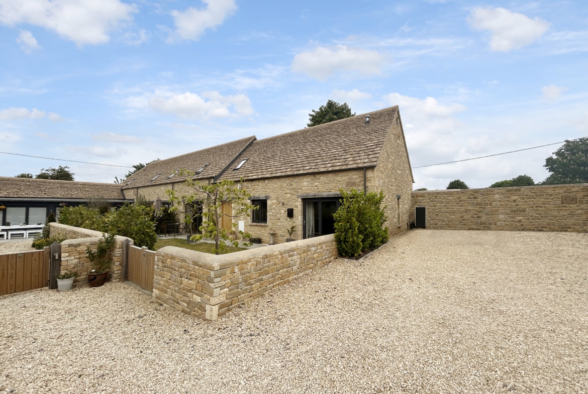 To the front, a beautifully landscaped garden is enclosed by classic Cotswold stone walling, with a wide terrace perfect for sun loungers or evening drinks. A gravel driveway provides parking for two cars, with ample turning space and EV charger.