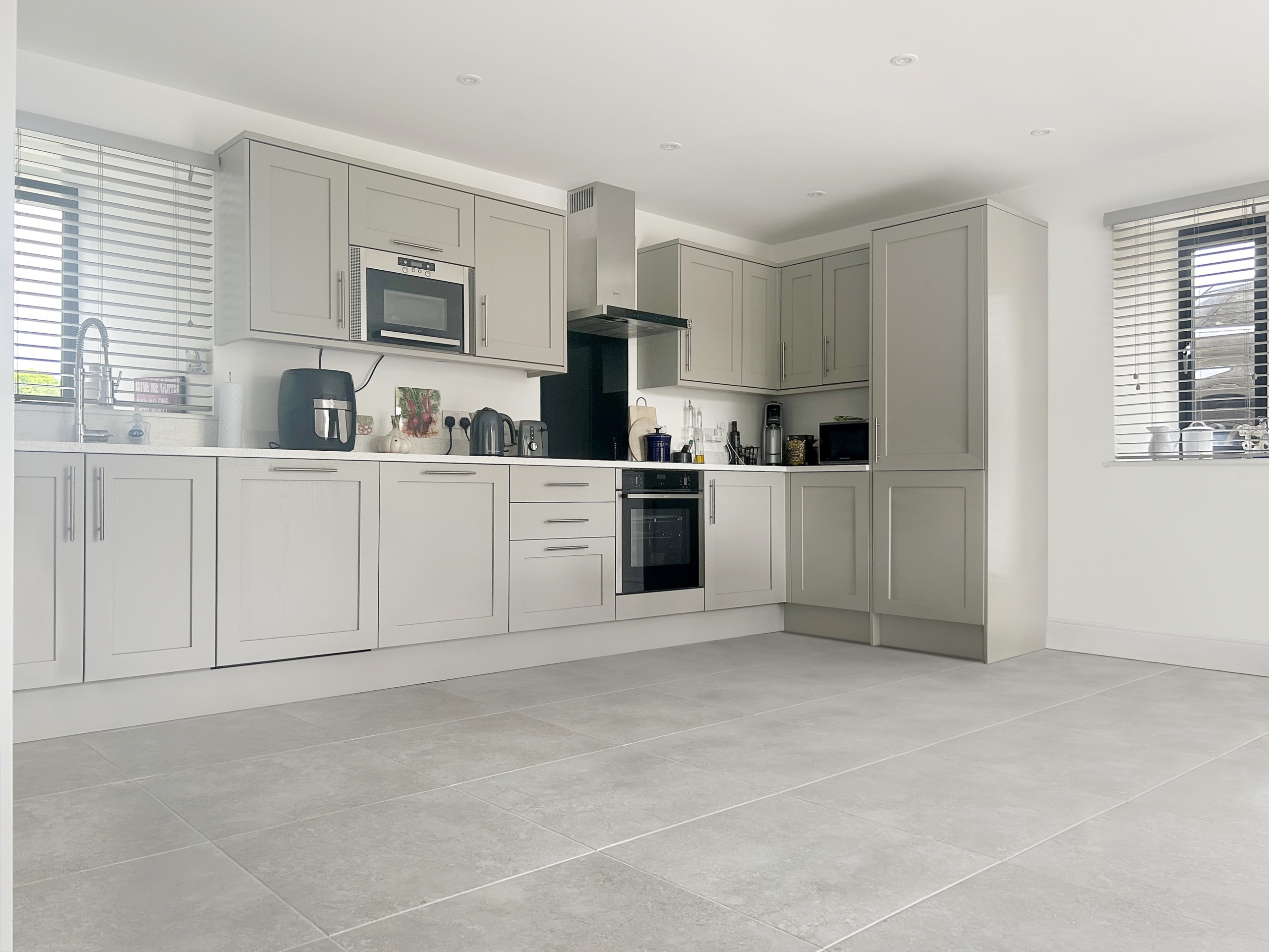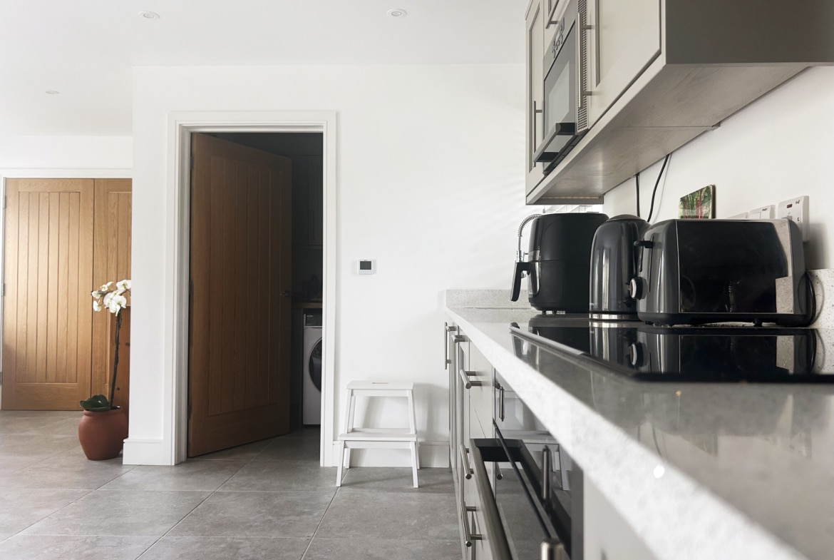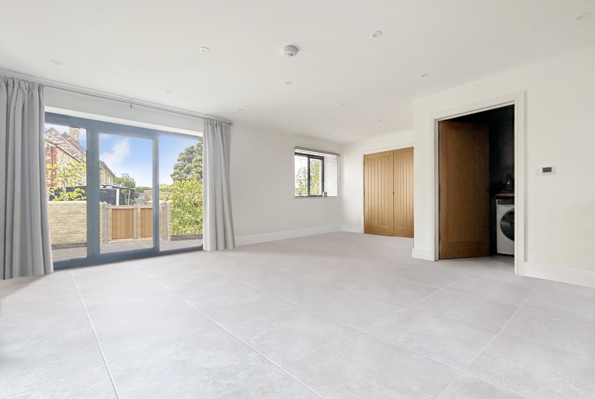 The kitchen is a true showstopper, with triple-aspect views and three full-height bi-fold doors that open out onto a sun-soaked garden terrace — perfect for morning coffee or alfresco dinners. Painted wood cabinetry and sleek pale quartz worktops provide a sophisticated backdrop to high-spec appliances, including a Neff oven, induction hob, and integrated Bosch fridge/freezer and dishwasher. There’s plenty of room to dine, gather, and make memories here. A handy utility room just off the kitchen adds extra storage and keeps things effortlessly tidy.