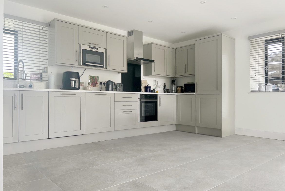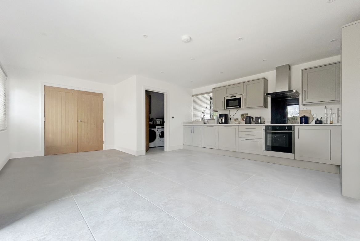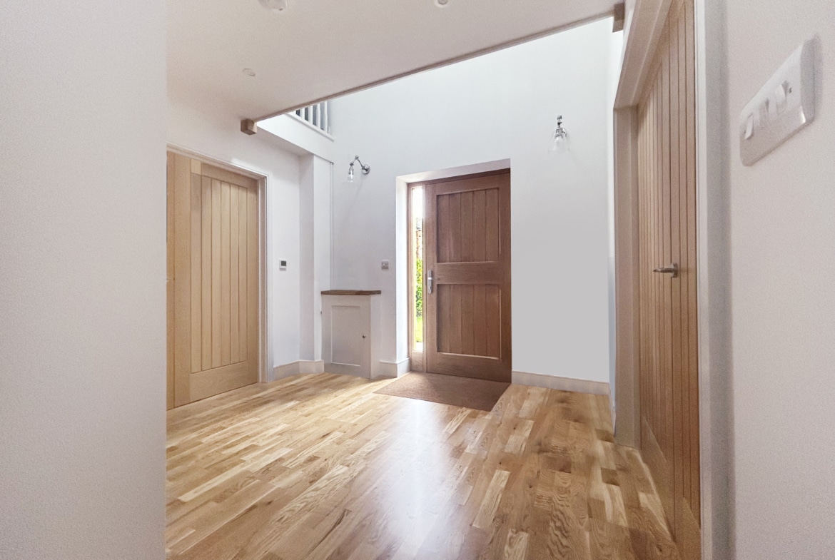 A striking vaulted entrance hall with double-height ceilings creates a dramatic first impression and sets the tone for the rest of the home. The space is bright and open, leading to a convenient cloakroom/WC and the main living areas. From here, beautiful oak double doors lead you into the heart of the house — a stunning open-plan kitchen and a light-filled sitting room, both designed for entertaining and easy everyday living.