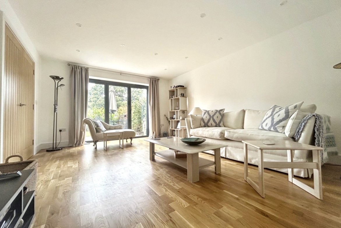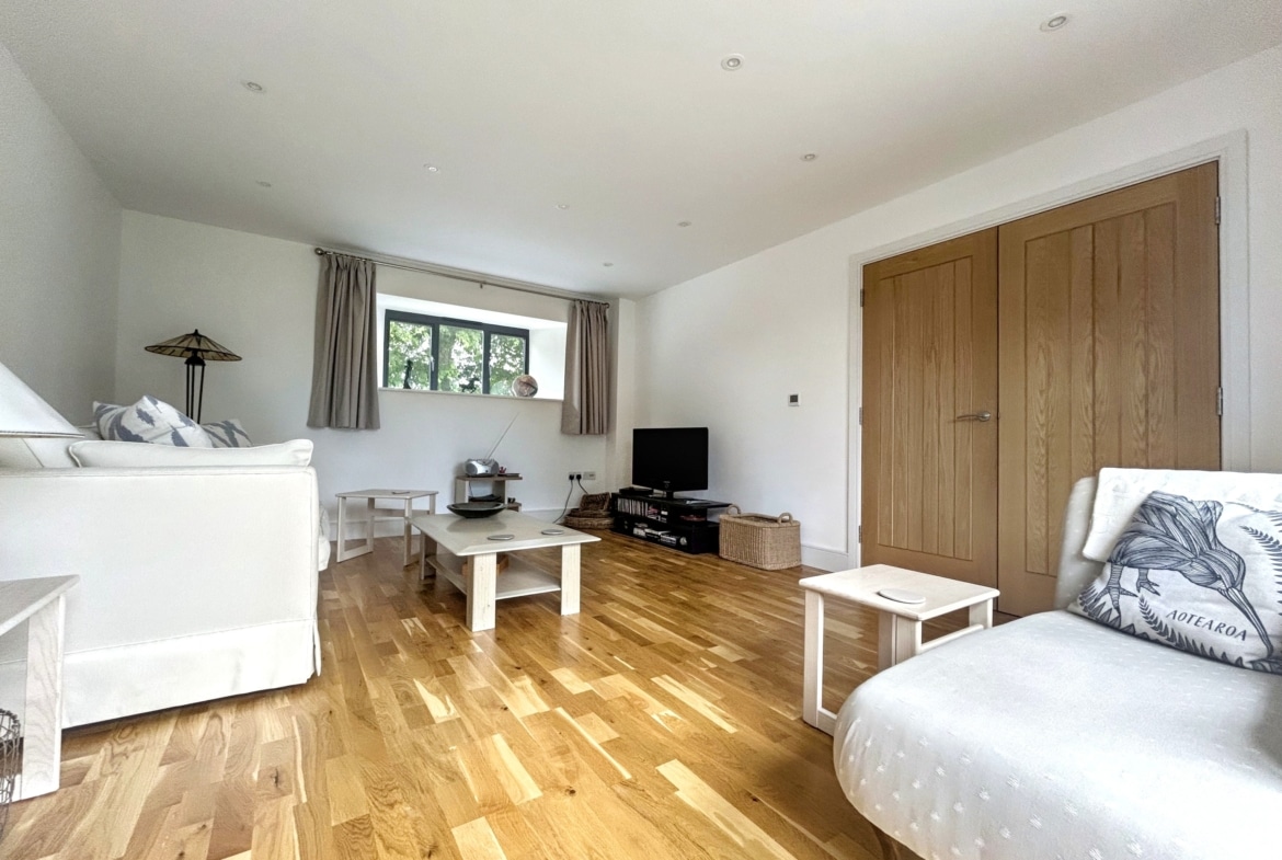 The sitting room, with its dual aspect and more bi-fold doors leading to the front terrace, is a warm and inviting space — ideal for curling up with a book, hosting friends, or simply soaking in the views.